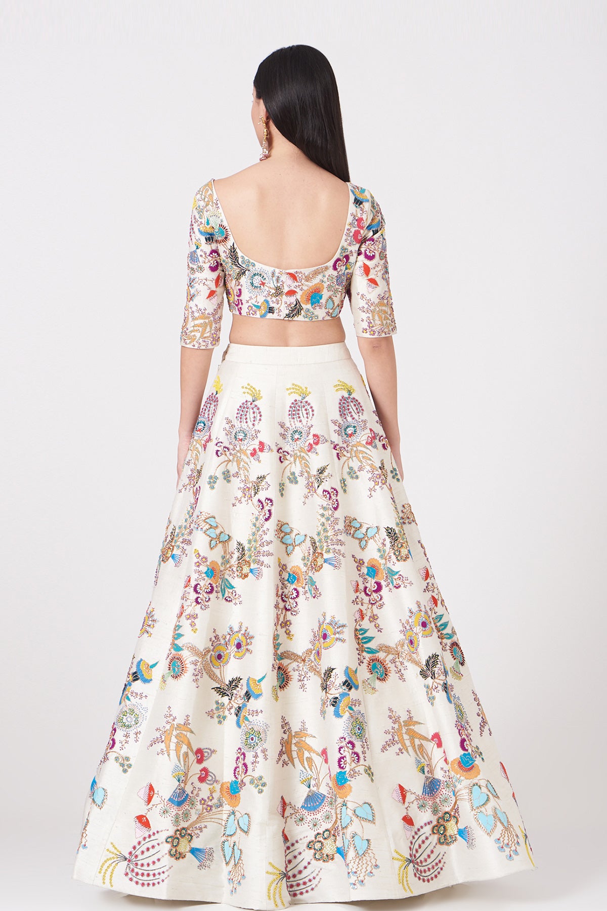 Ivory paper dolls raw silk appliquéd and embellished lehenga with blouse and cutwork dupatta