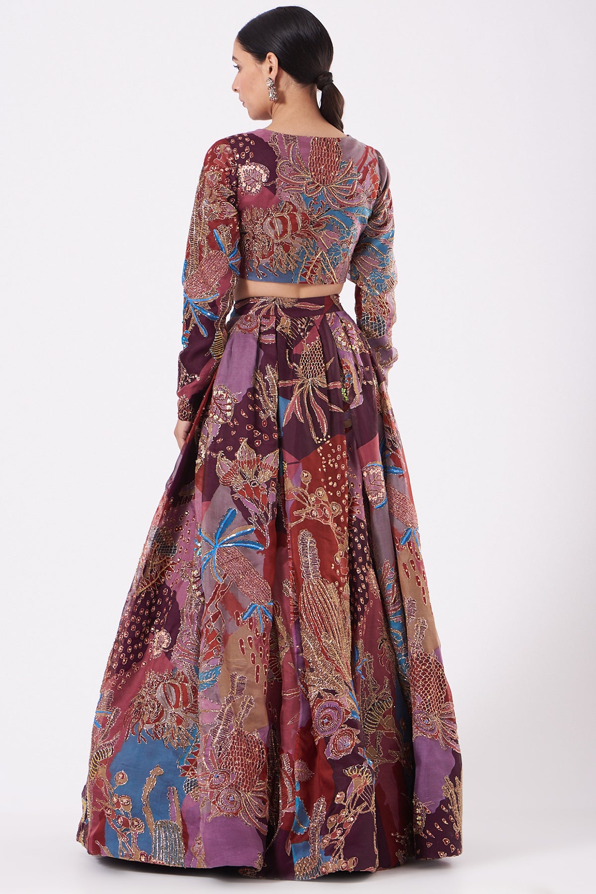 Plum pastiche organza printed and embellished top and skirt with scallop dupatta