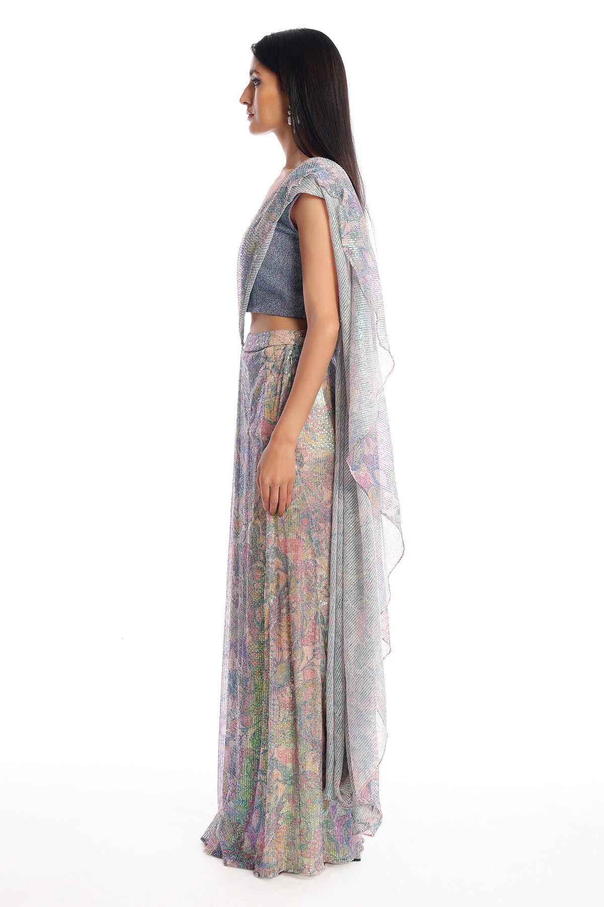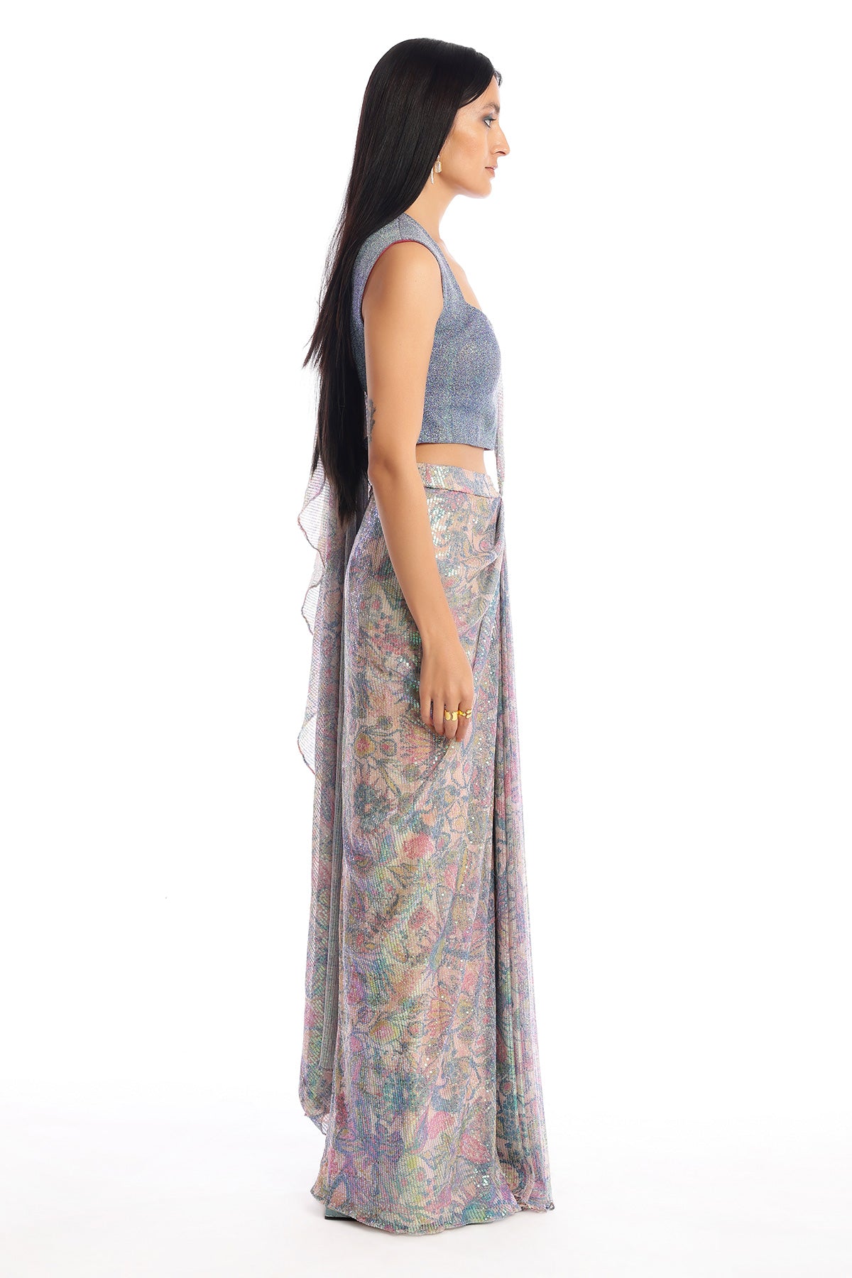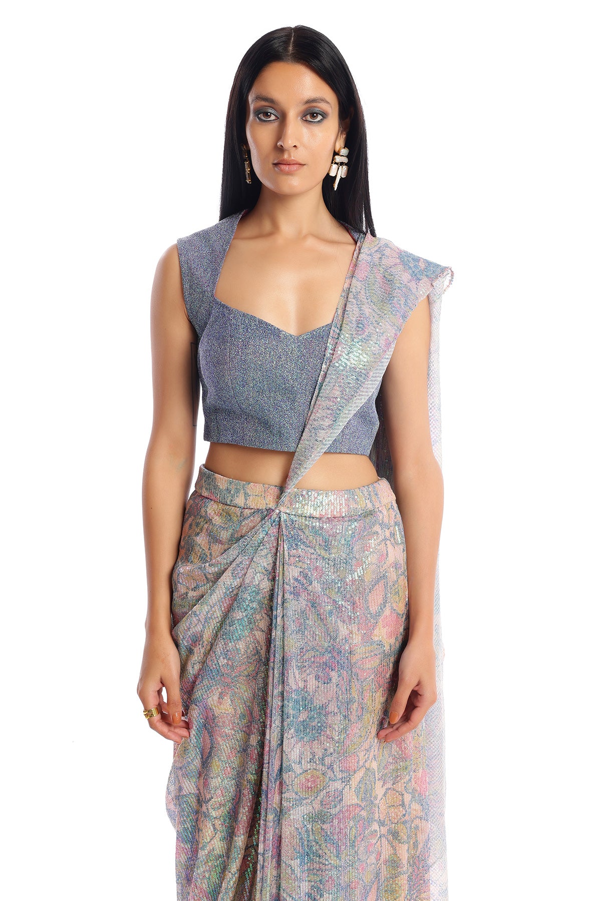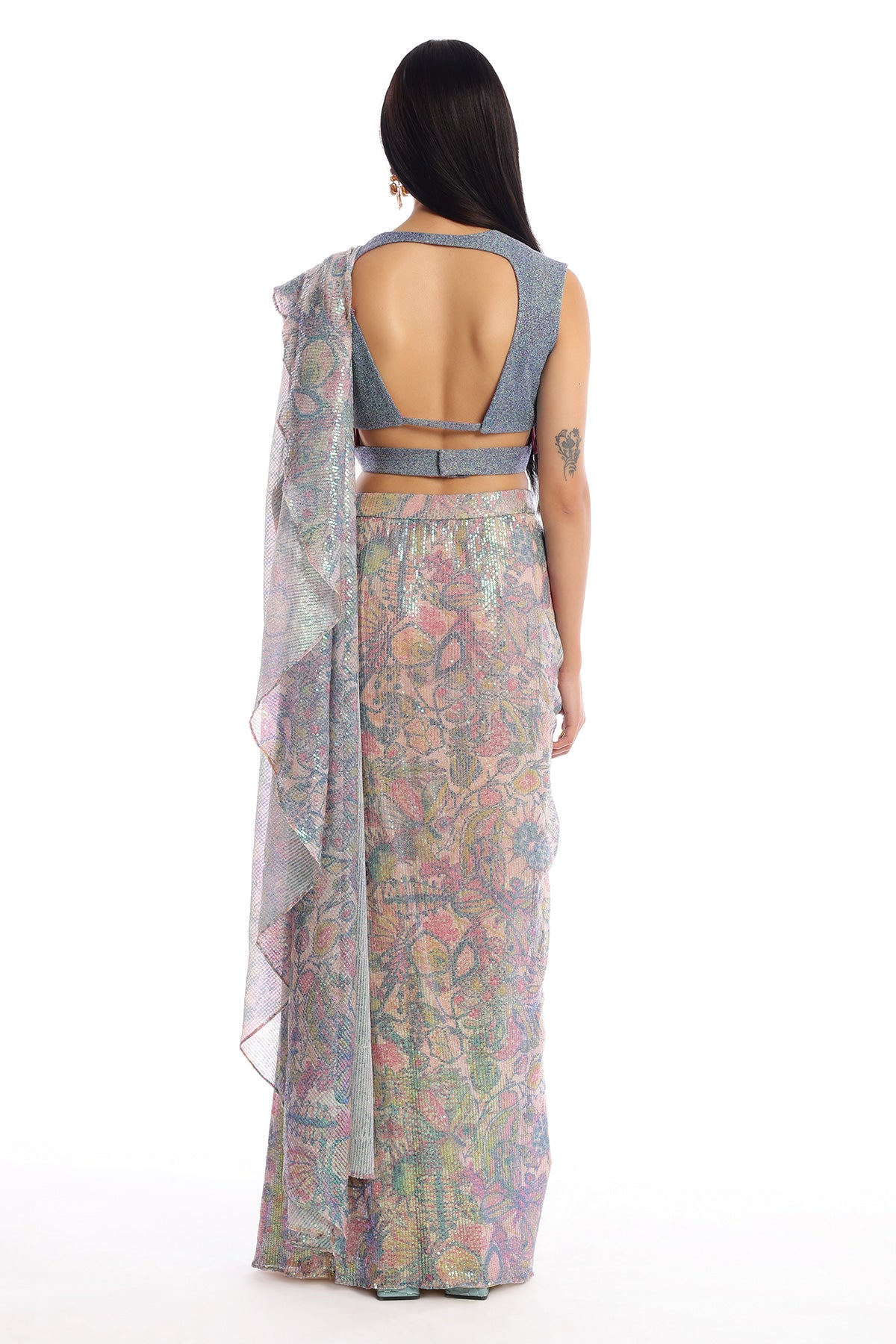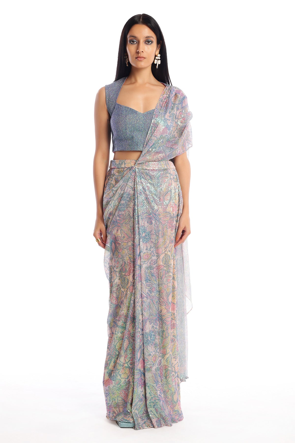 Kinfolk Multicolour printed sequine tulle pre-drapped saree with attached texture  princess cut bodice