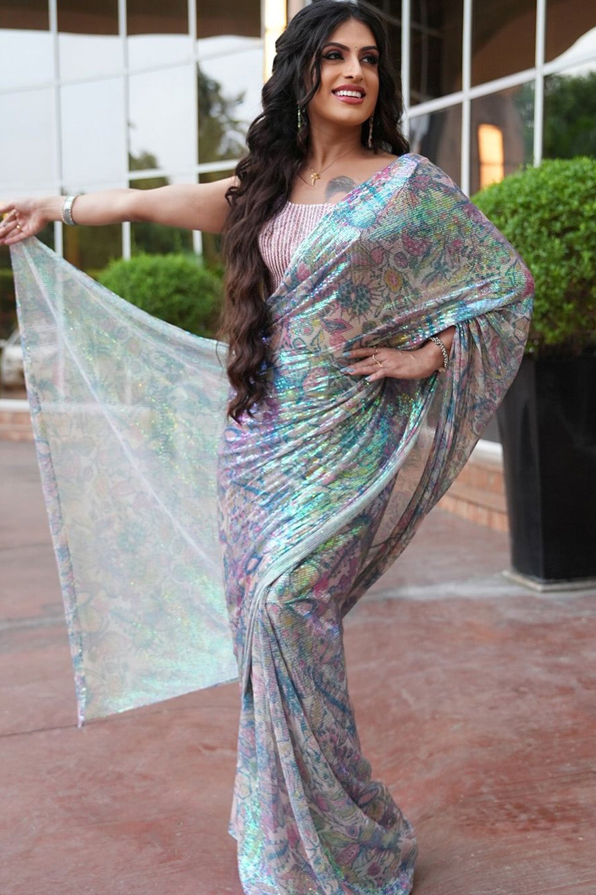 Gleamora - multicolour sequin tulle pre-drapped saree