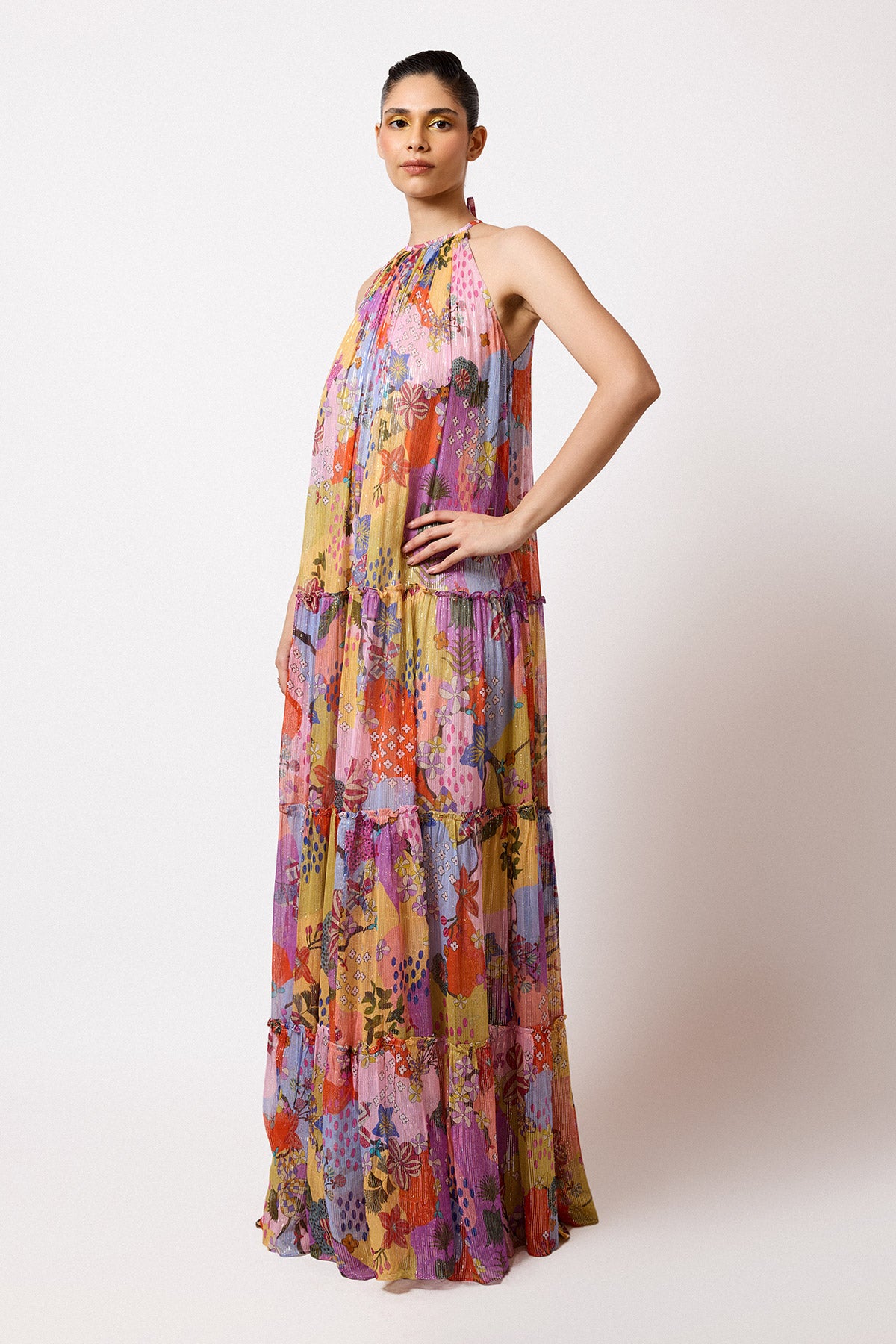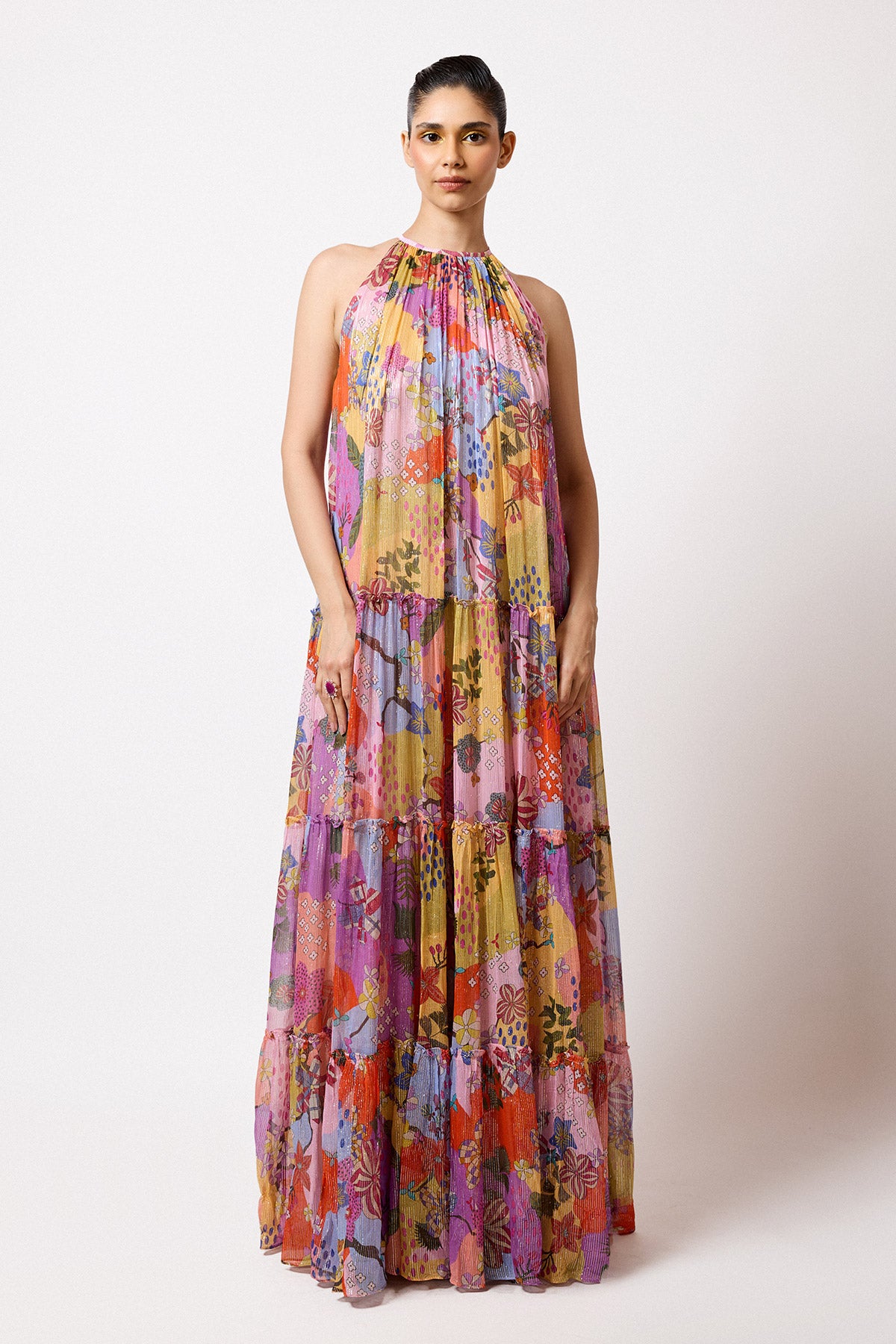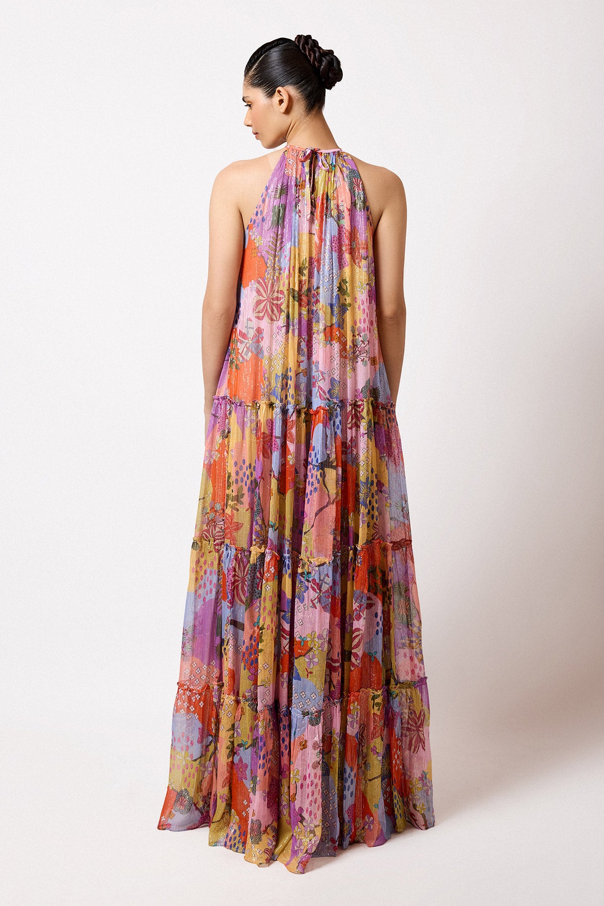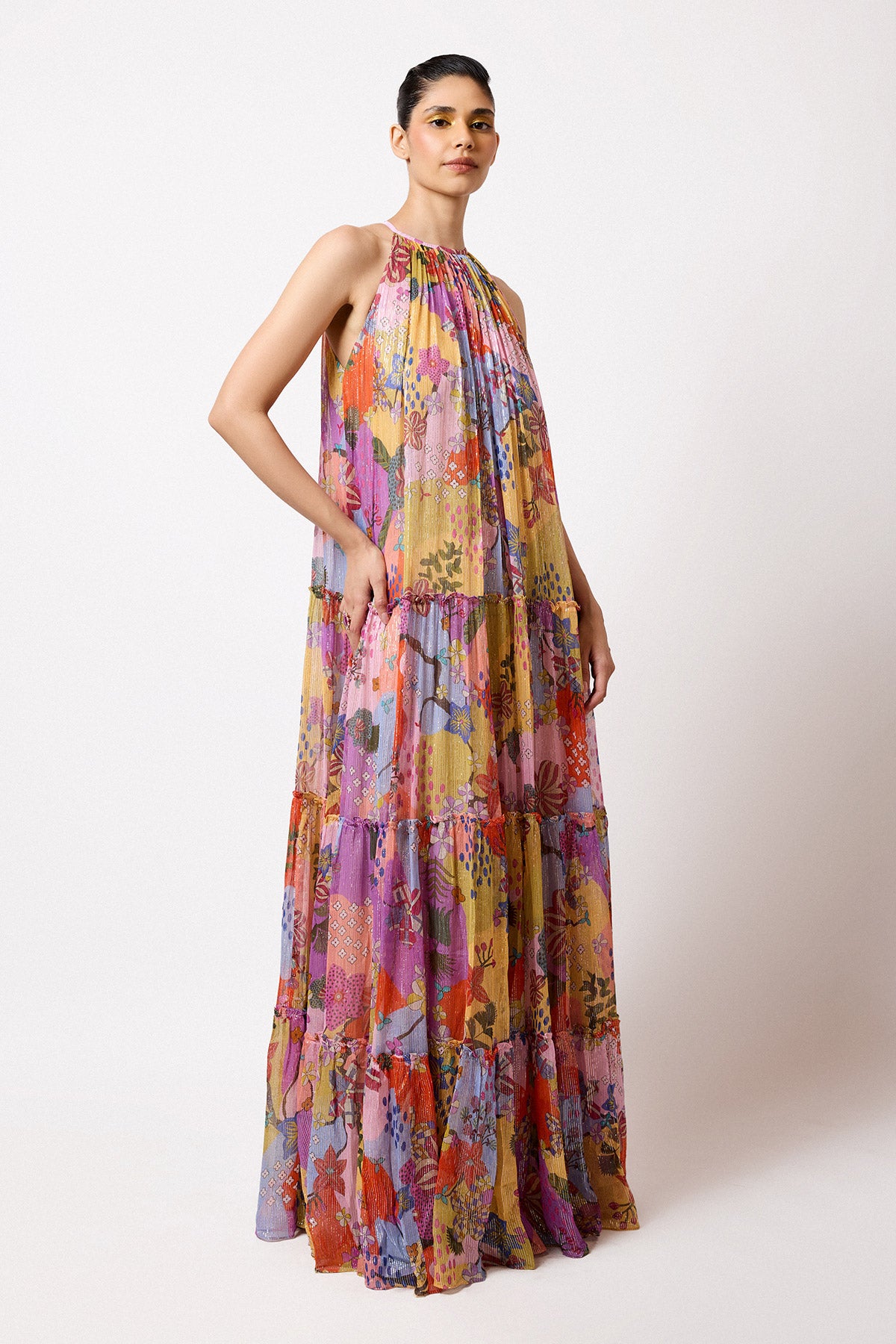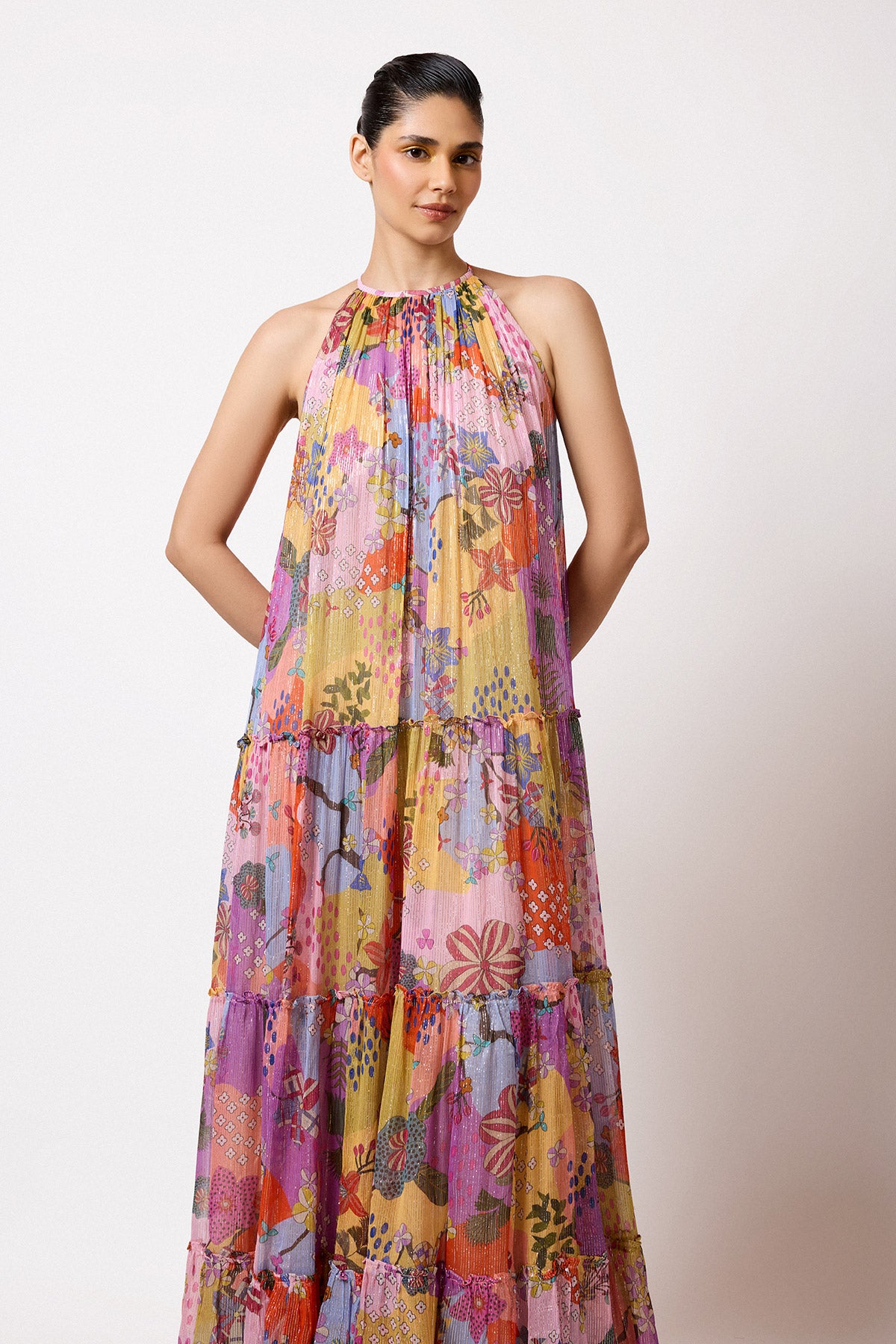 Matilda Multicolour Printed Lurex Haulter Gathered Gown.