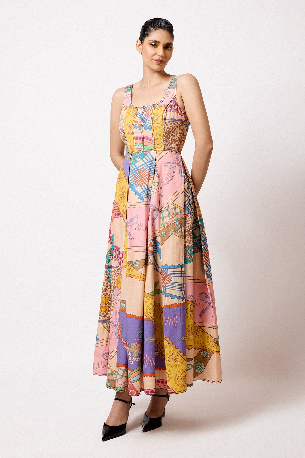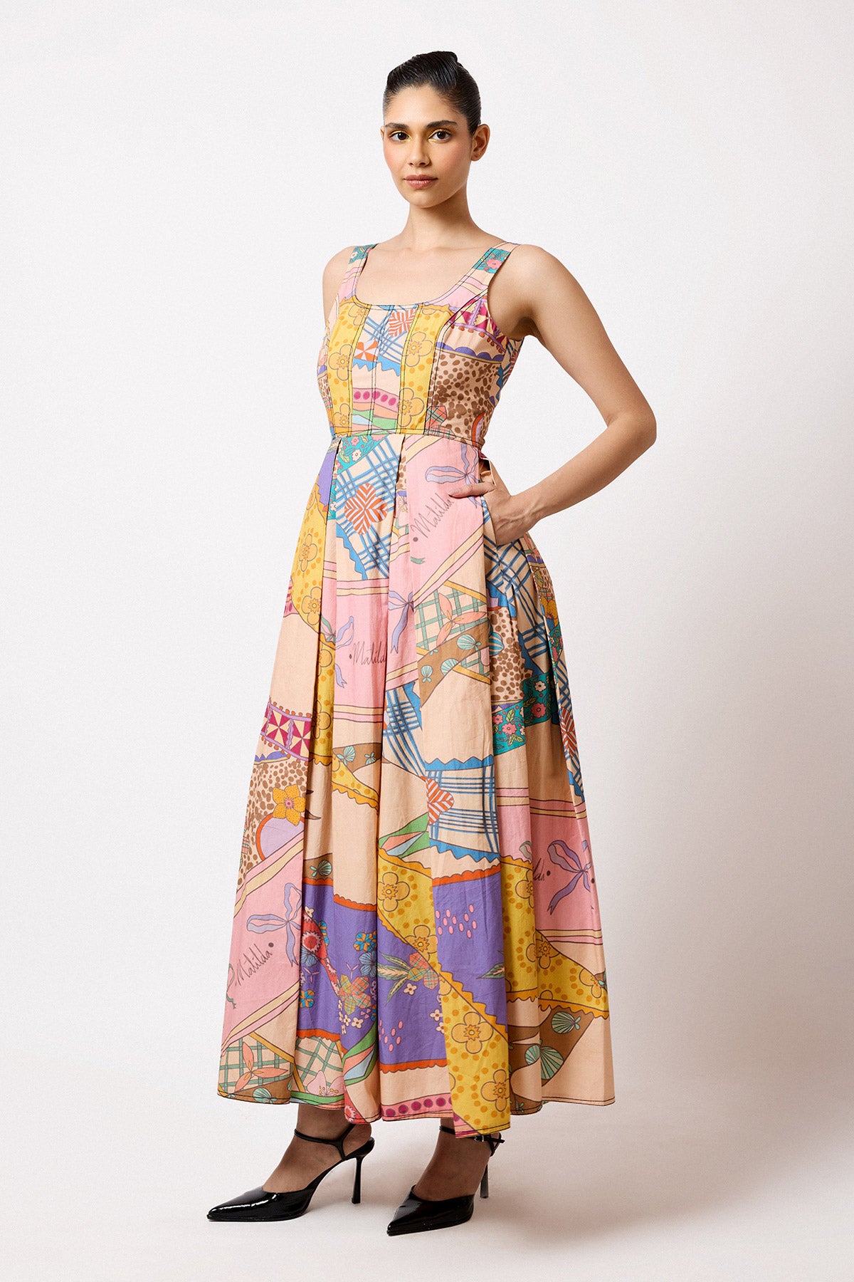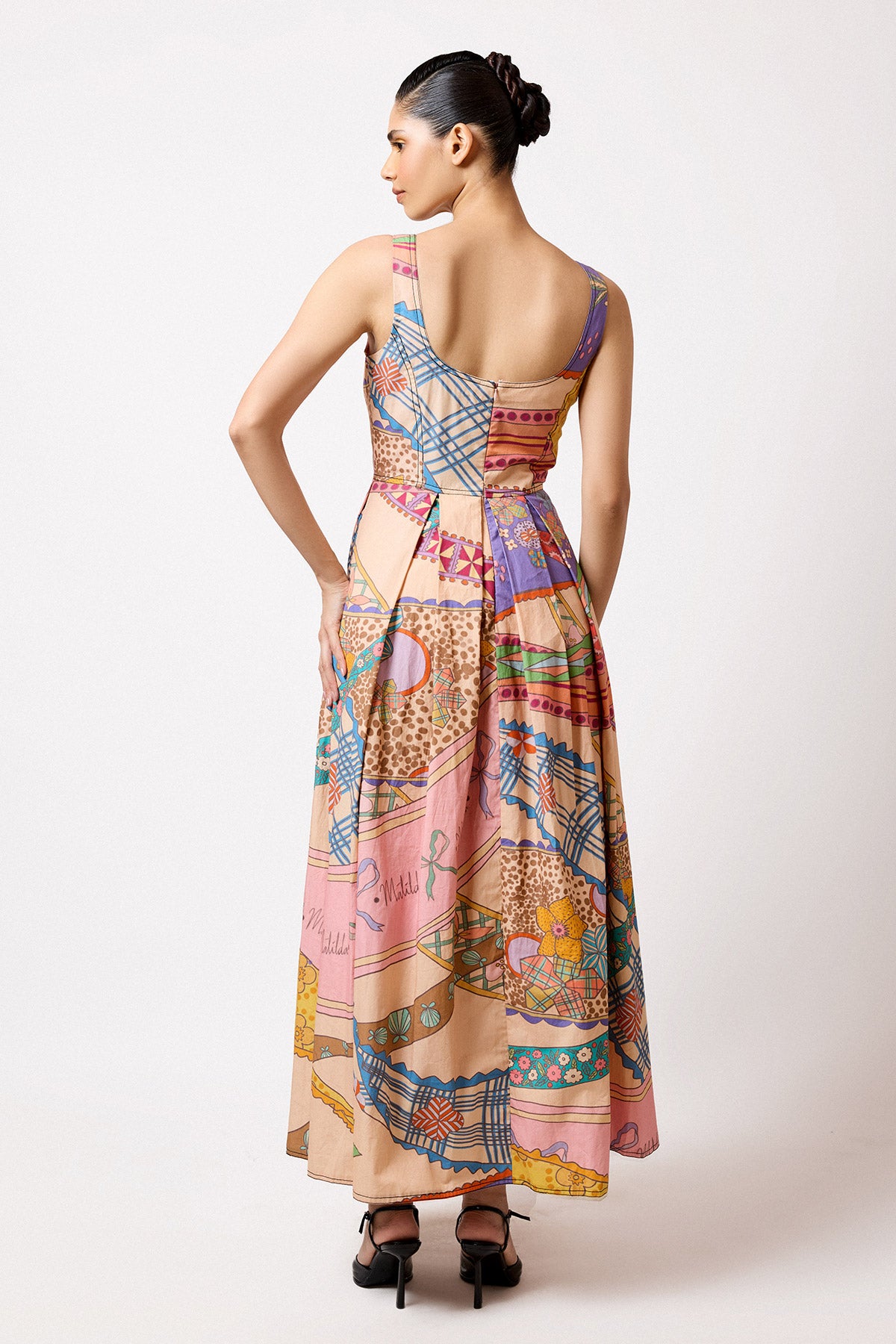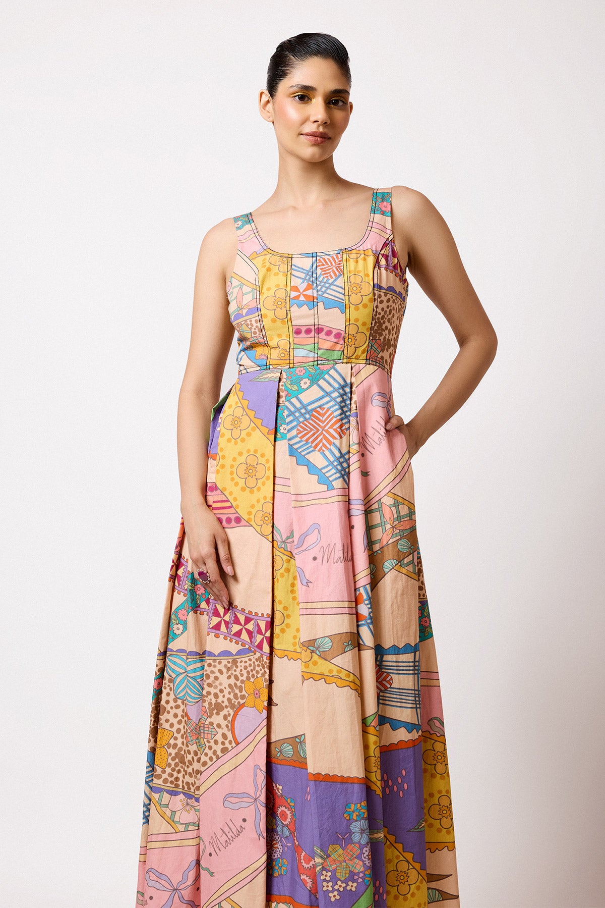Matilda Multicolour Printed Poplin Inverted Box Pleated Sleeveless Dress