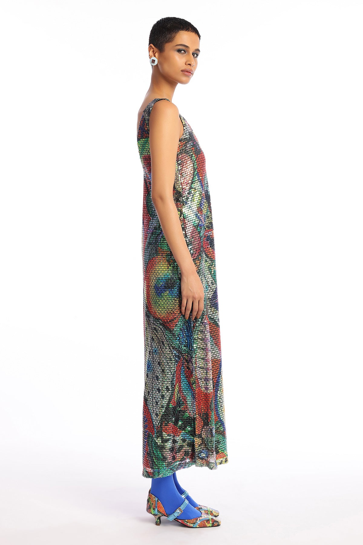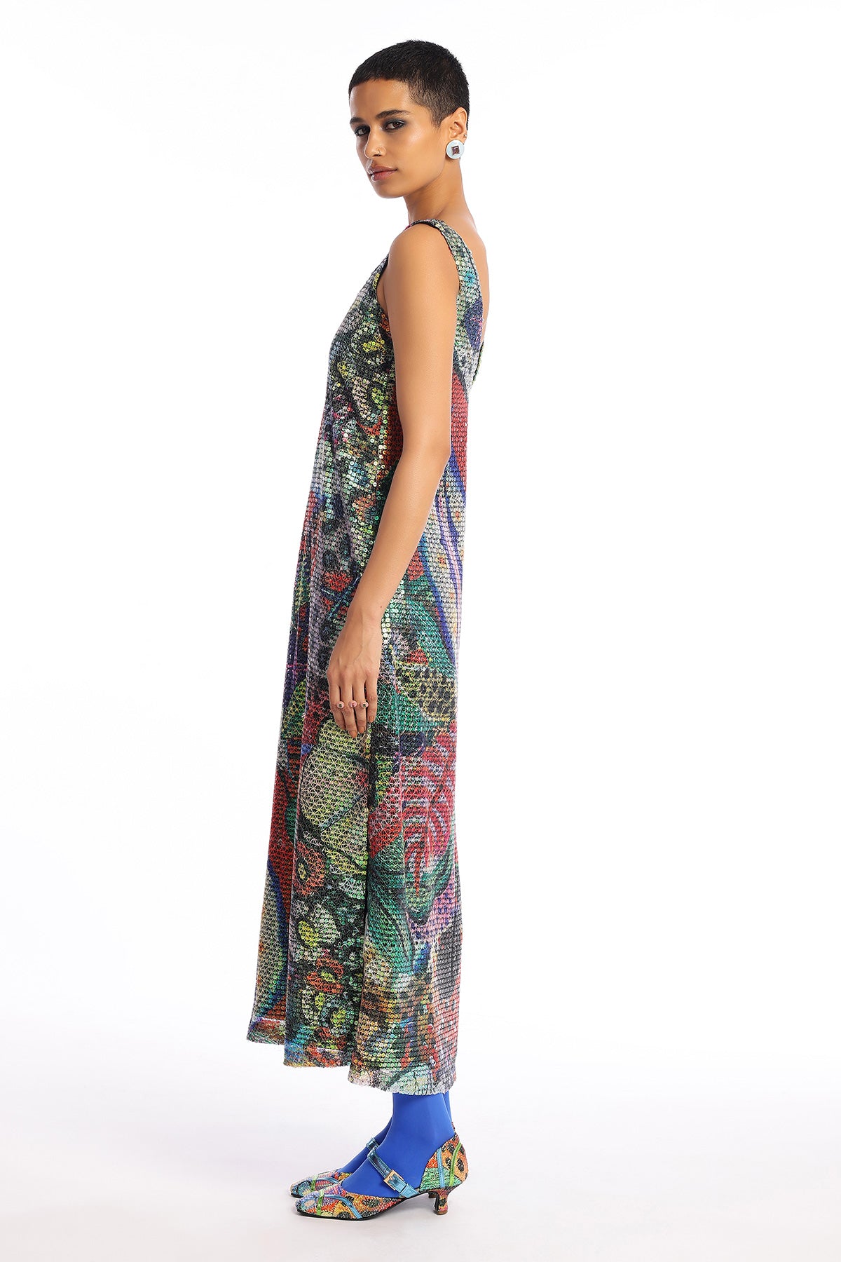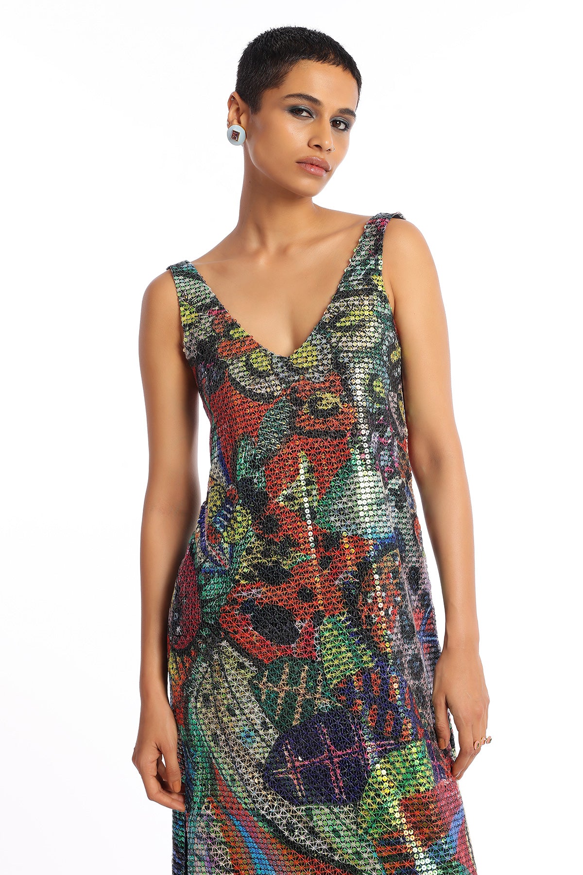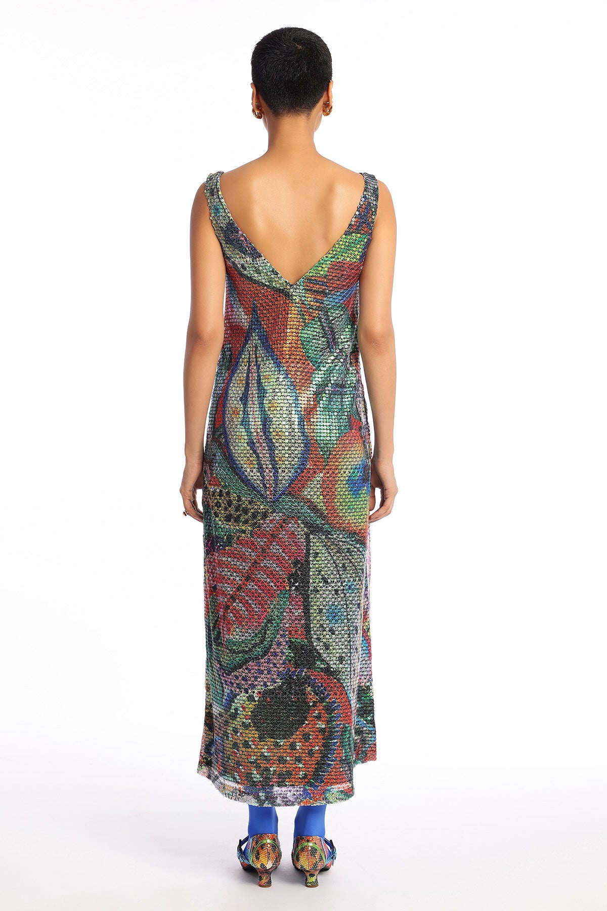 Kinfolk barn red printed sequin tulle v neckline ankle length dress