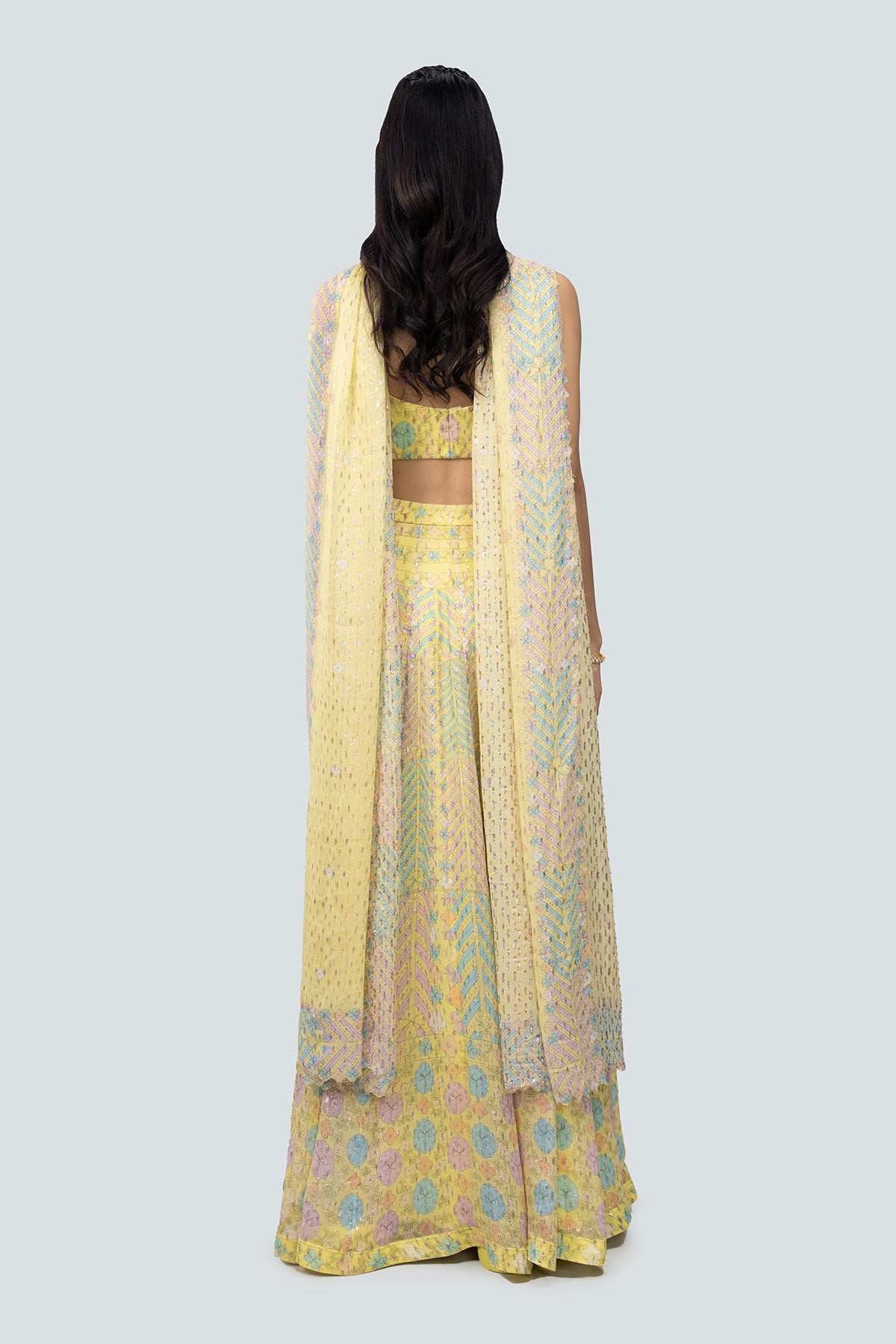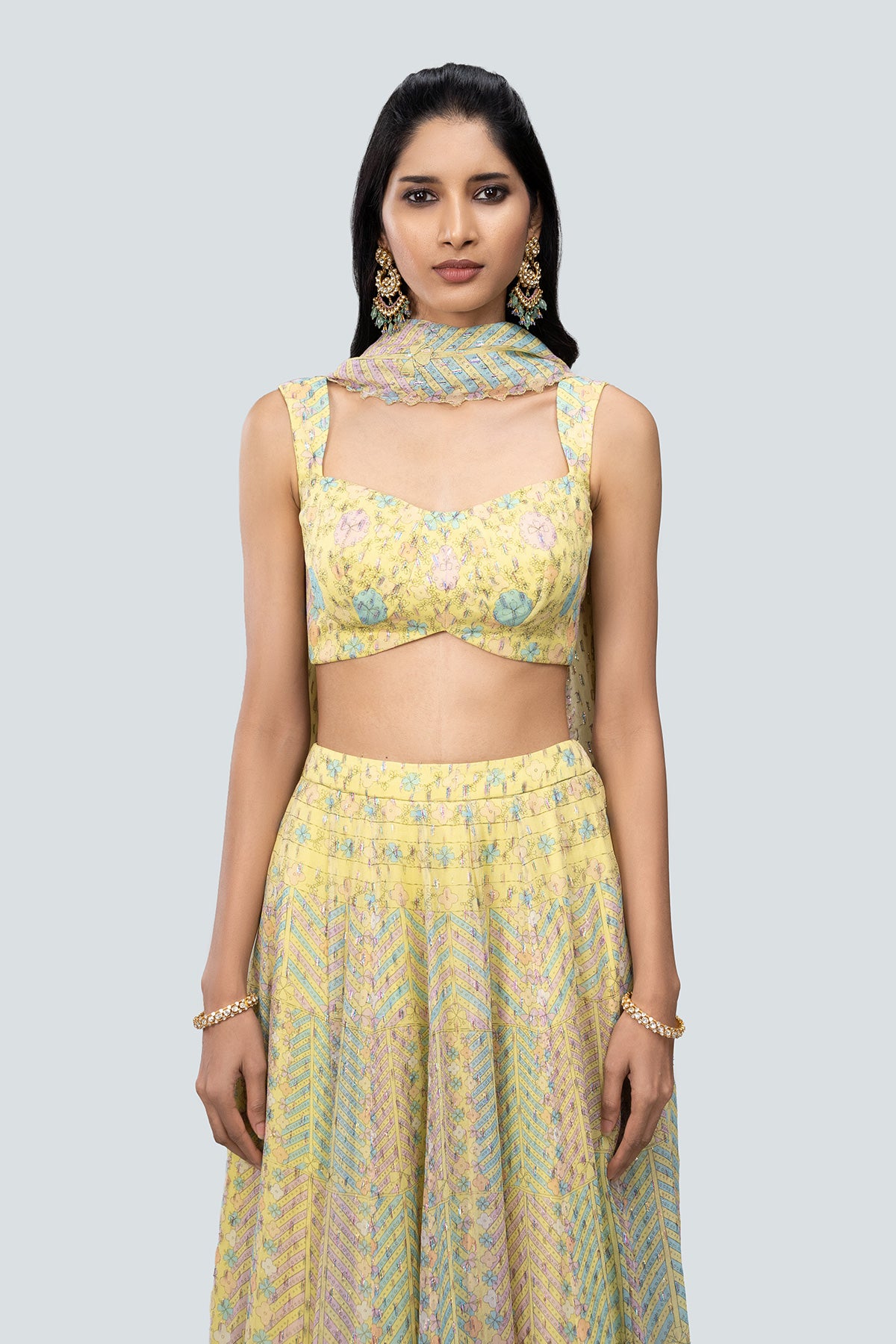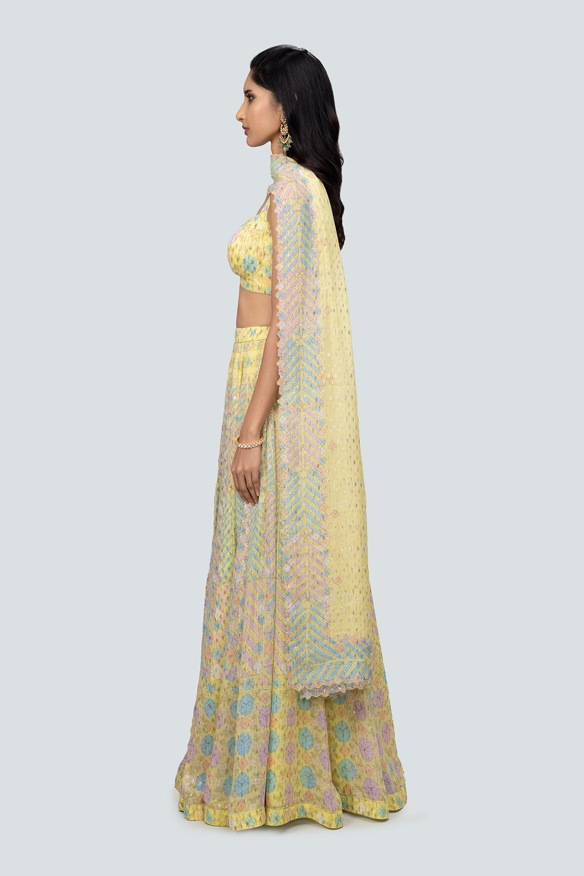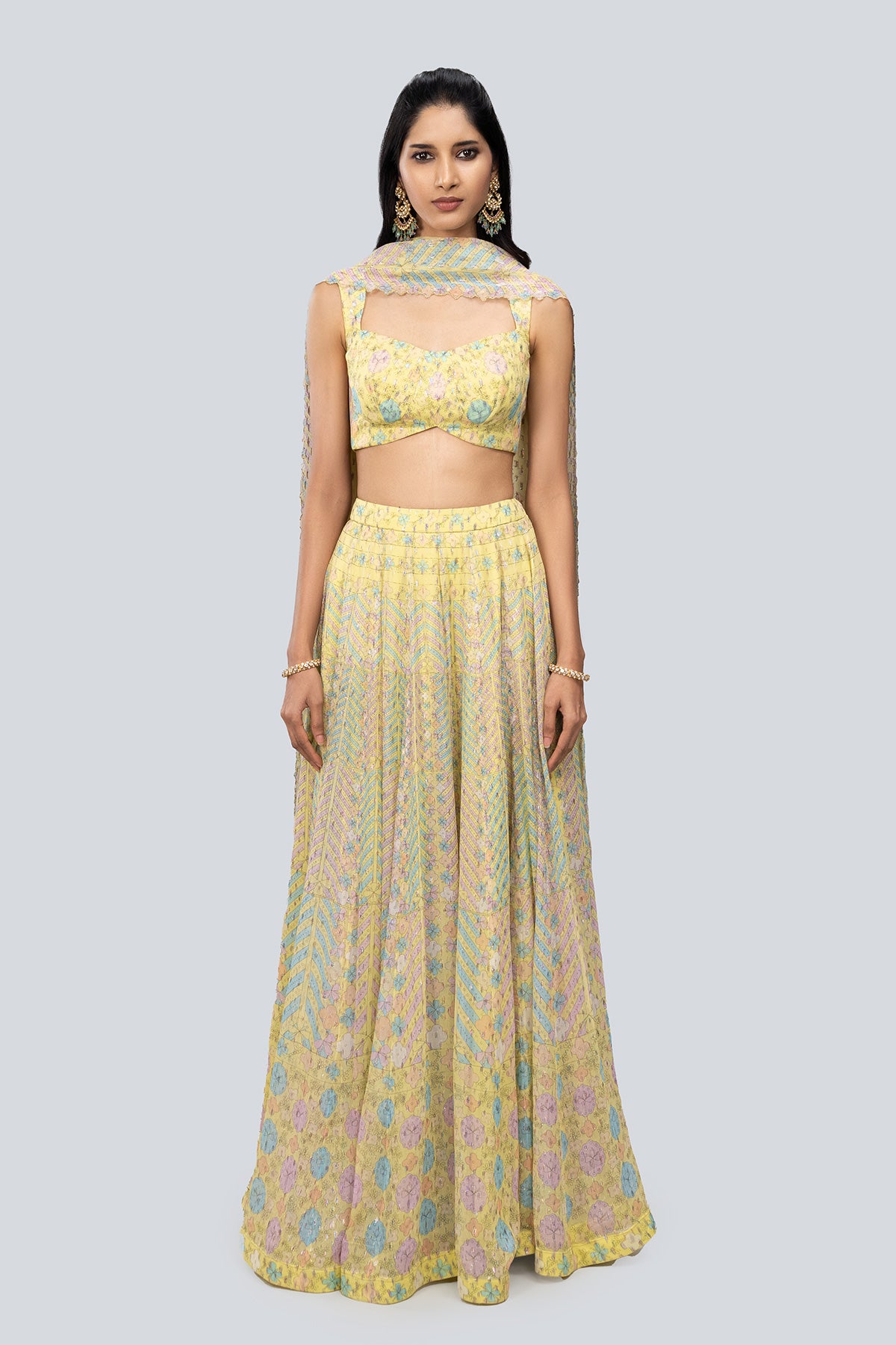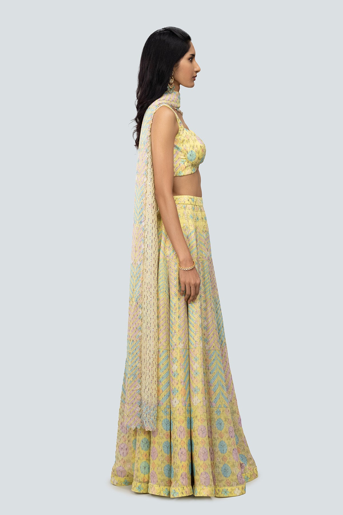 Front view of Maize printed viscose-georgette dobby lehenga set