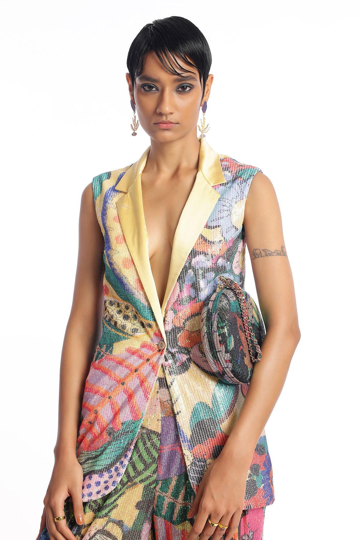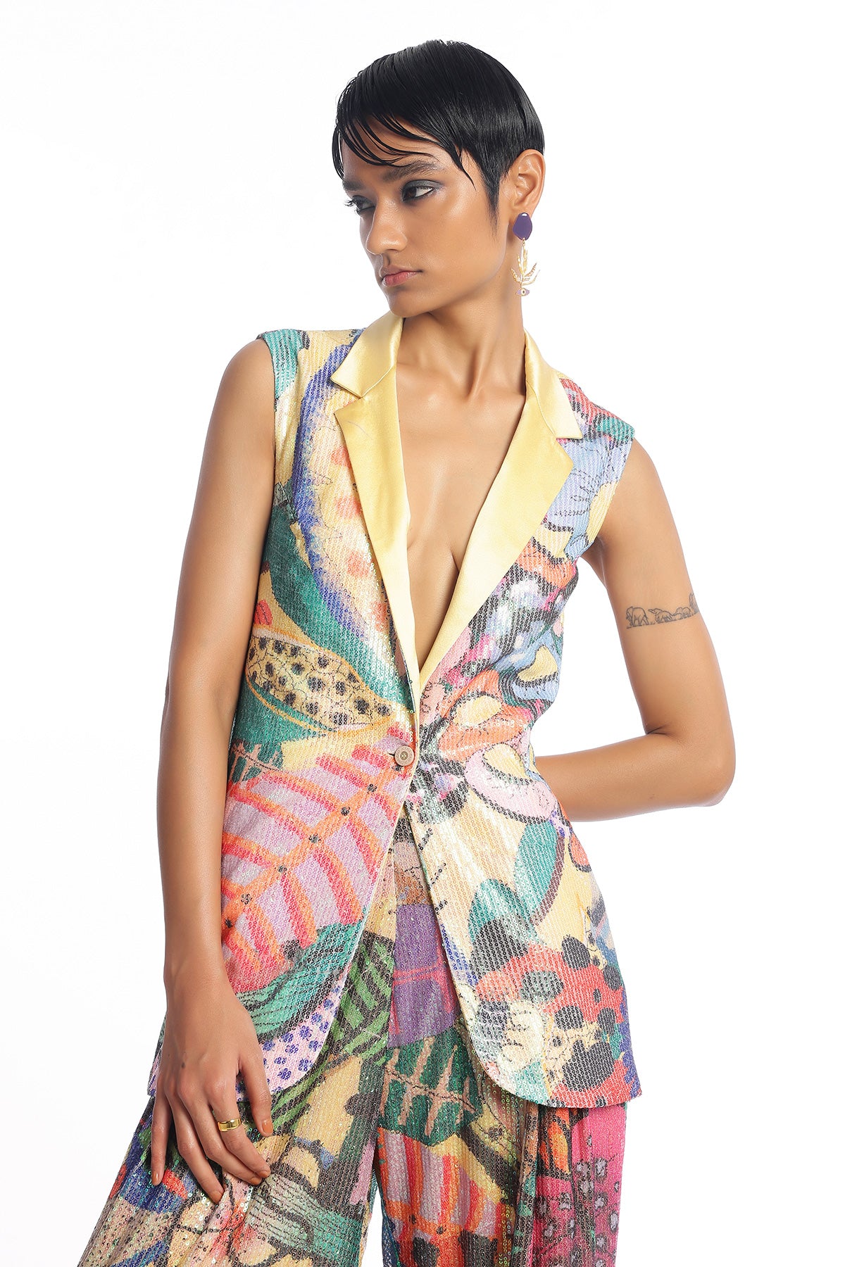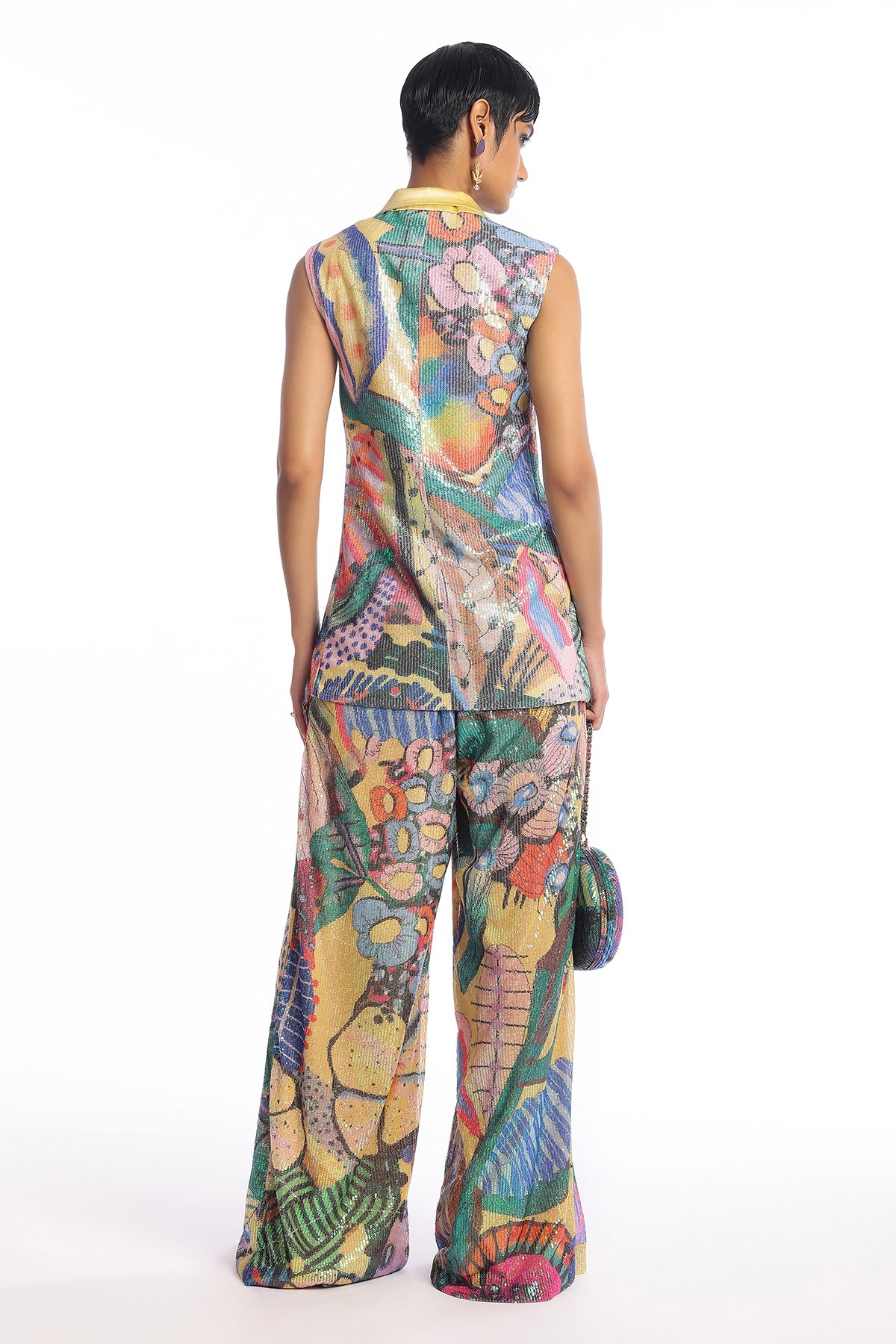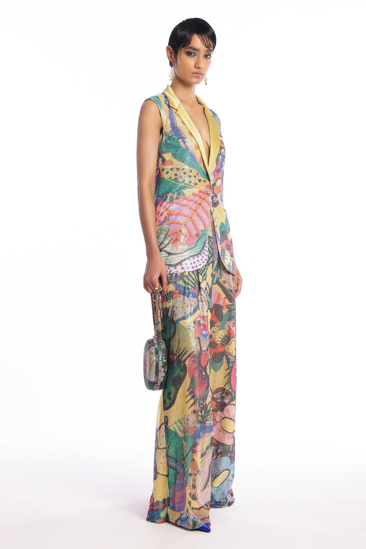 Kinfolk multicolor printed sequin tulle with contrast lapel pantsuit