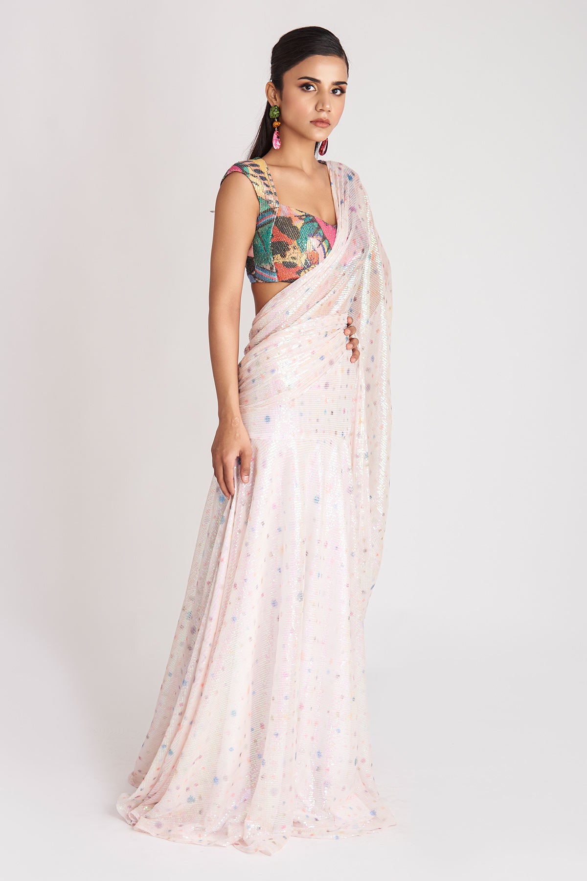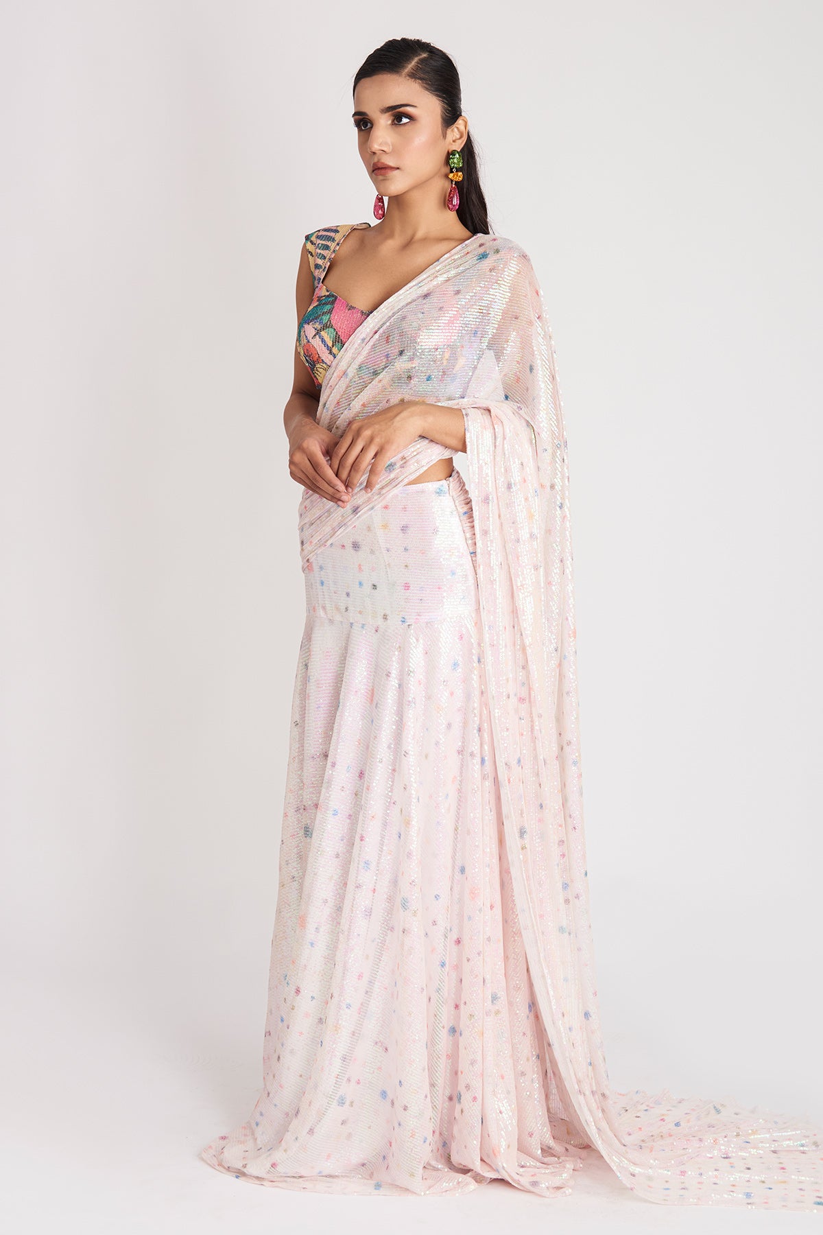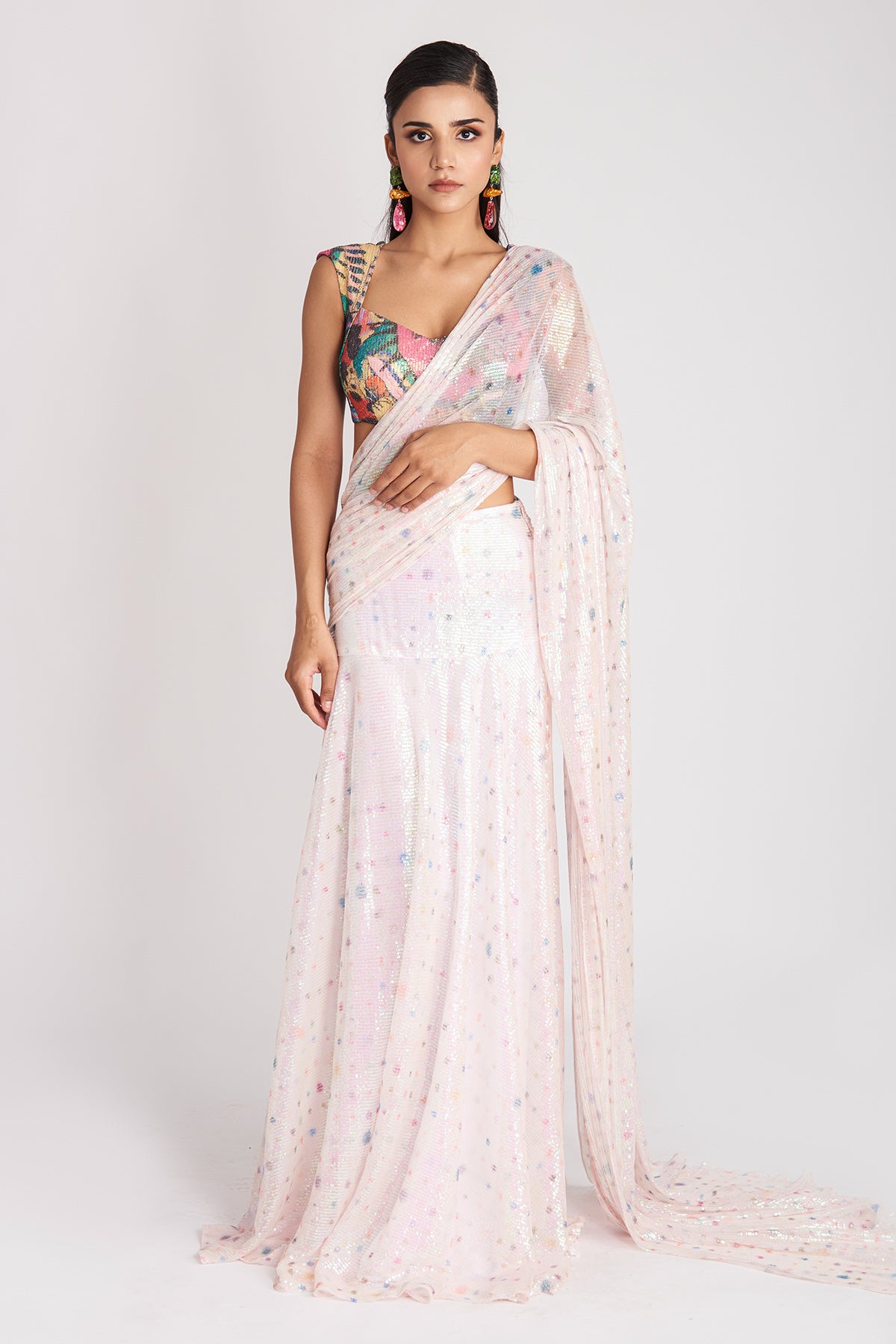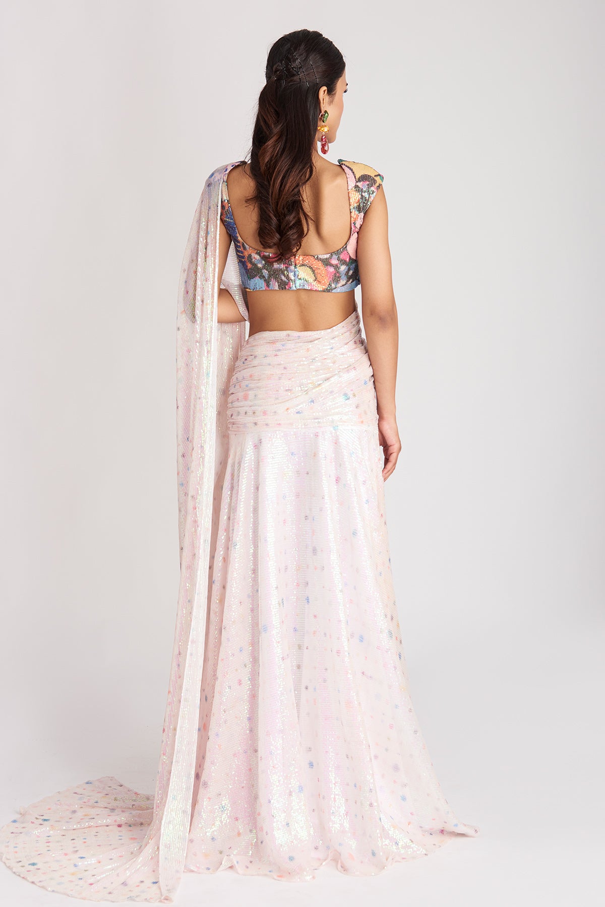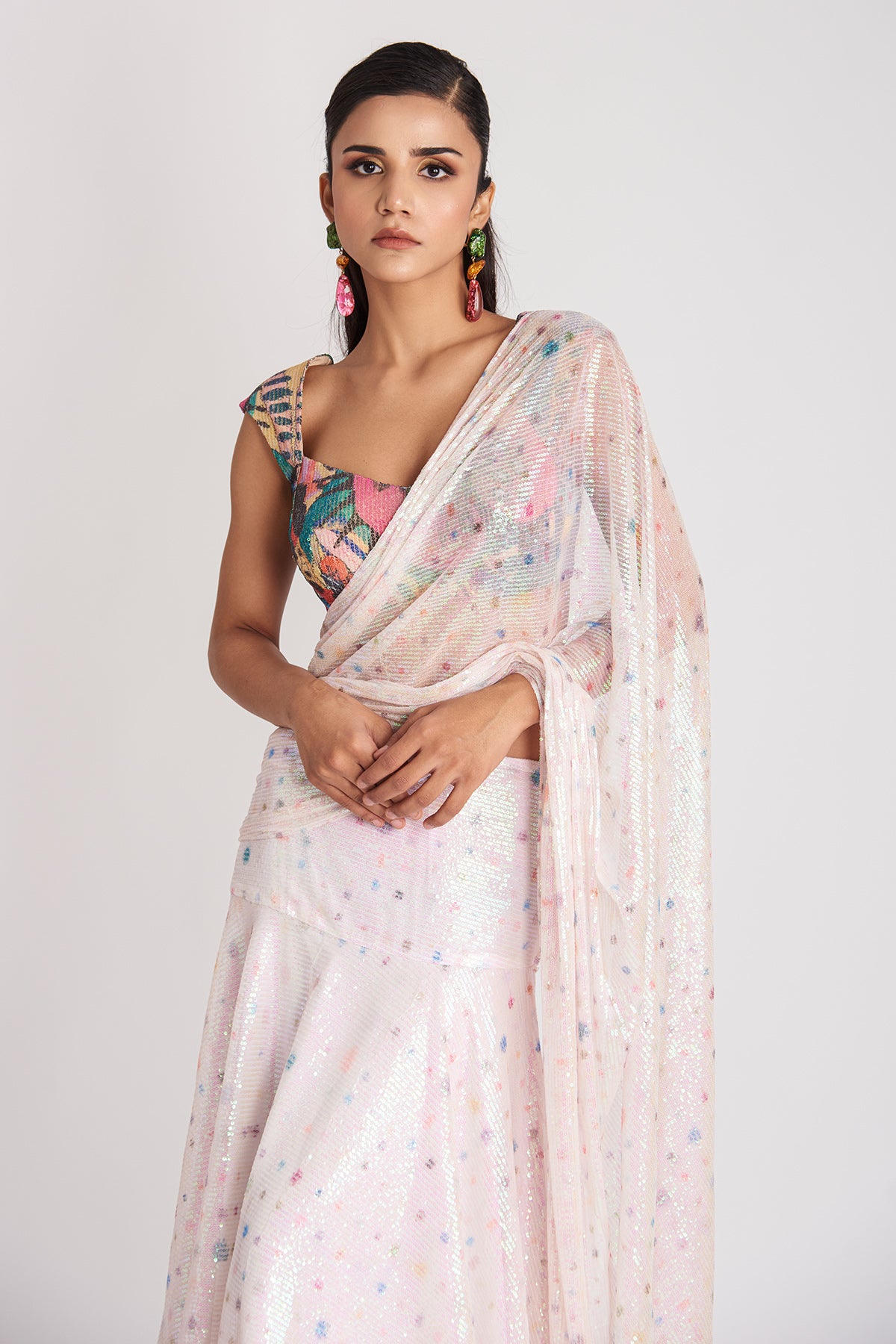 Kinfolk ivory printed sequin tulle pre-draped saree with multicolor blouse