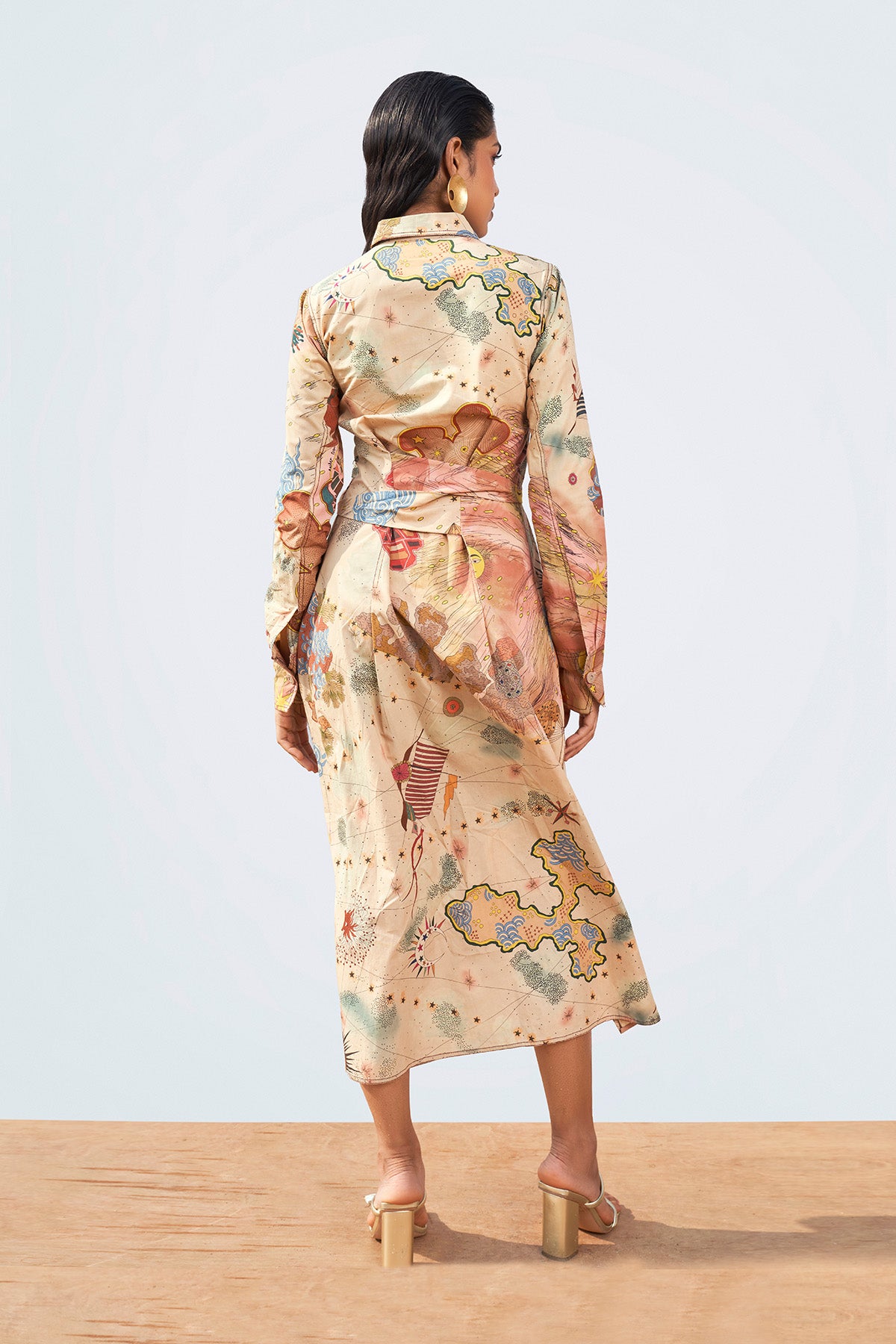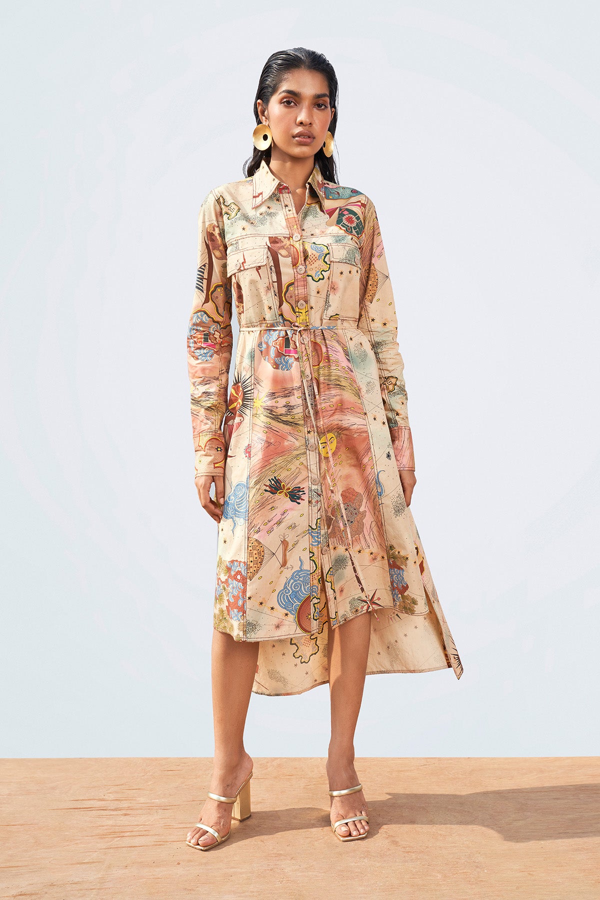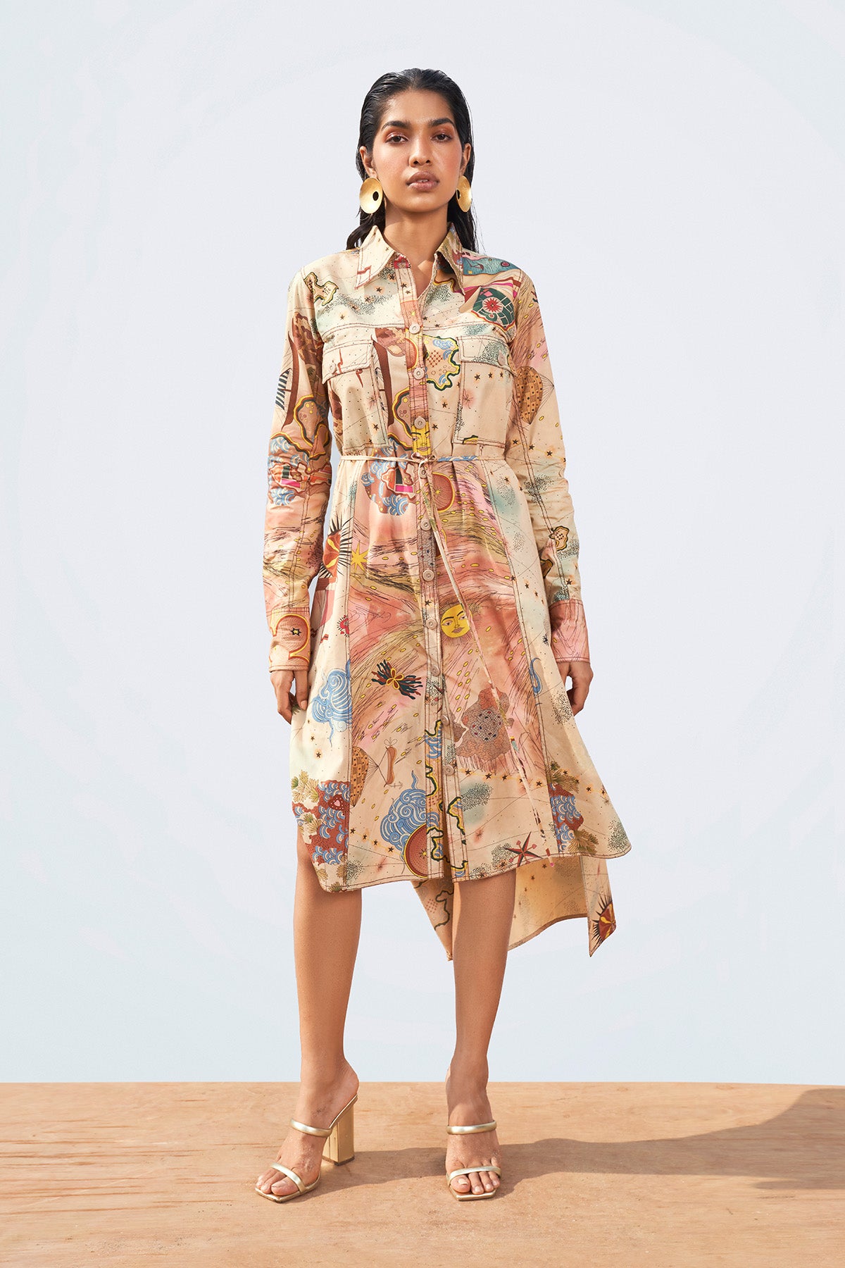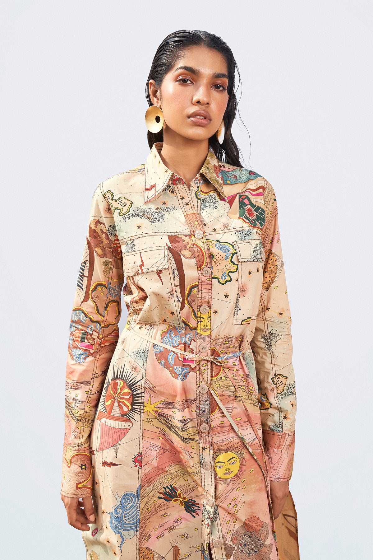 Peach Starboard & Port pleated shirt dress with long sleeves. Matching belt and front flaps detail.