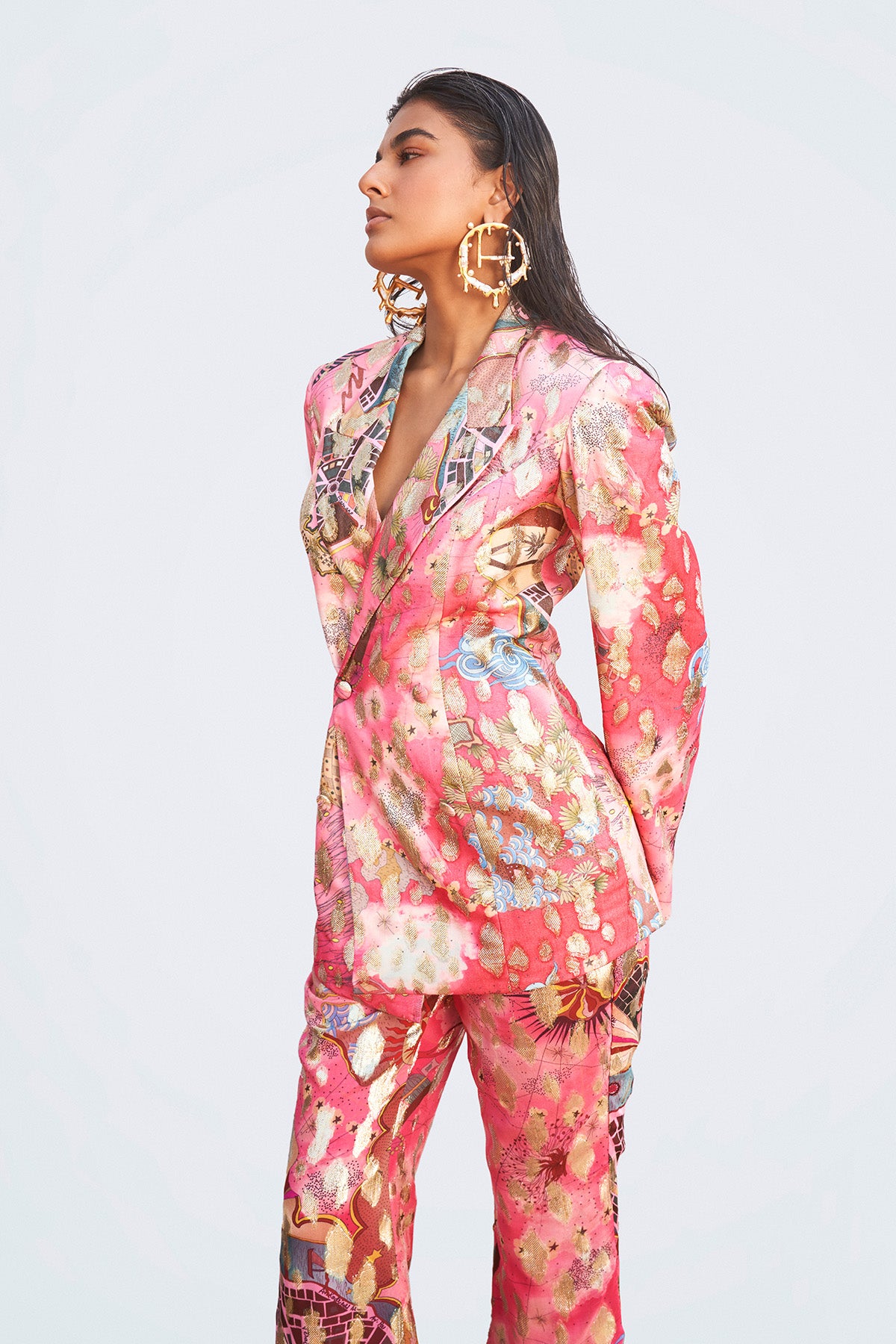 Starboard & Port print tailored double breasted blazer and high waist trousers with side pockets.