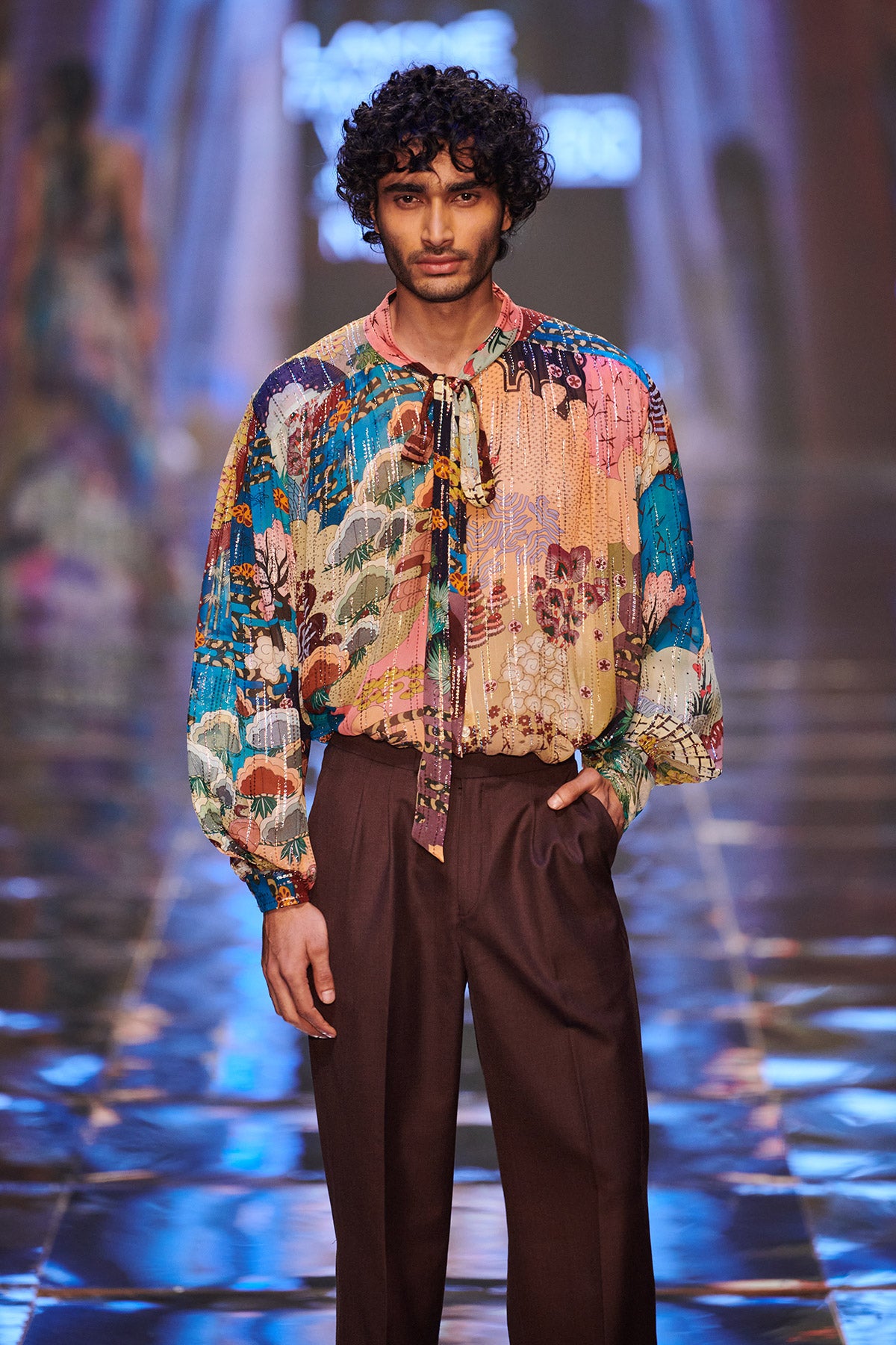 Our Trencadís maze shirt with gathered detailing and lavallière bow.