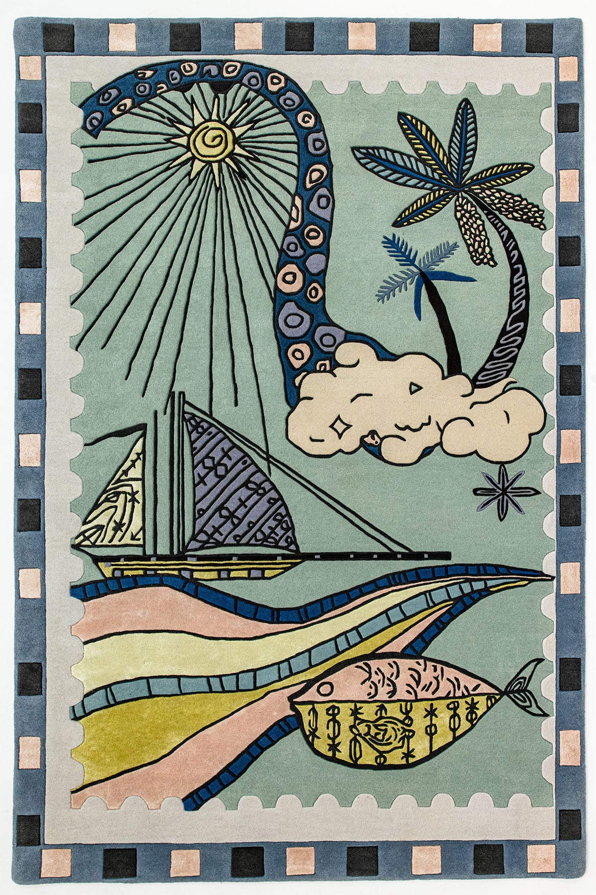 This rug recreates the inspirations behind our collection ‘Starboard and Port’ while mimicking the kaleidoscopic blend of aquatic patterns and symbols found near the sea. Made for modern spaces, the piece is illustrated with a ship, tropical plants, and a fish is infused with the spirit of Goan susegad with hypersaturated dyes to achieve its vivid colors. Designed like a vintage stamp, it aims to capture the complexities of our memories that can be equal parts playful and poignant.