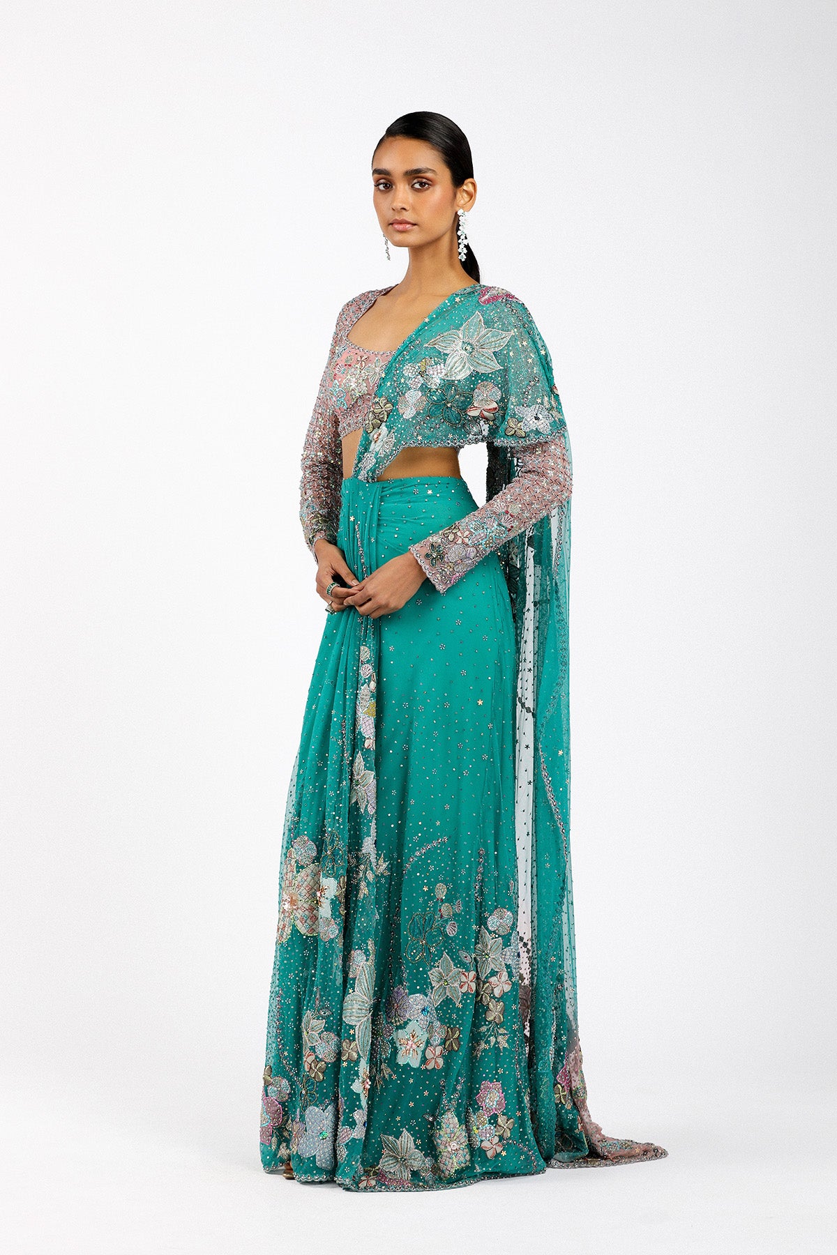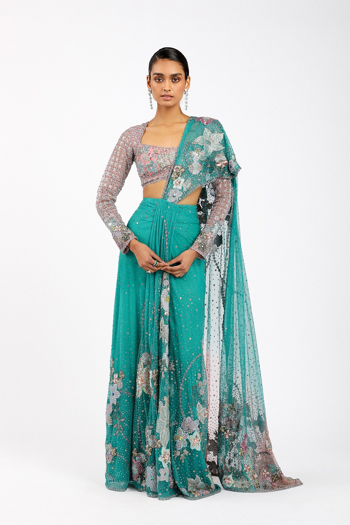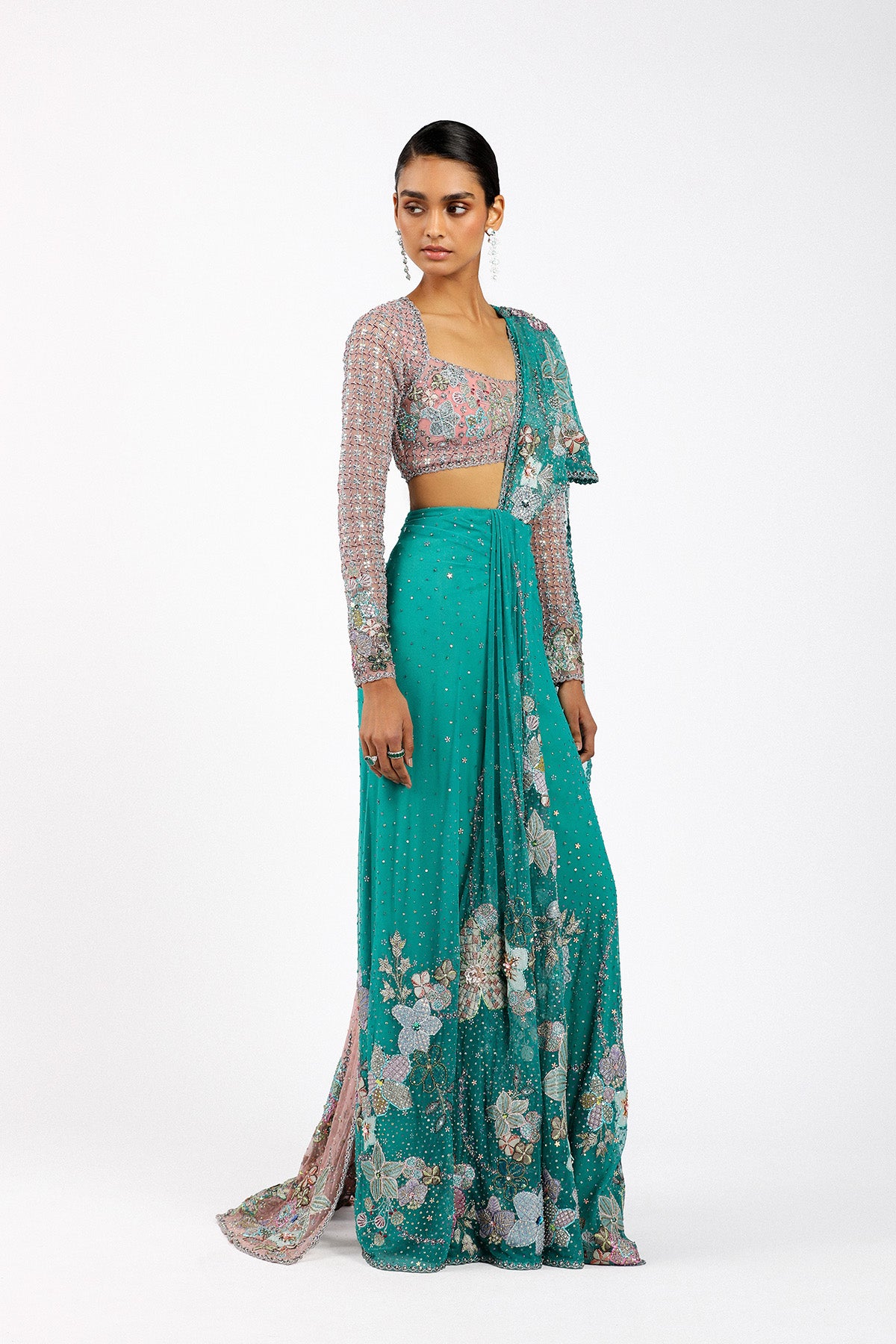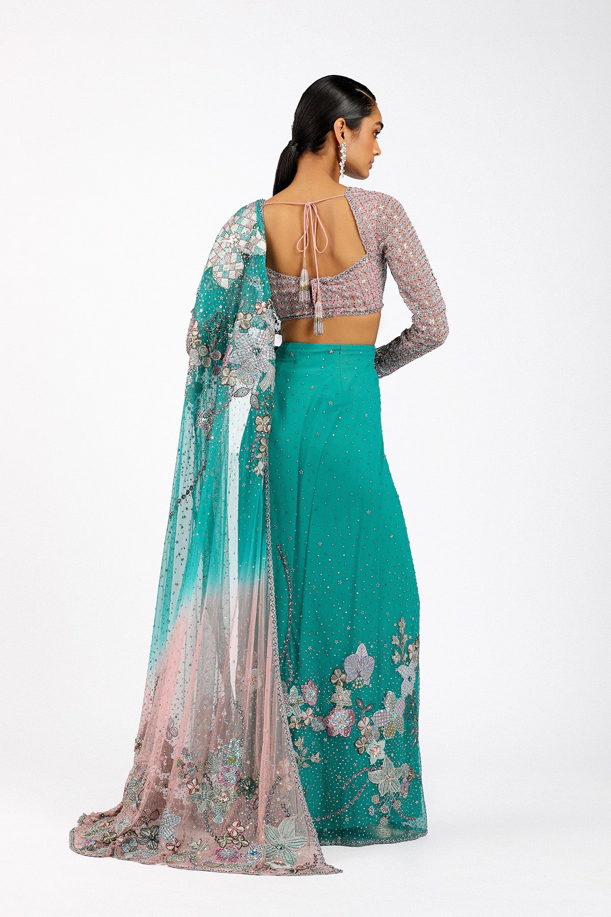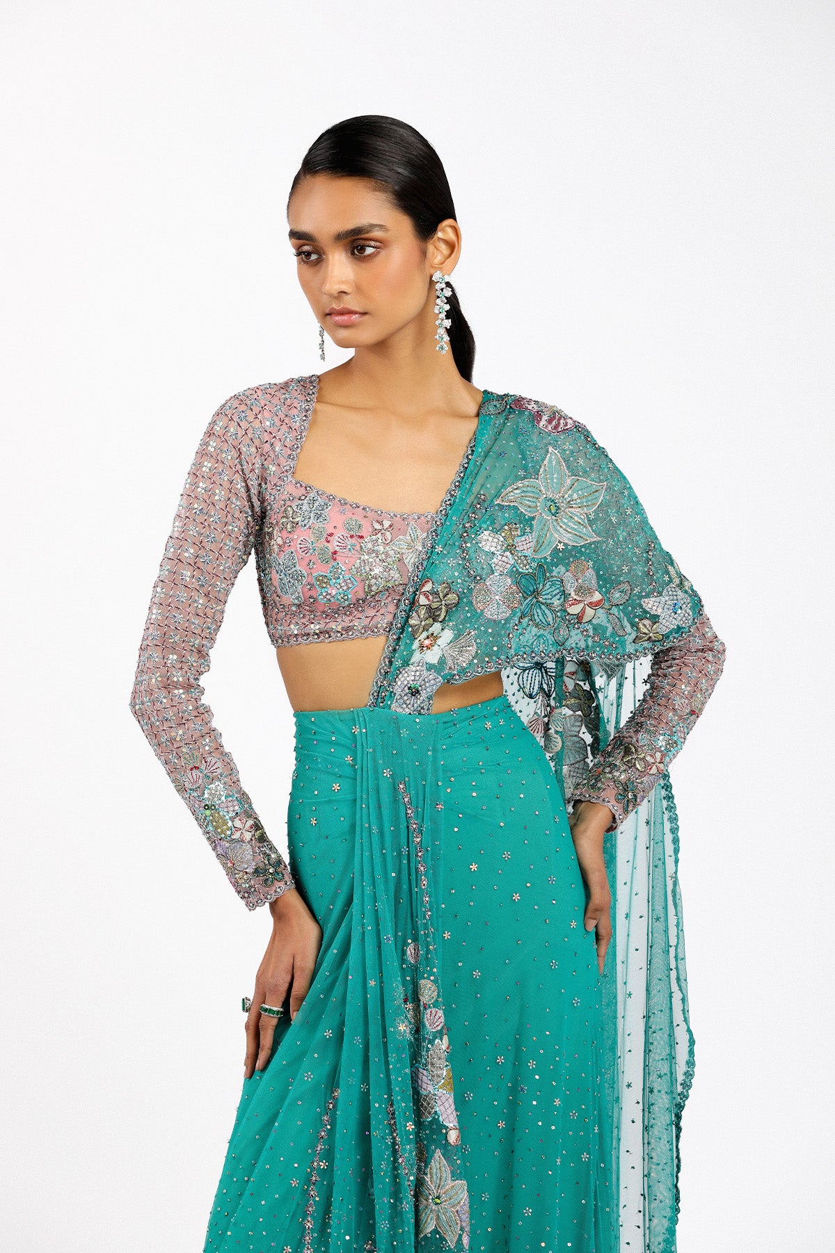Matilda Turq- pink applique embellished tulle pre-draped saree with pink full-sleeve blouse