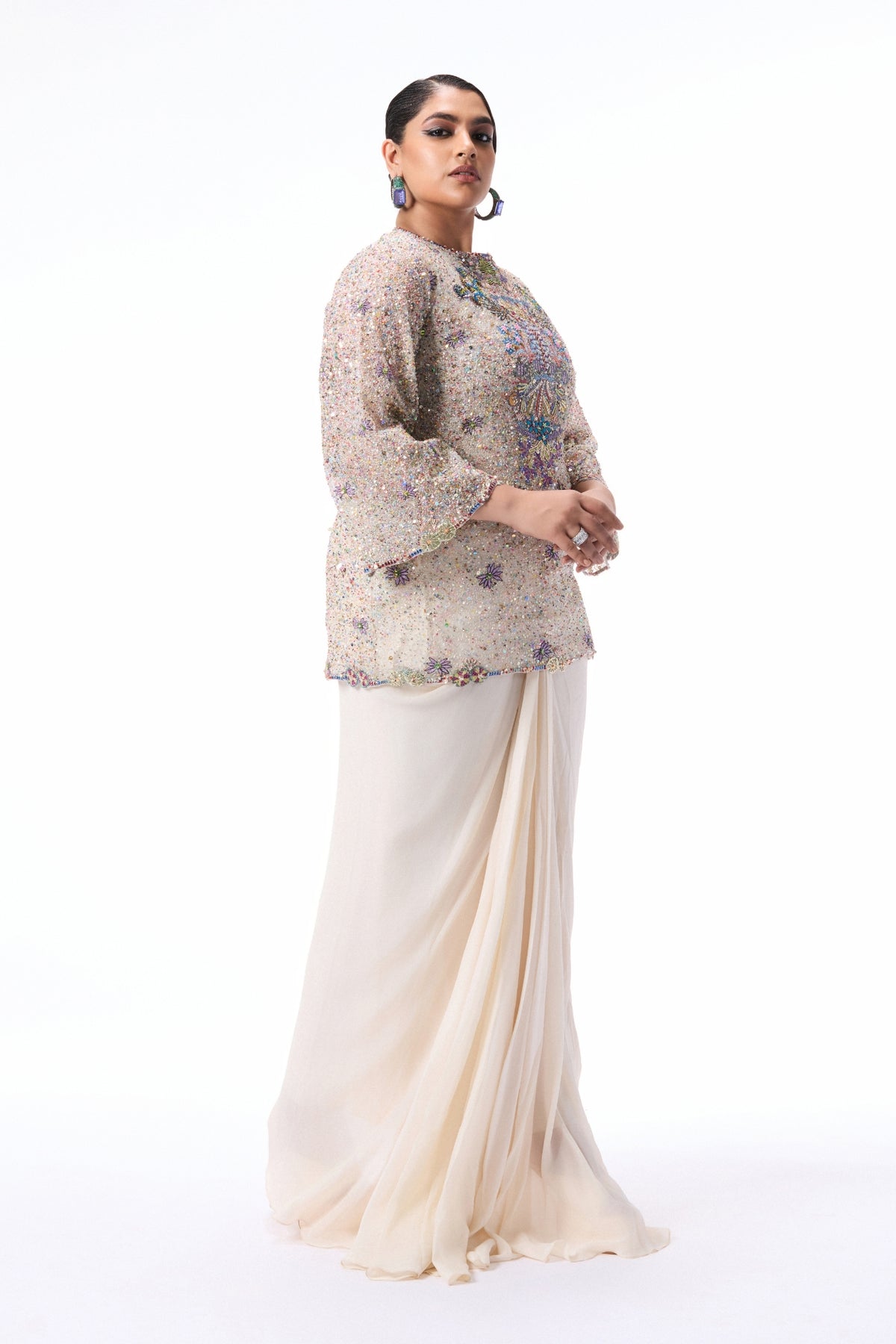 wild at heart ivory applique embellished sequin tulle short kurta with pleated draped skirt.