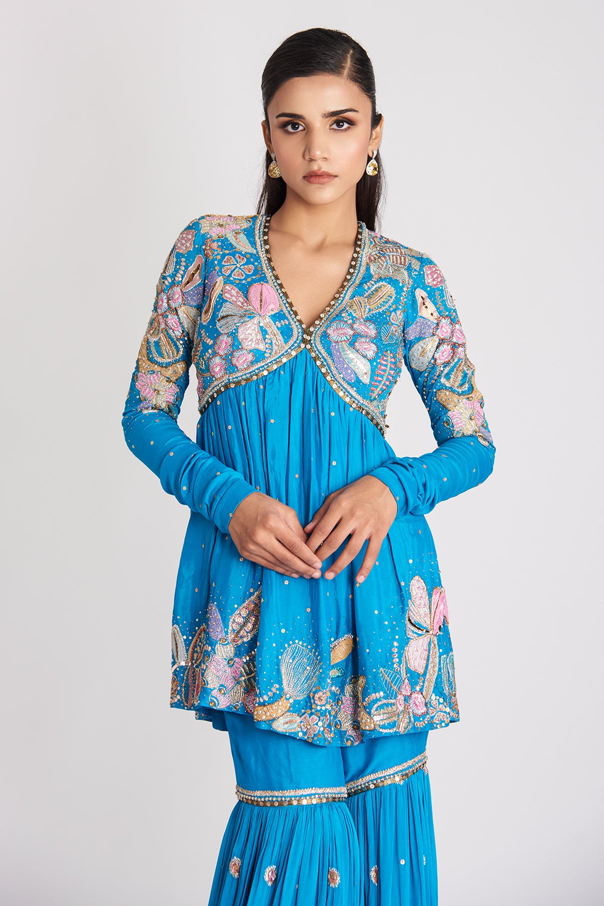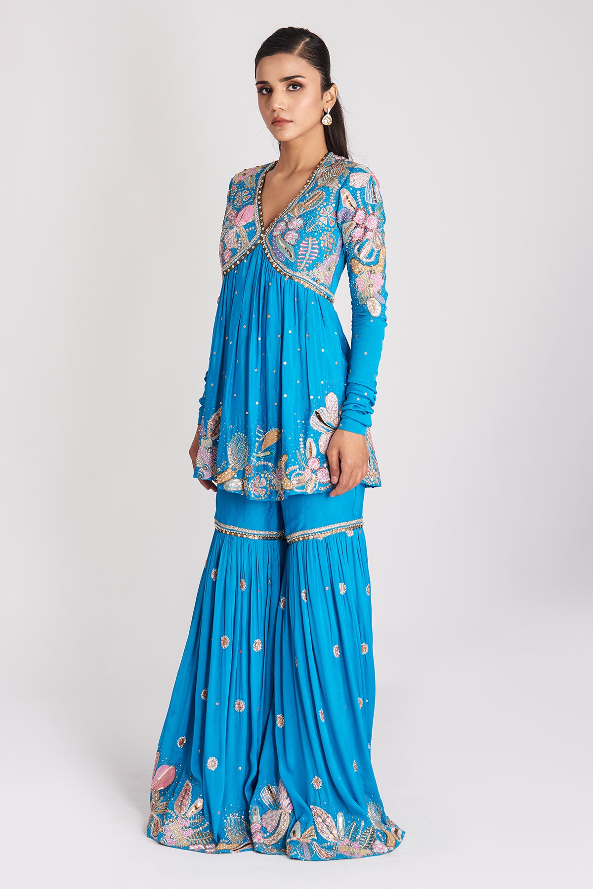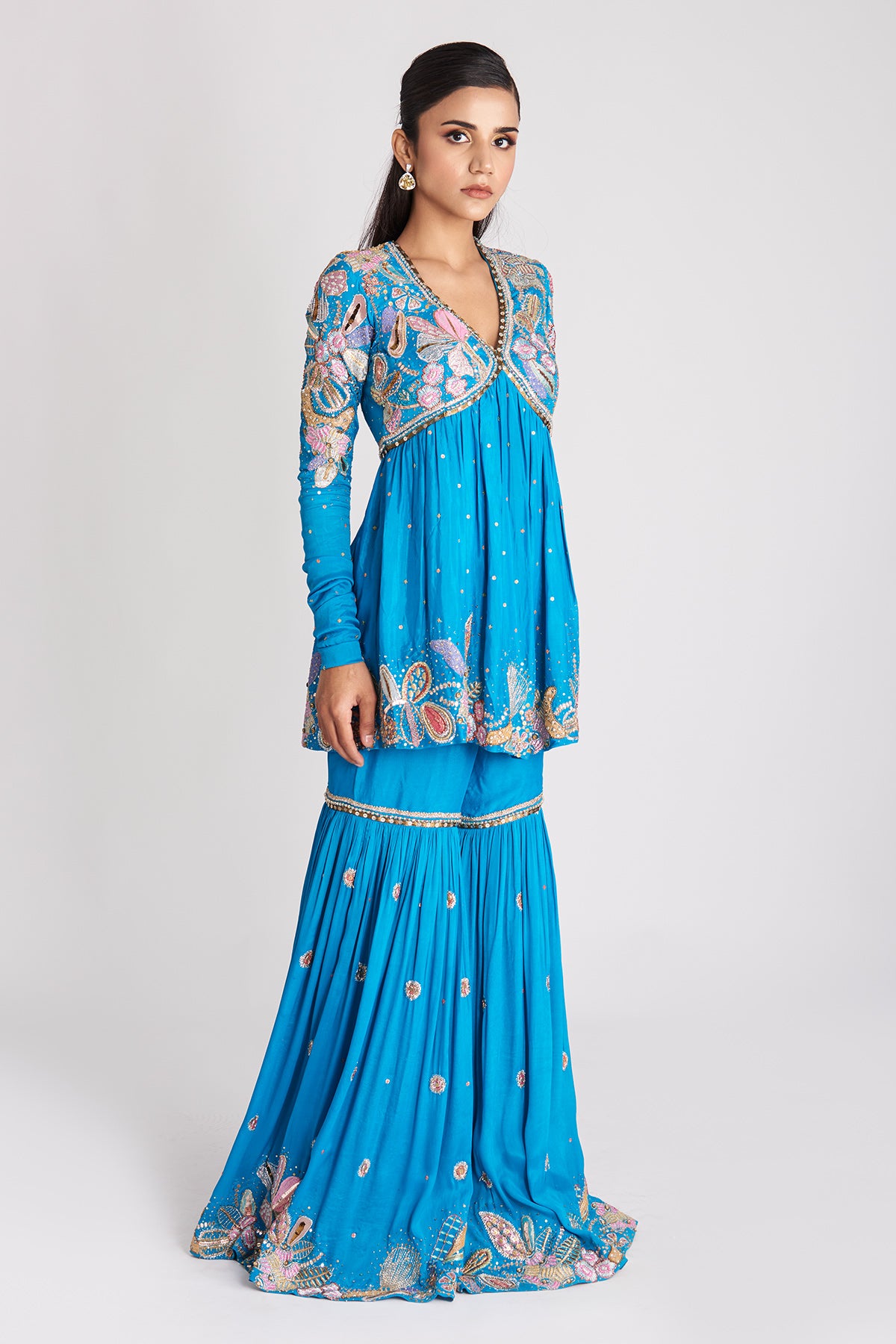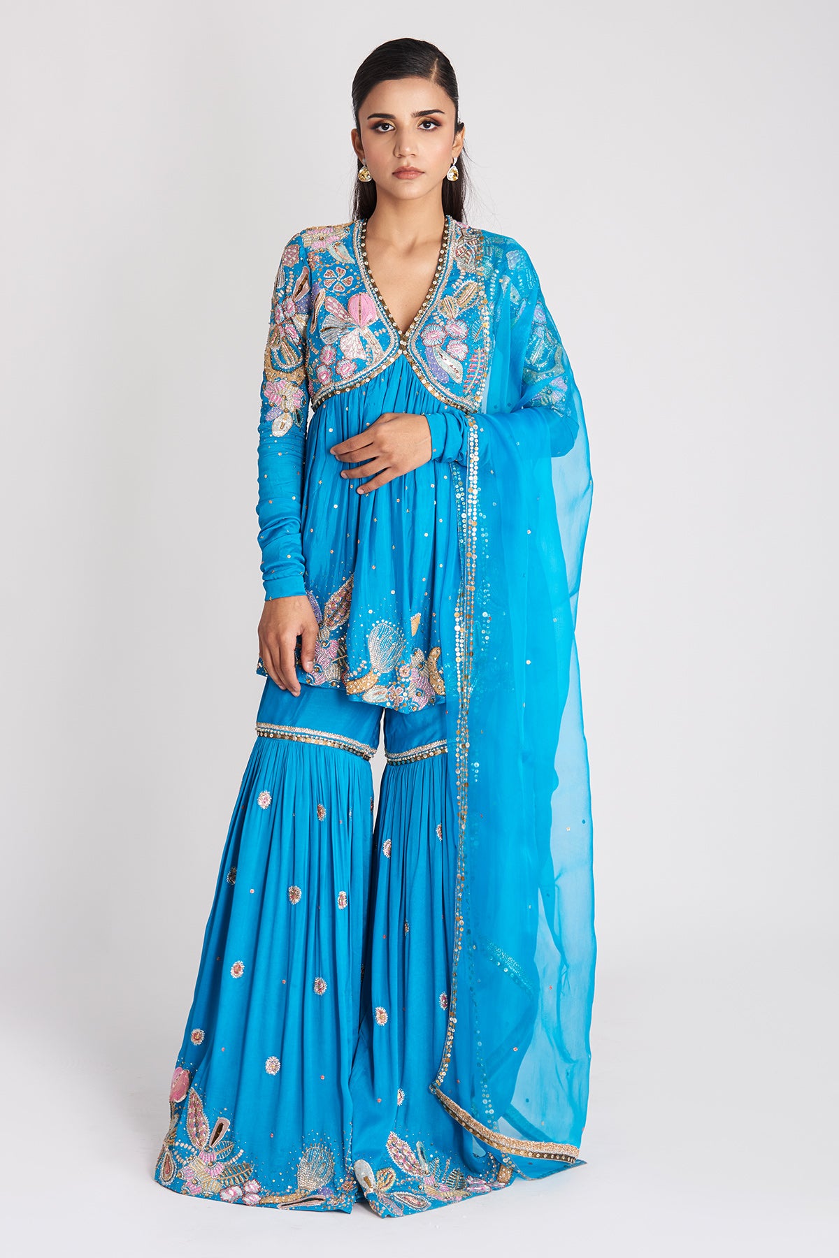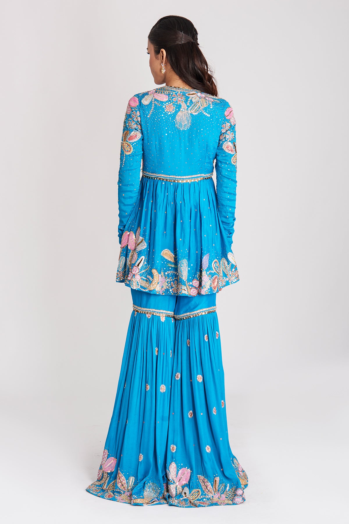 Kinfolk cyan blue applique embellished mulberry crepe kurta gharara with organza dupatta