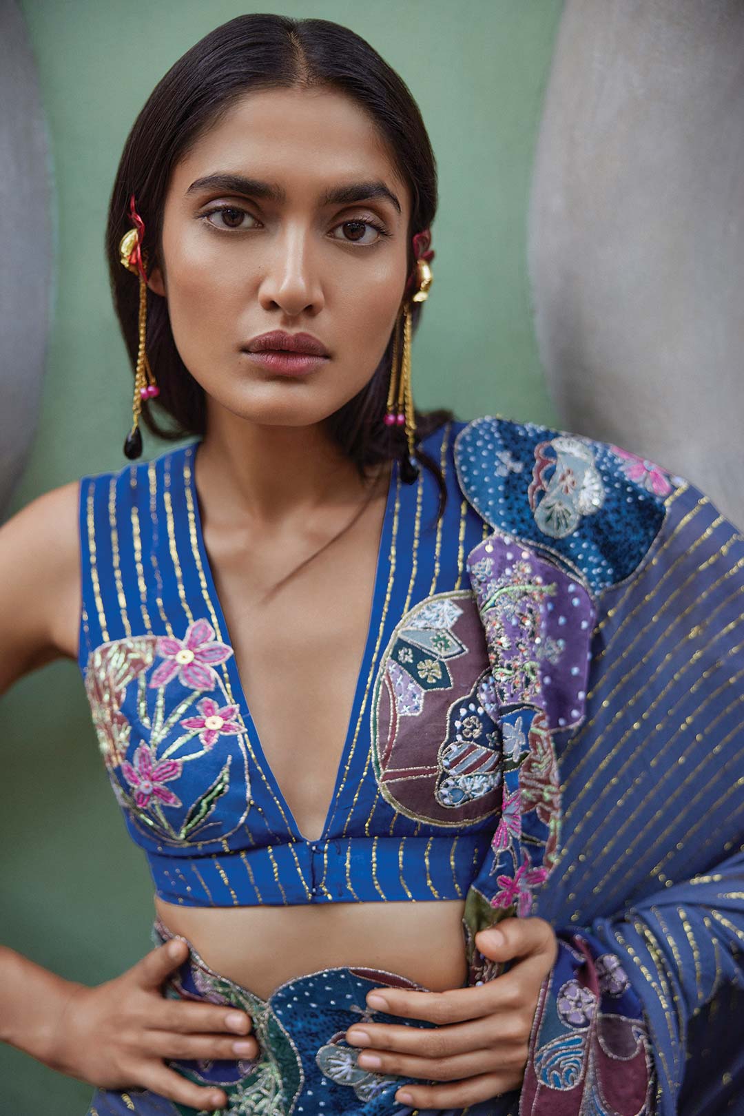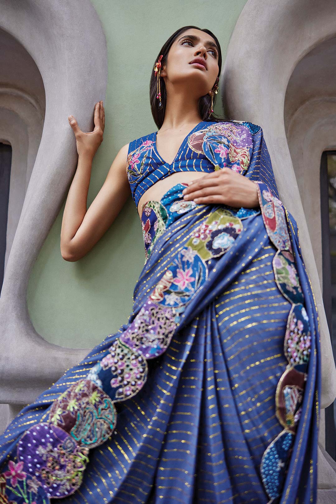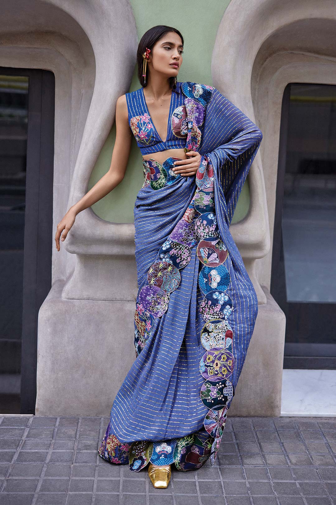 Our Trencadís blue dobby pre-draped saree with embellished circle border and blouse