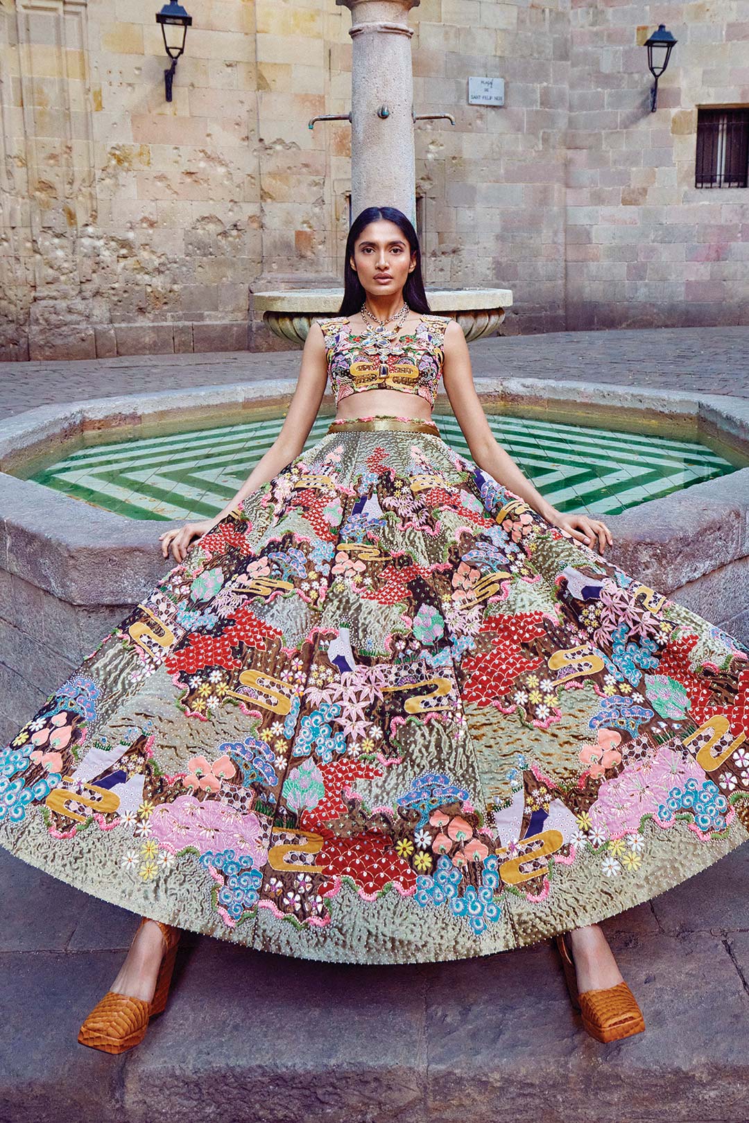 Gold Trencadís bronze metallic appliquéd and embellished tissue lehenga with blouse & dupatta