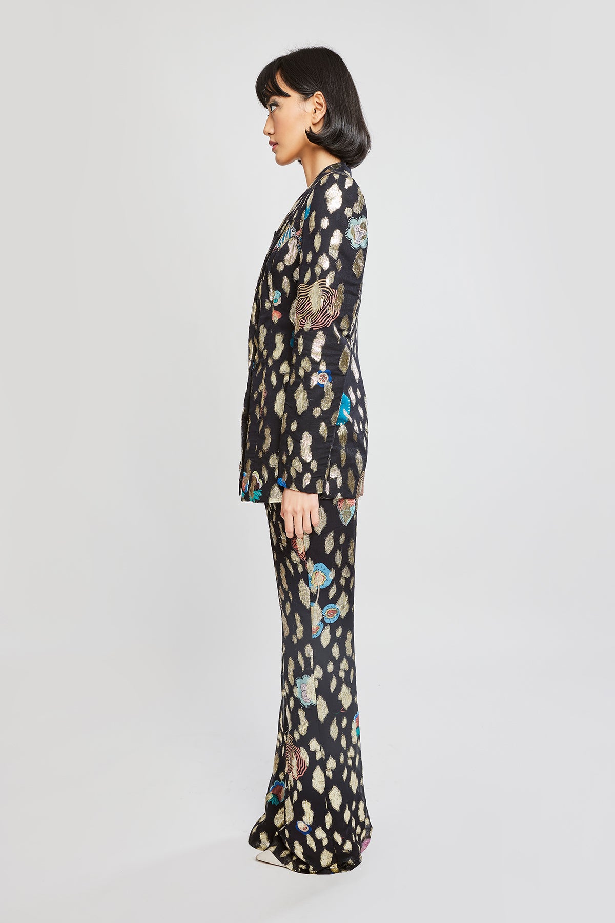 Wide-leg pant drape on right side of blazer set