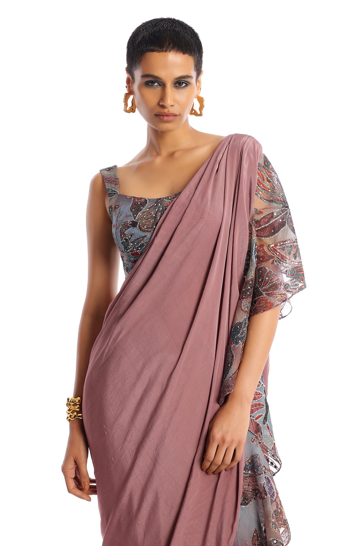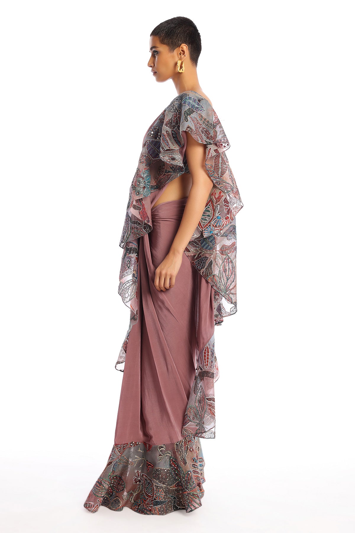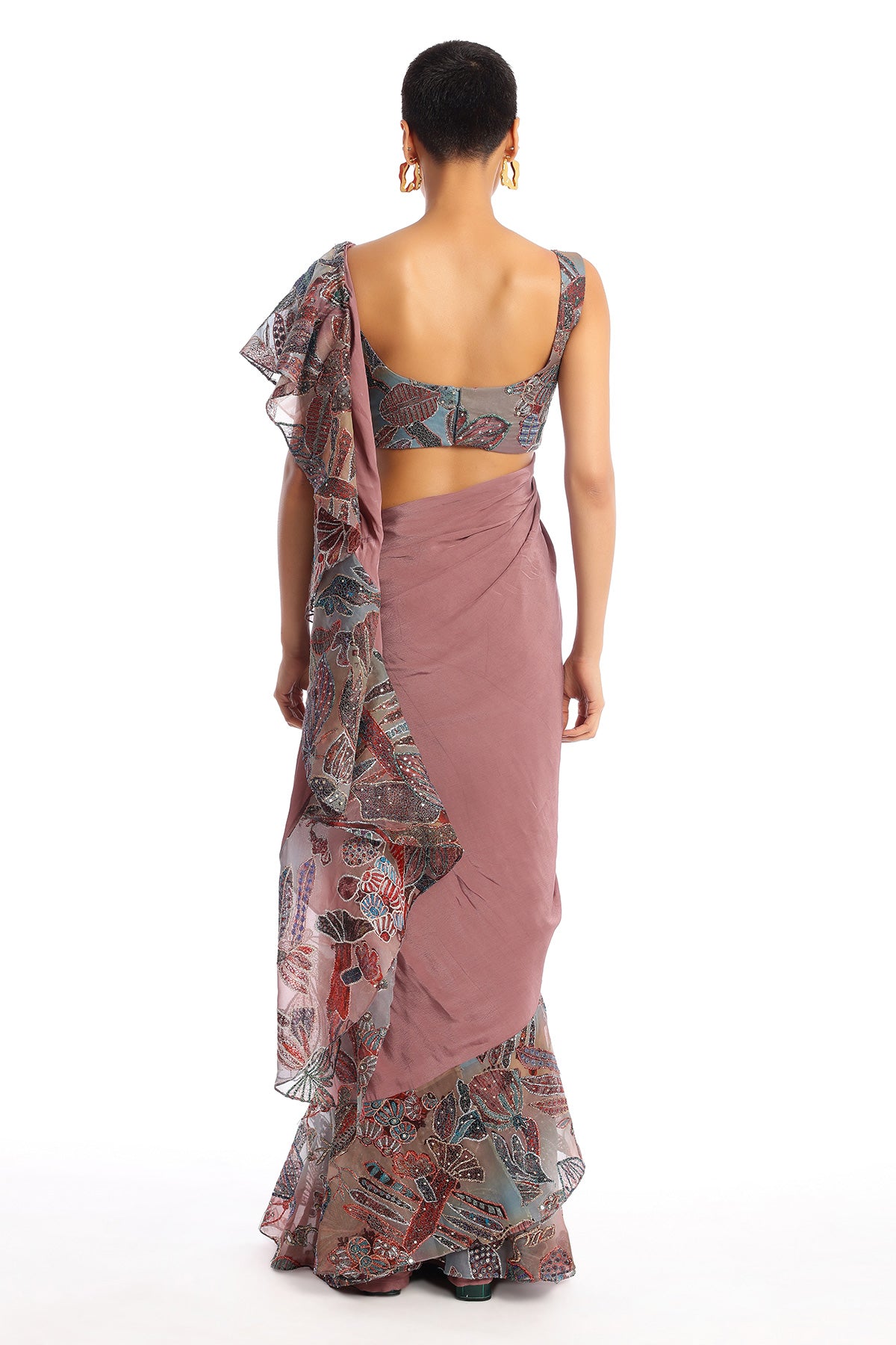 Kinfolk rose quartz printed embellished organza ruffle with mulberry crepe stitched saree & organza blouse