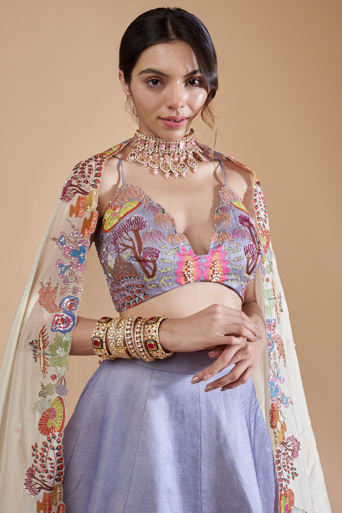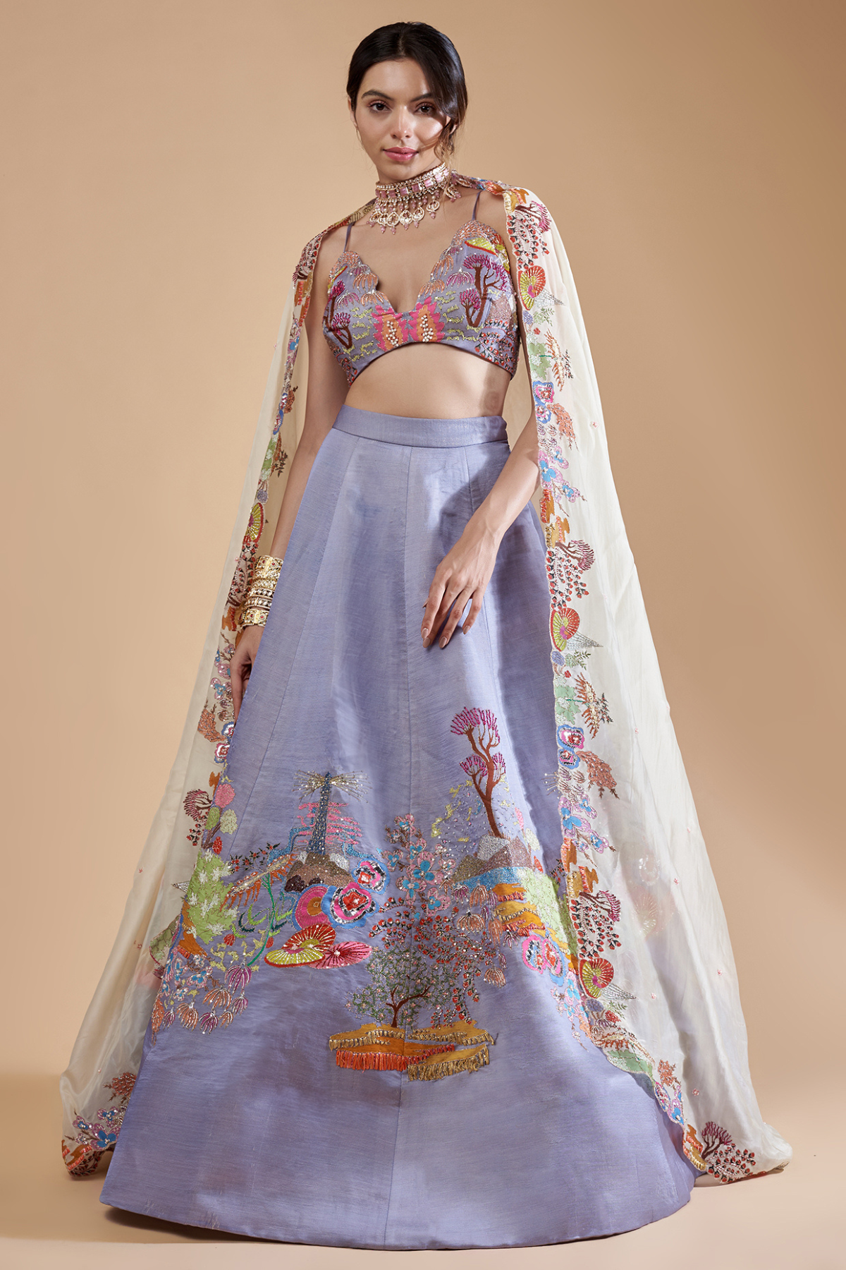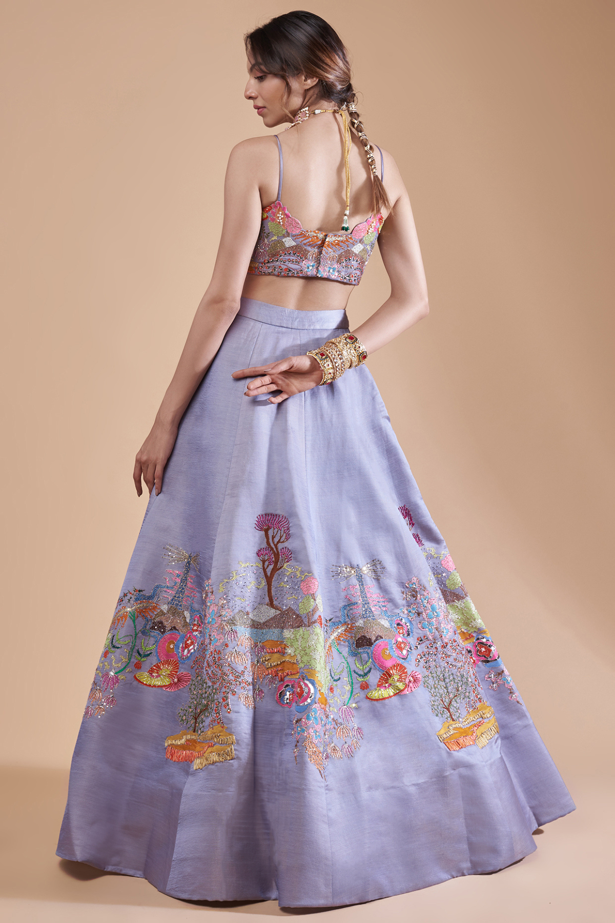 Divergence purple appliqued embellished kasab satin MK lehenga with extended shoulder blouse & dupatta.