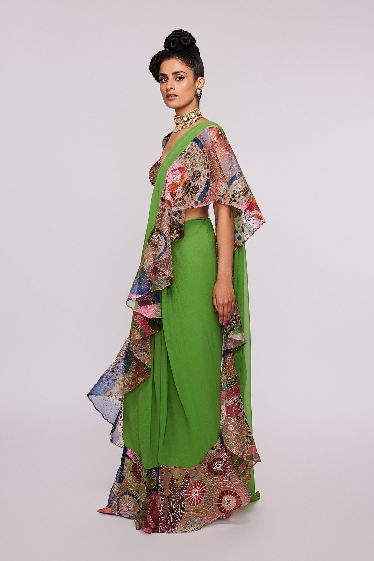 Parrot green divergence vase printed and embellished organza ruffle saree and blouse