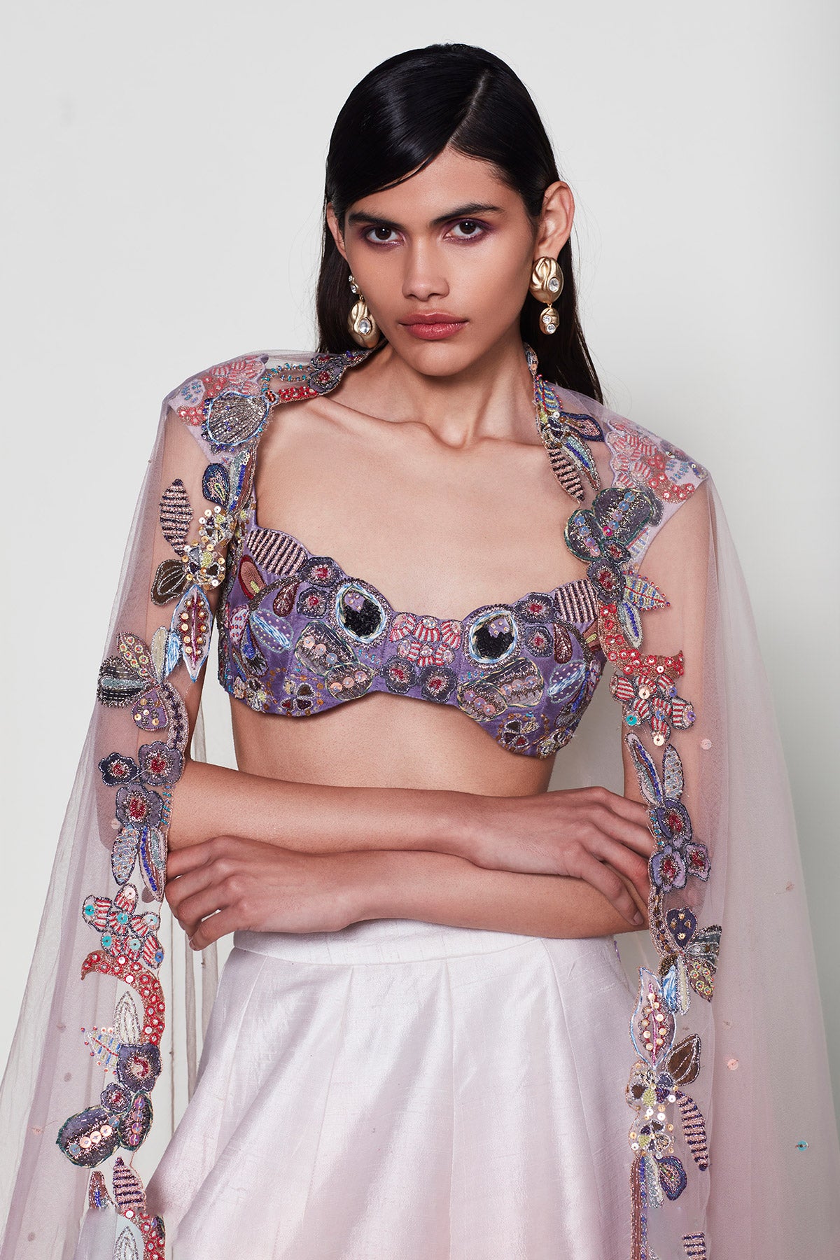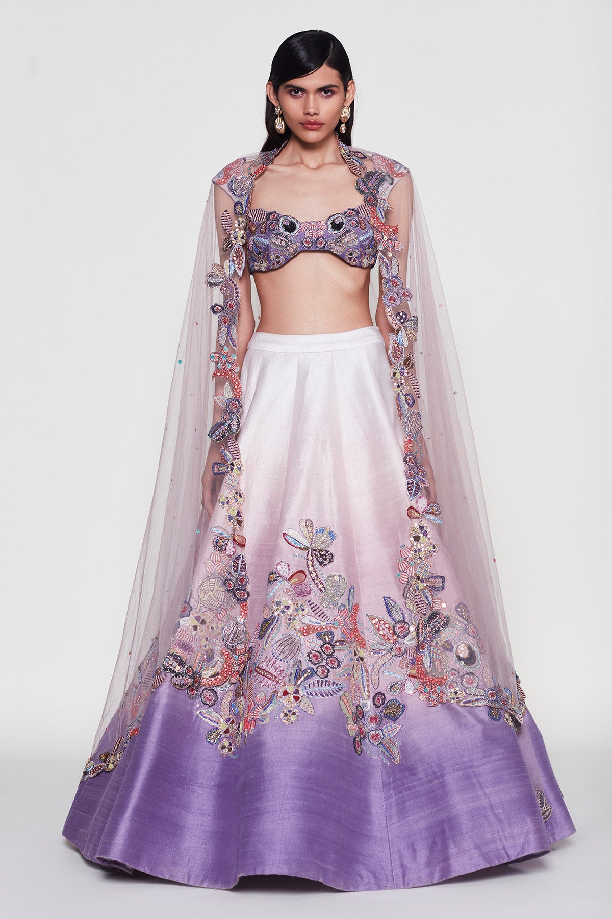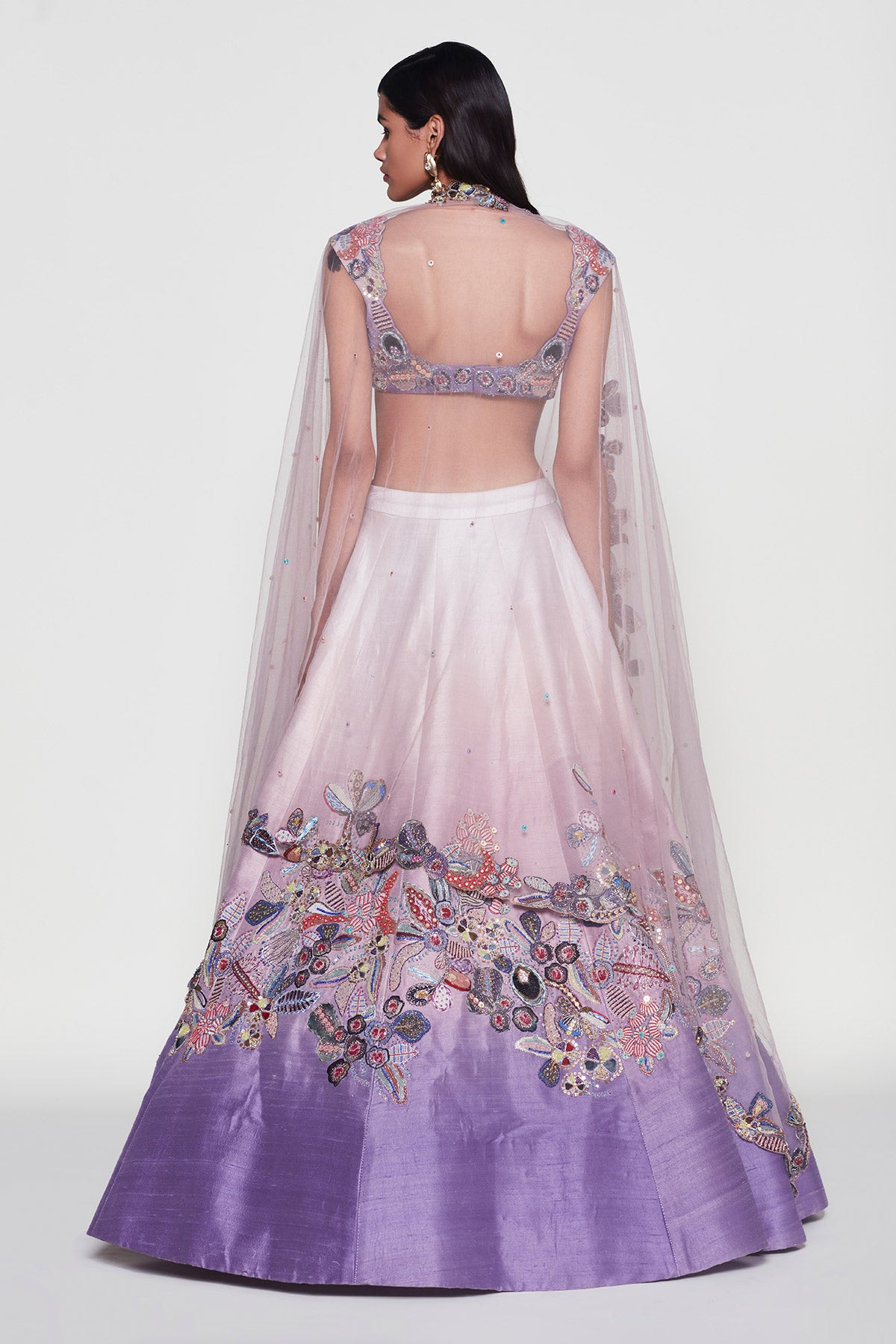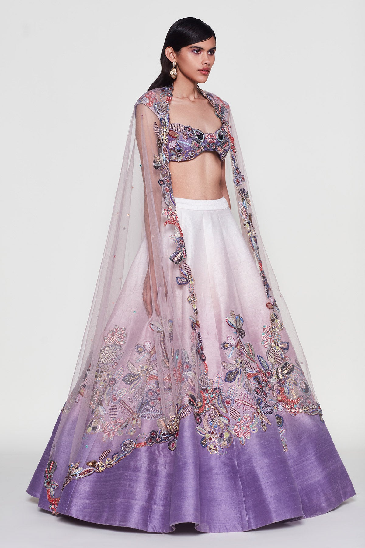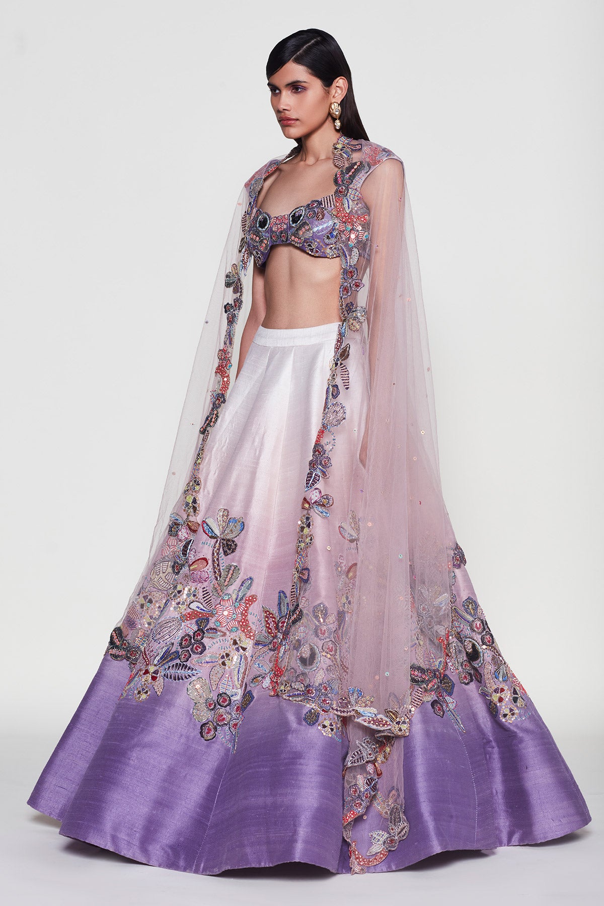 Kinfolk ivory- amethyst ombre applique embellished raw silk MK lehenga, blouse & tulle dupatta