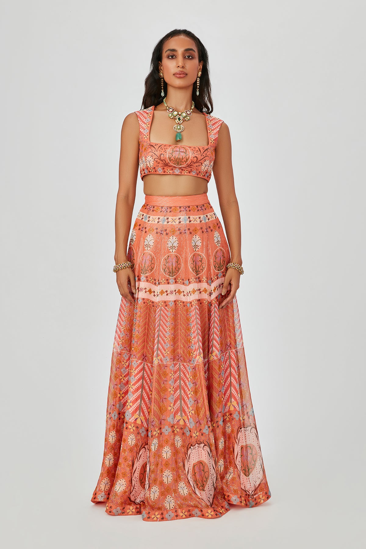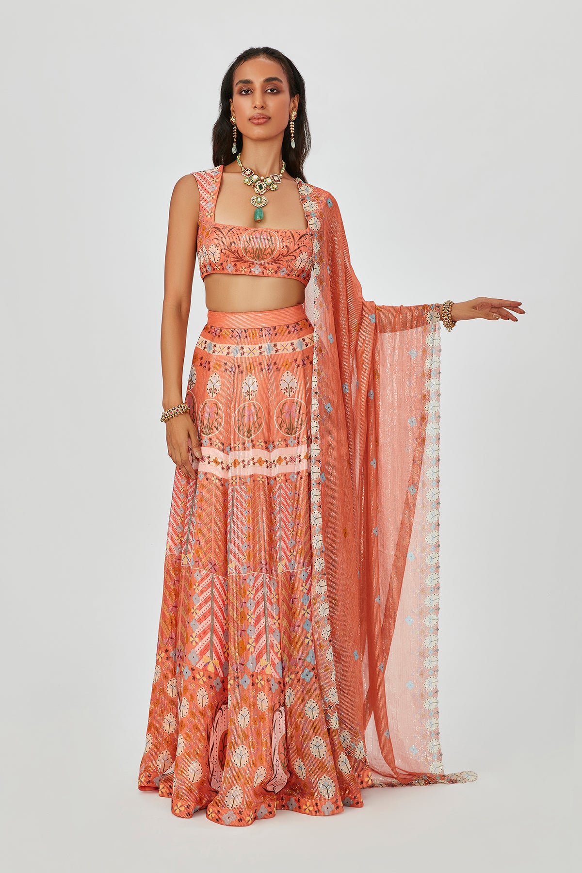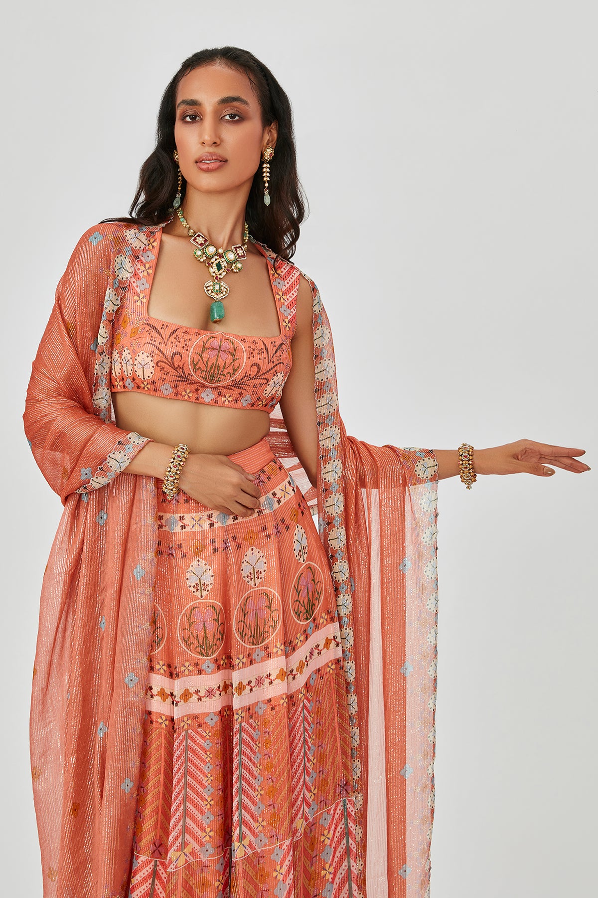 Multicolored printed gold-silver line dobby light georgette lehenga, sleeveless blouse, and dupatta.
