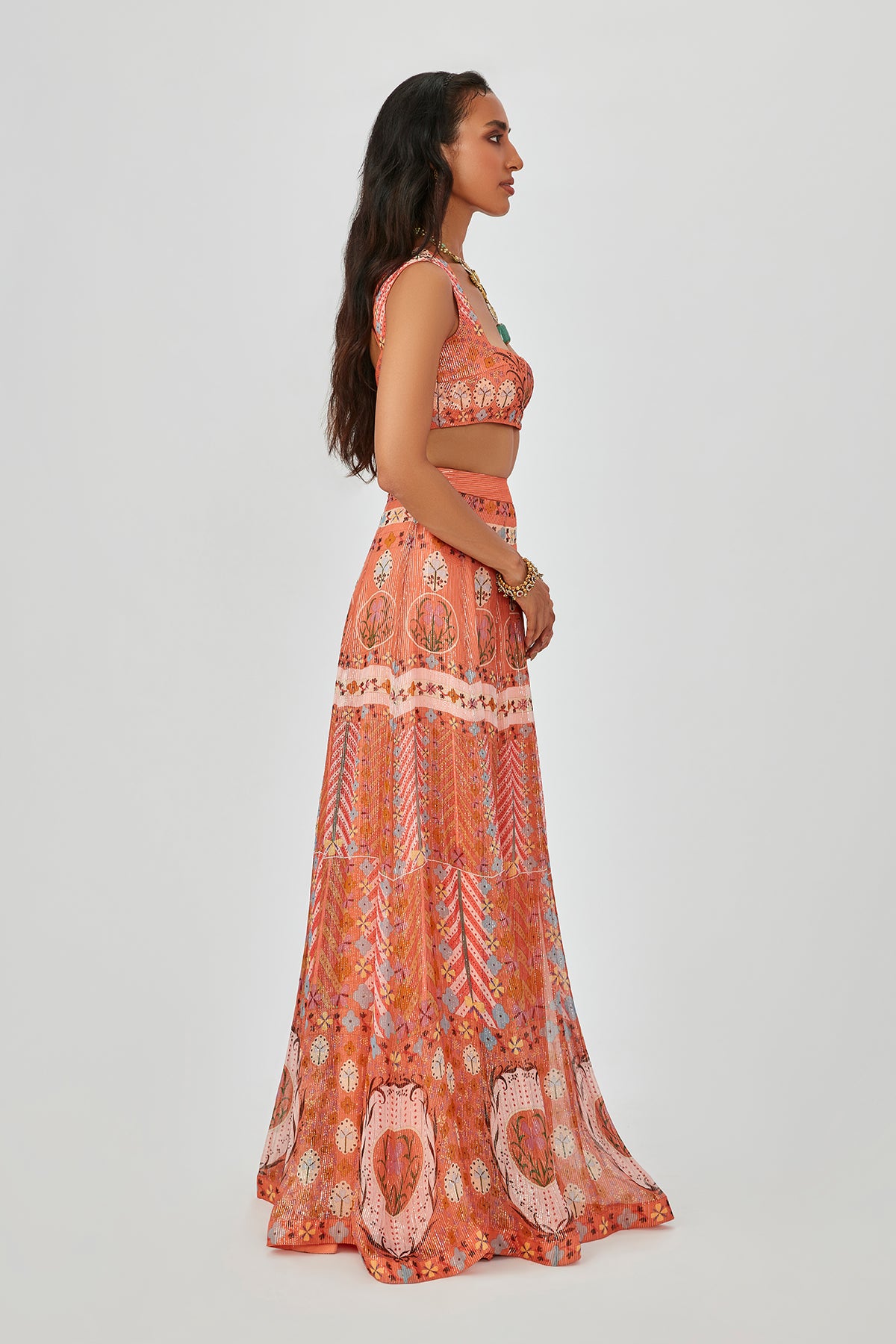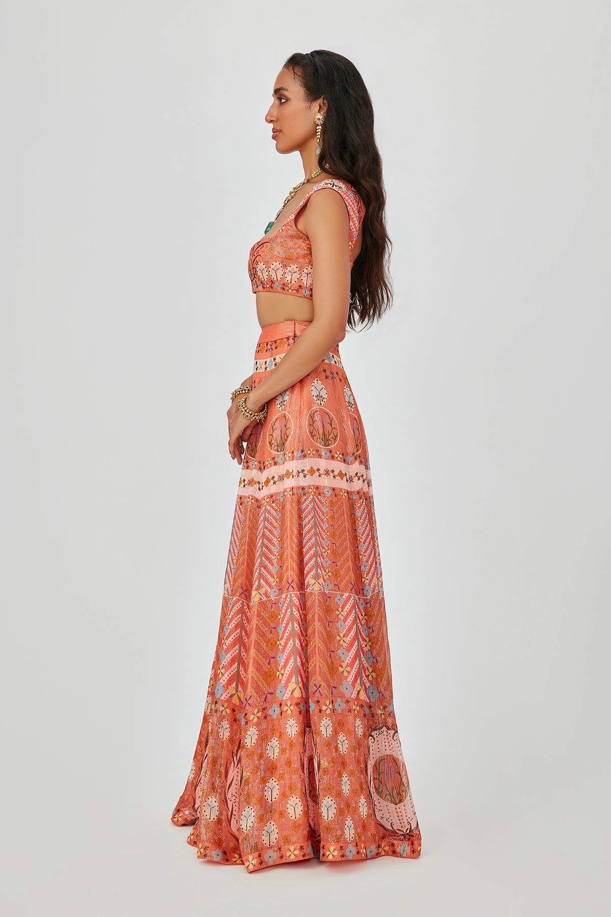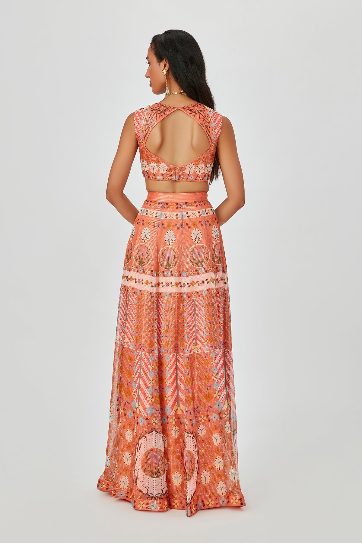 Multicolored printed gold-silver line dobby light georgette lehenga, sleeveless blouse, and dupatta.