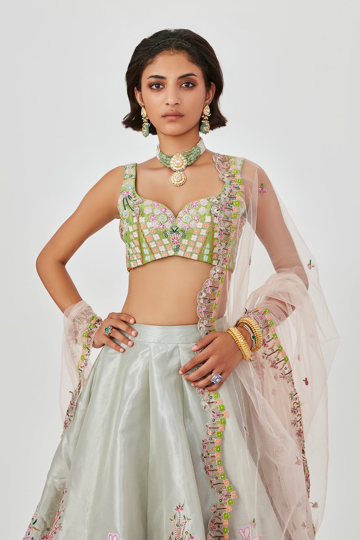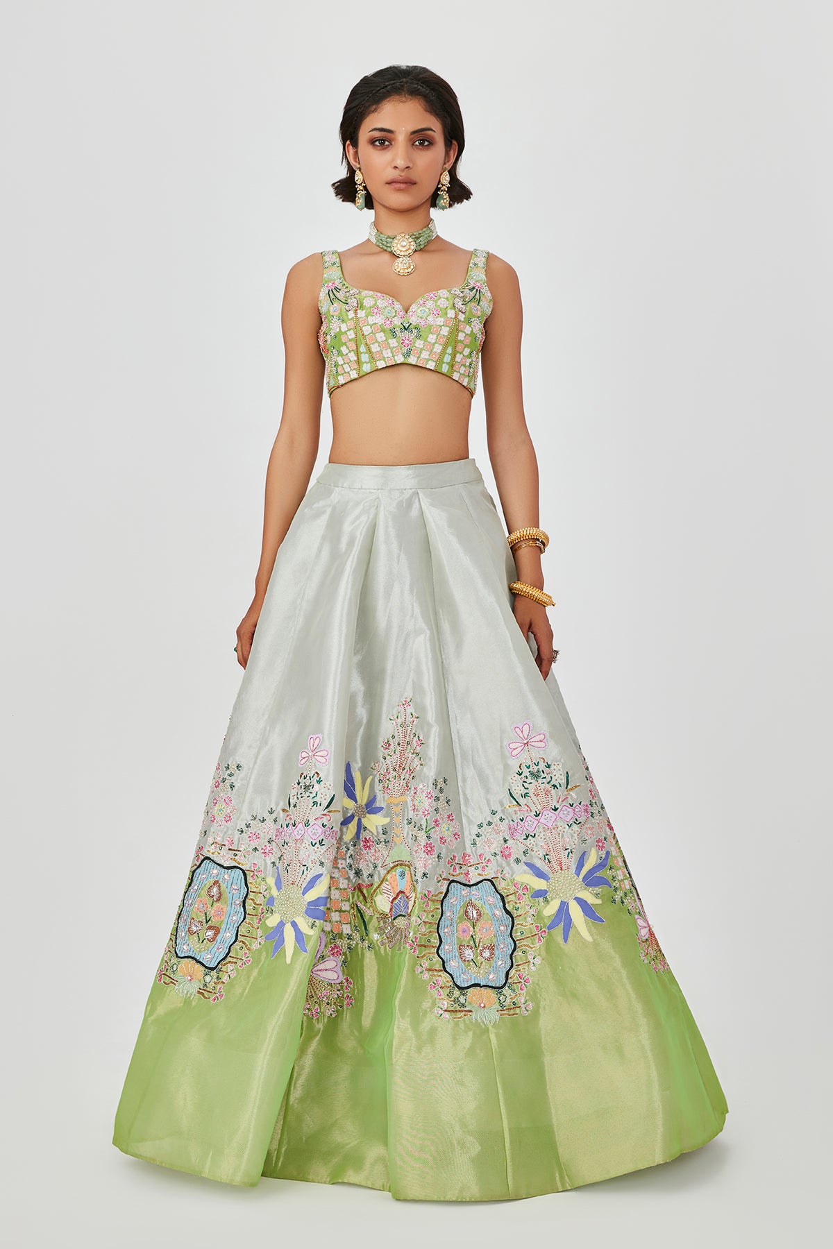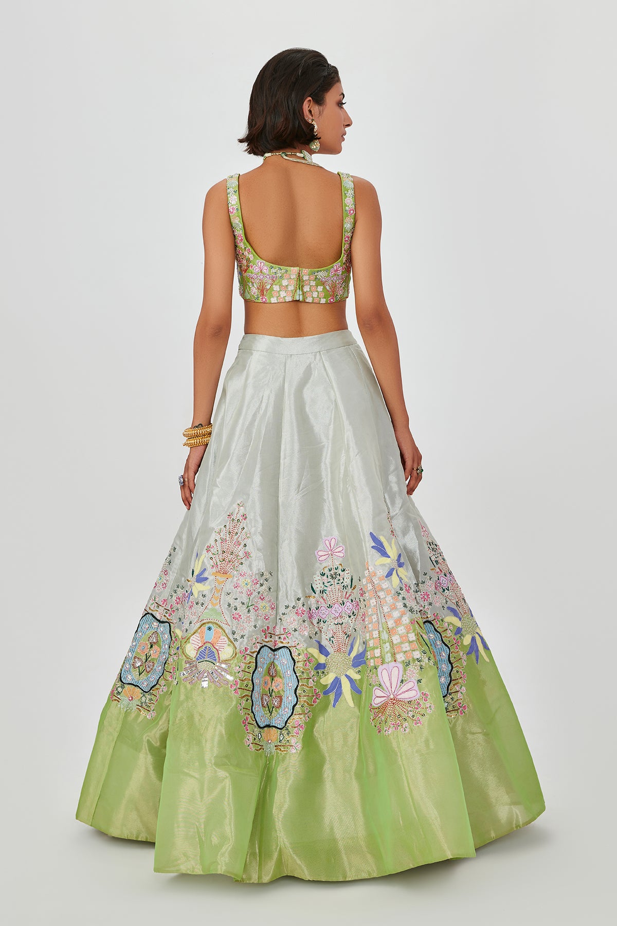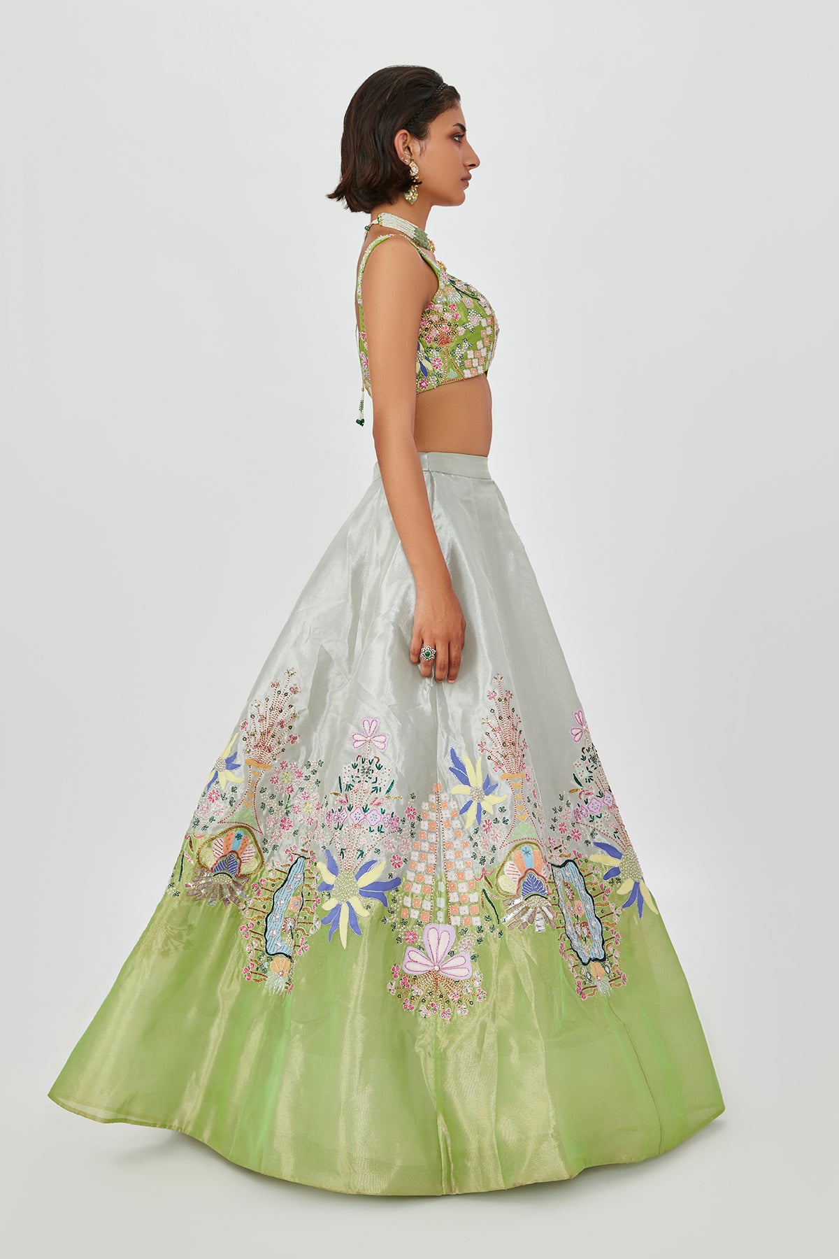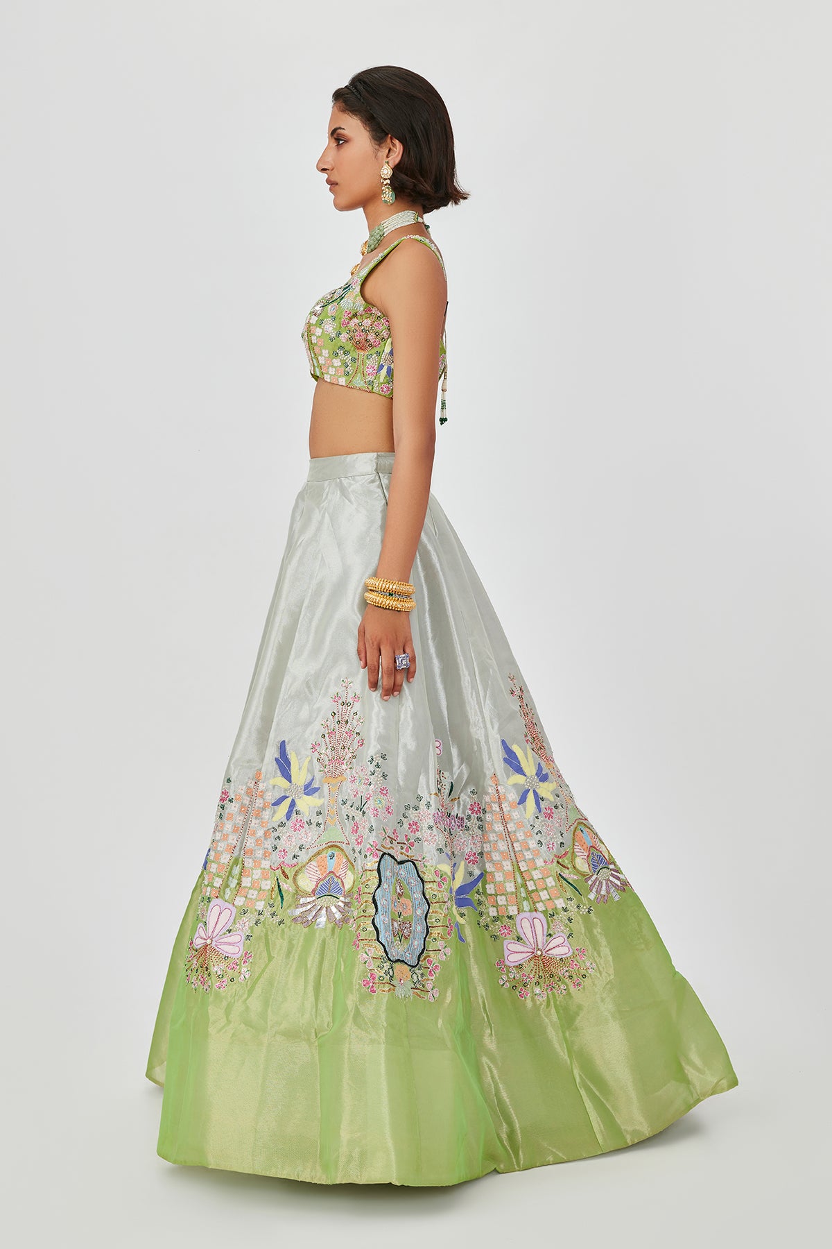 Ivory/Lime Tissue appliqued and embellished MK lehenga with sleeveless blouse and scallop dupatta.