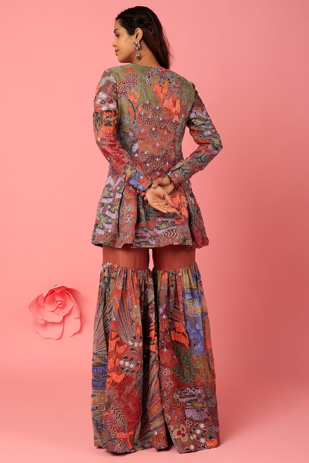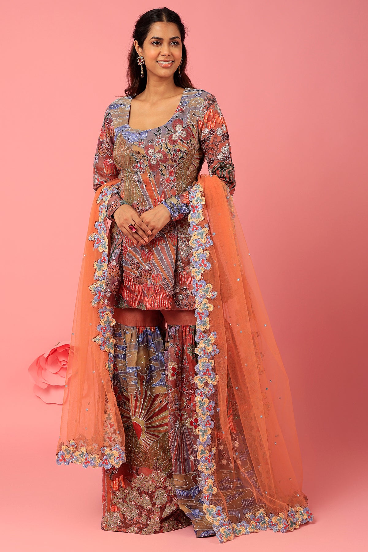 Peach Divergence Printed And Embellished Organza Sharara Set And Dupatta