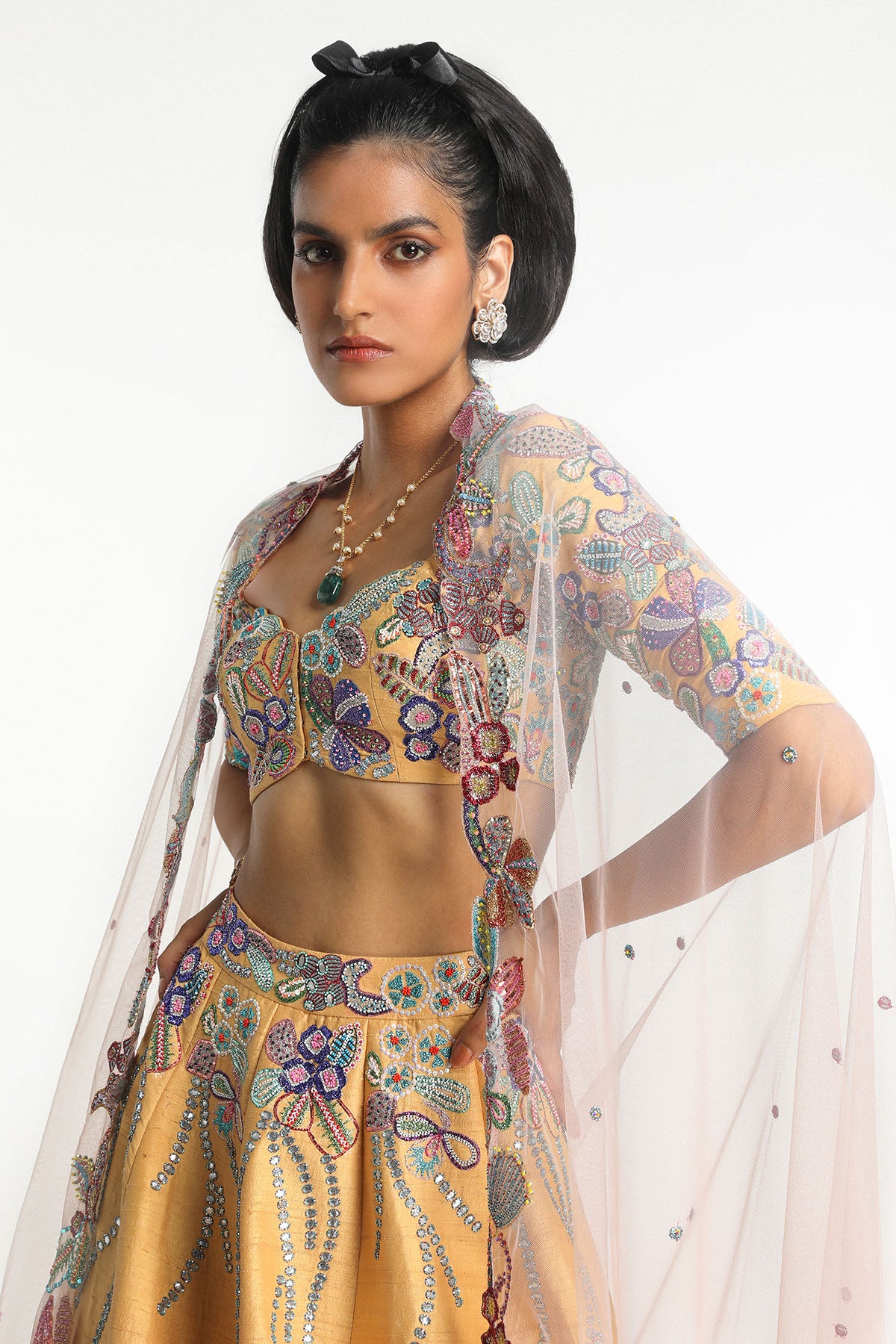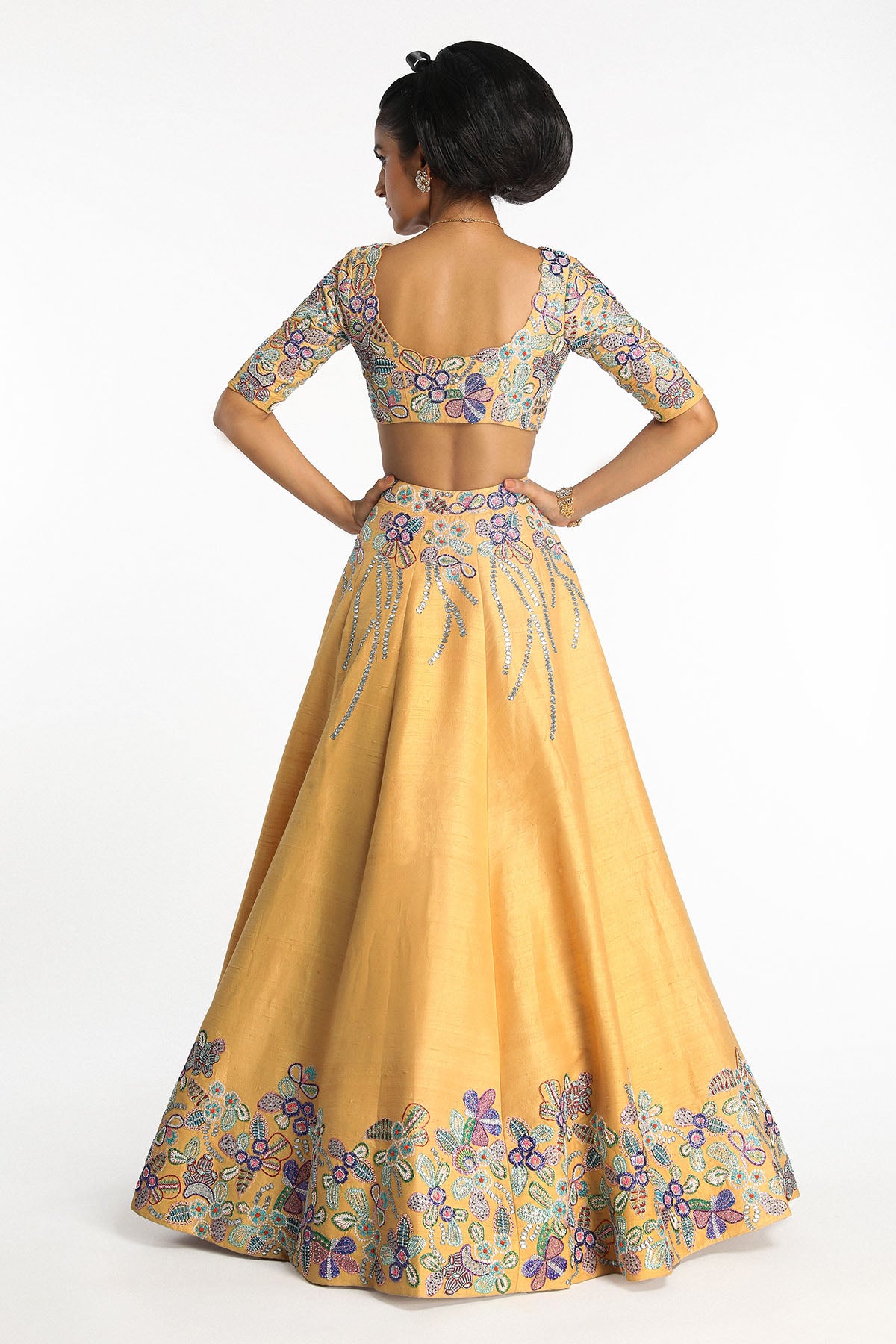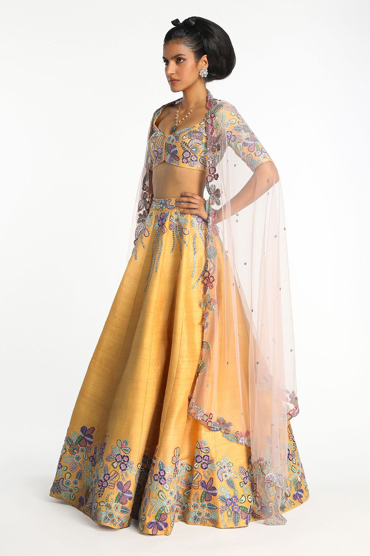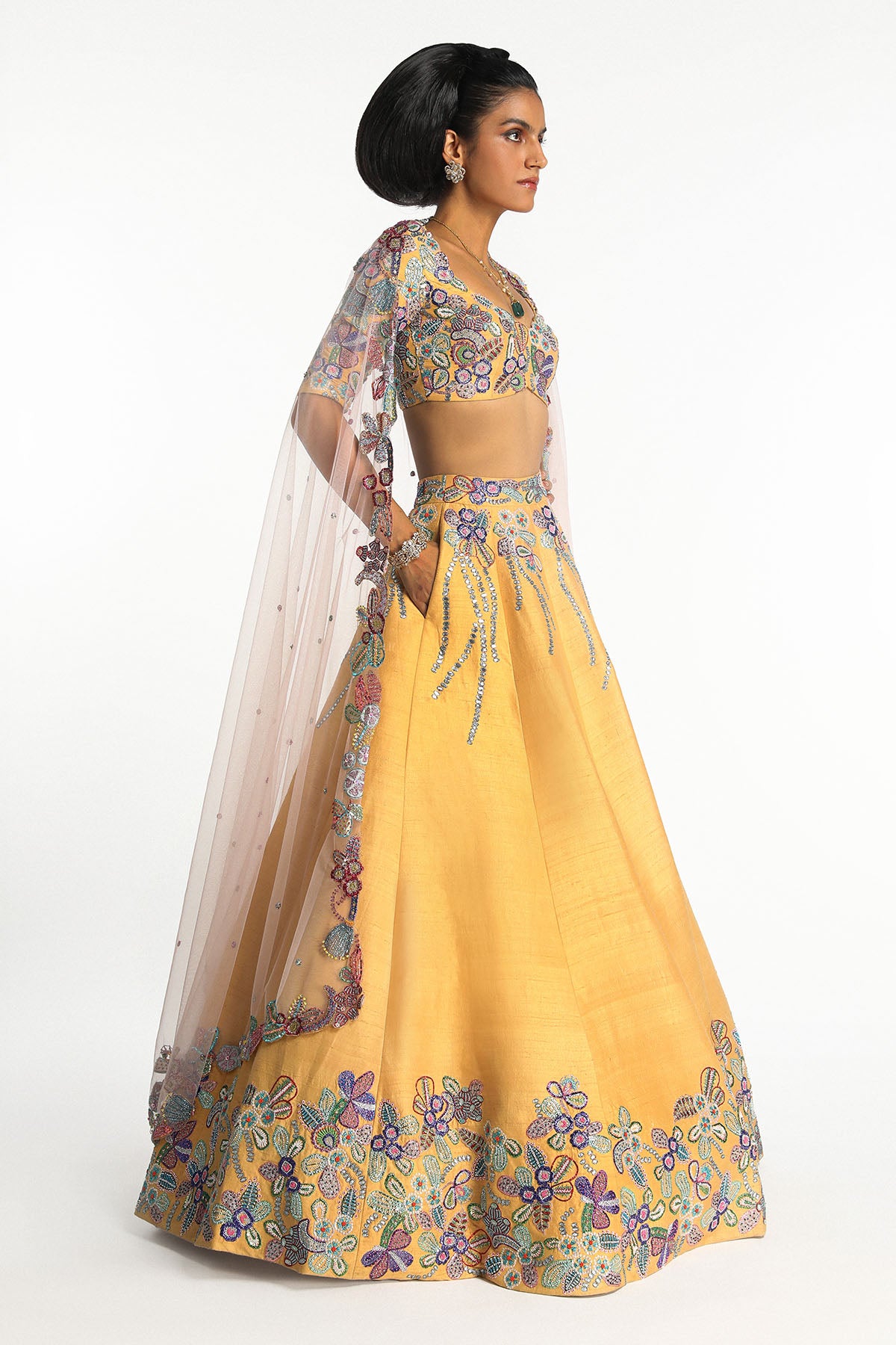 Kinfolk yellow embellished raw silk LK lehenga, blouse & tulle dupatta