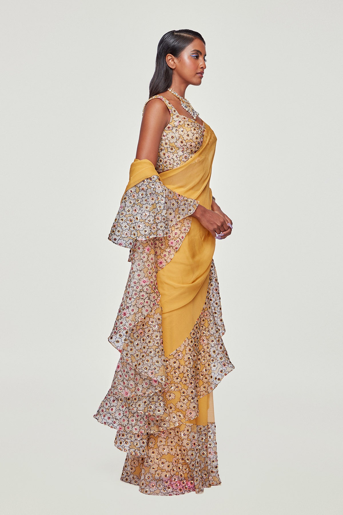 Yellow divergence organza printed and embellished ruffle saree and blouse.