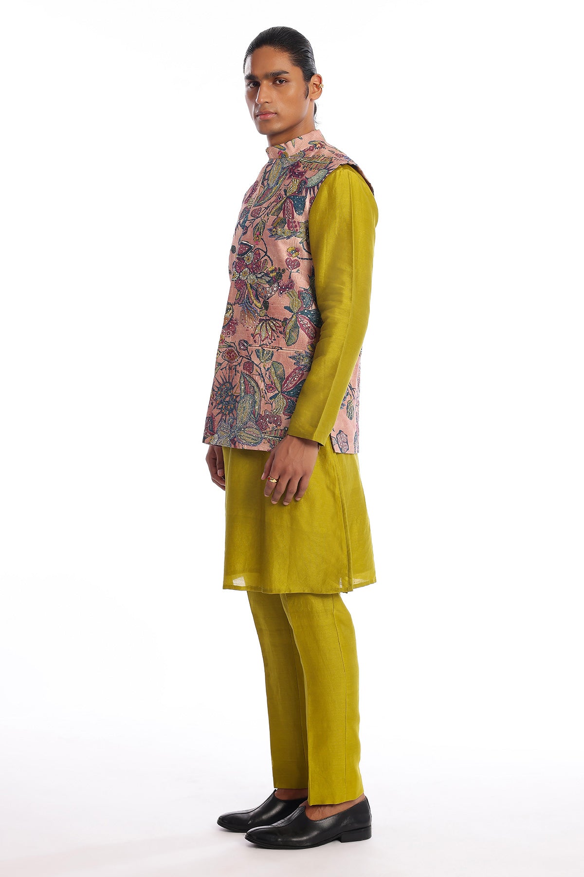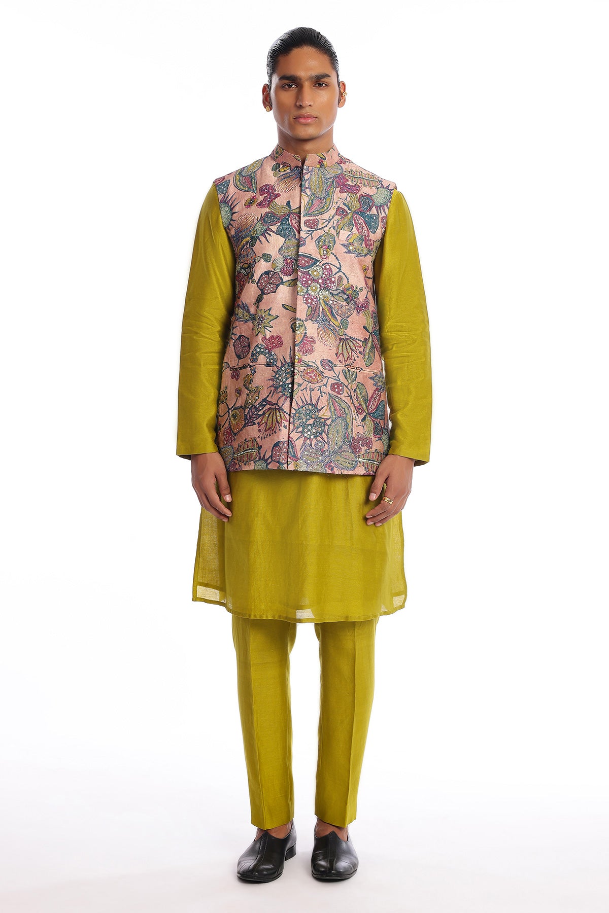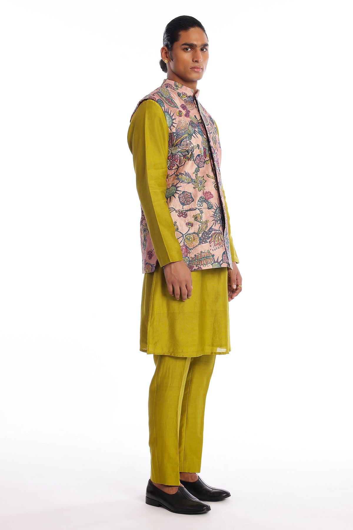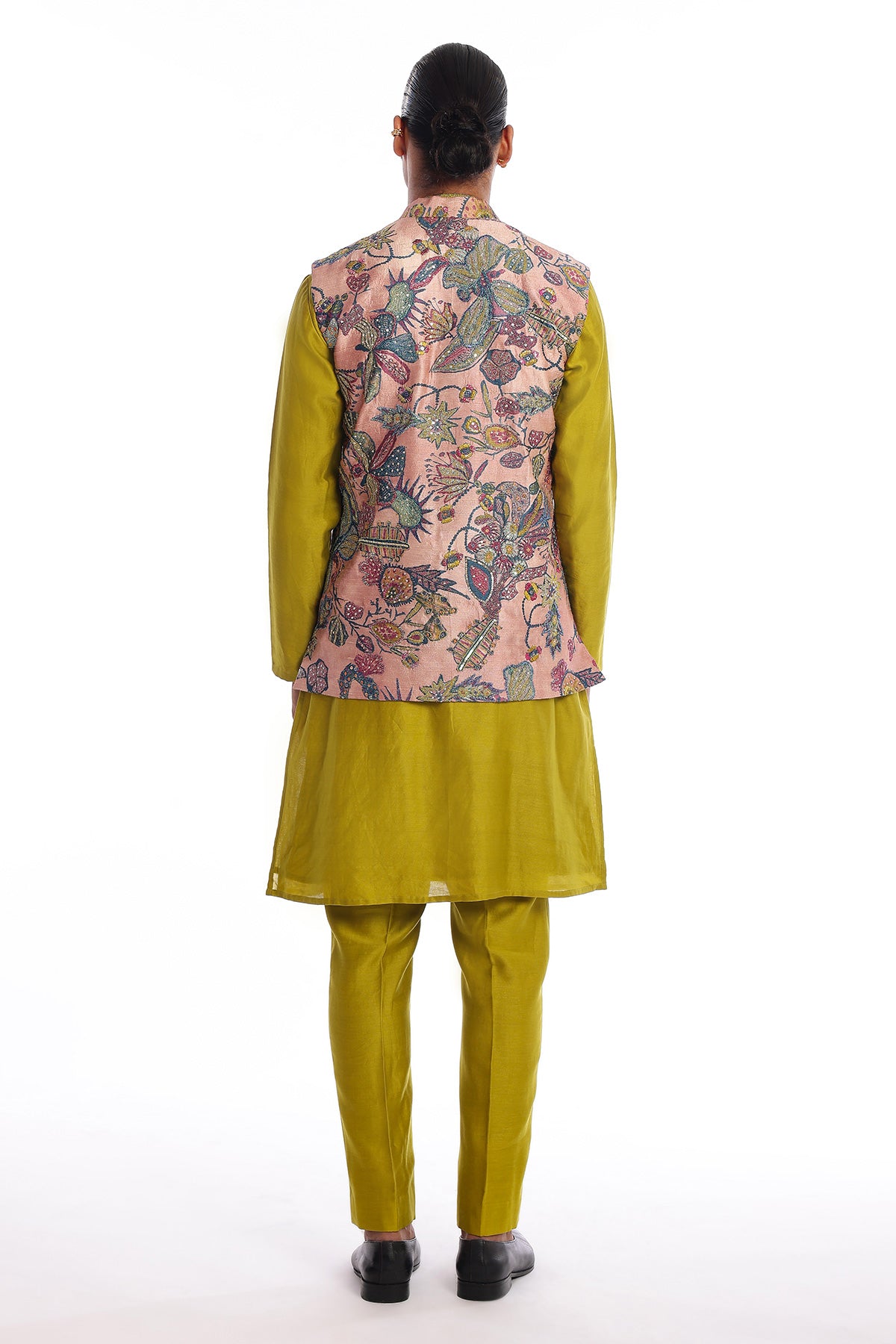 Kinfolk tuscany pink printed embellished kora dupion bundi with olive chanderi silk kurta & straight pant