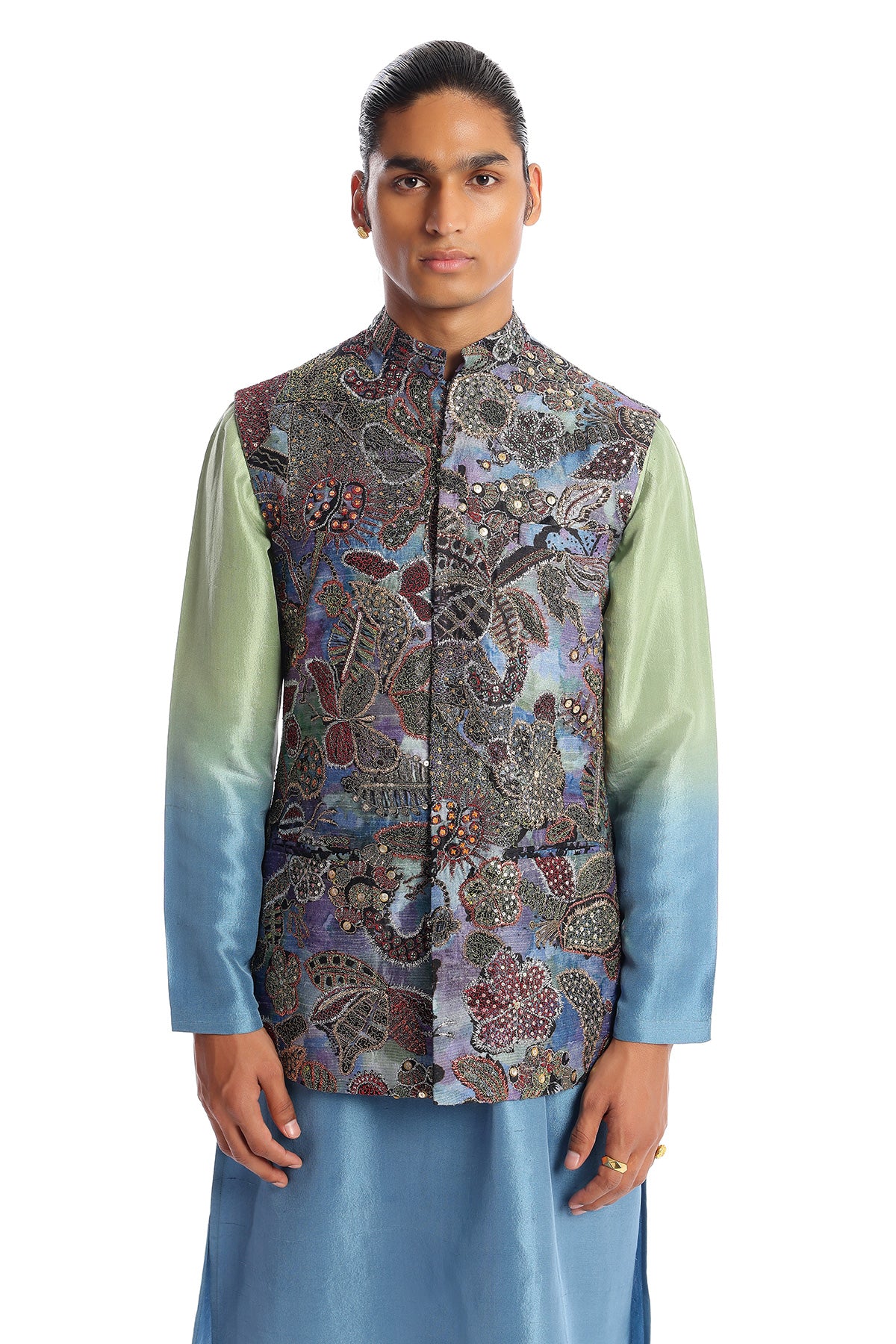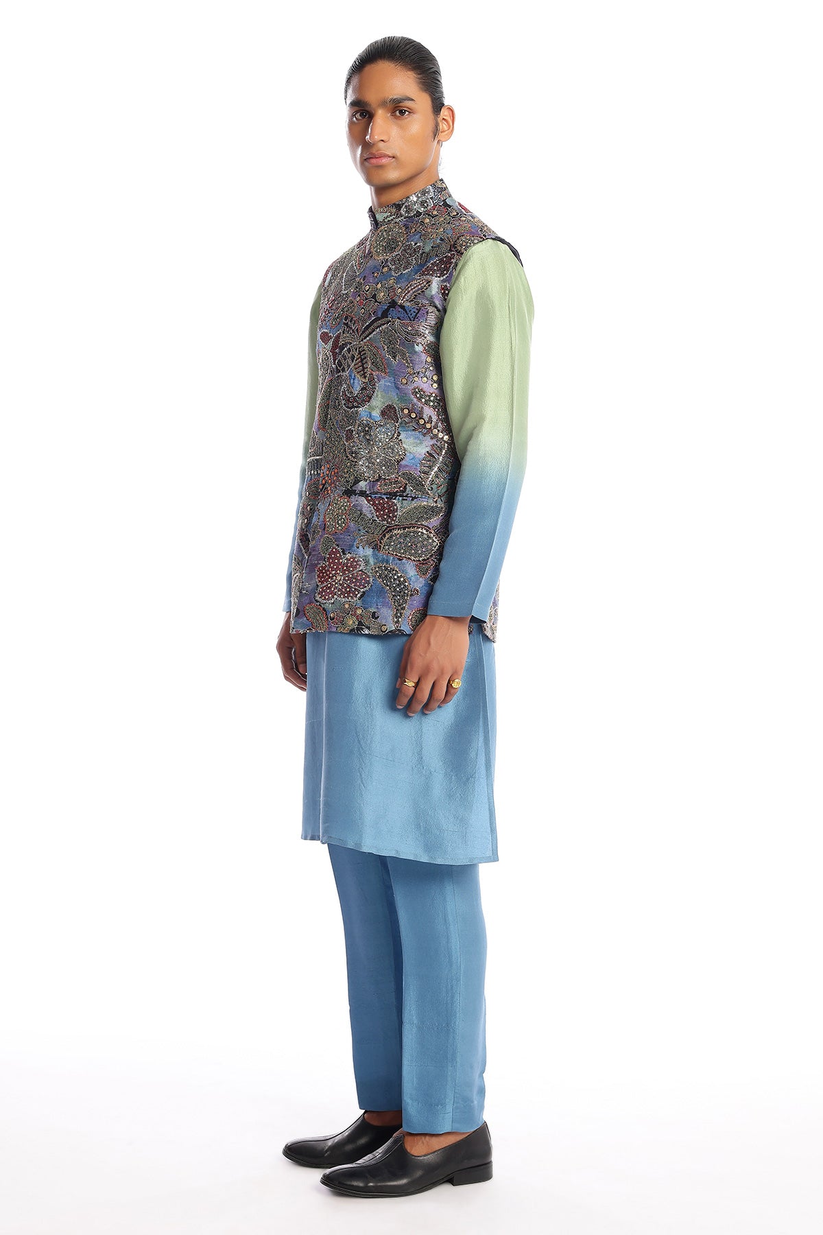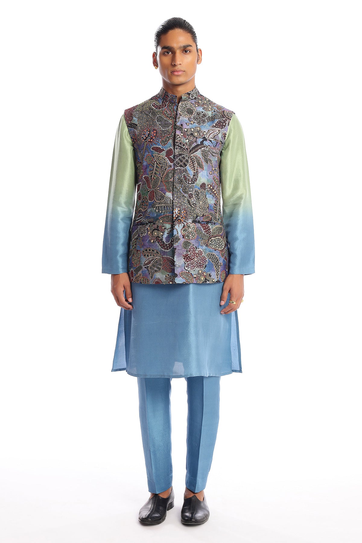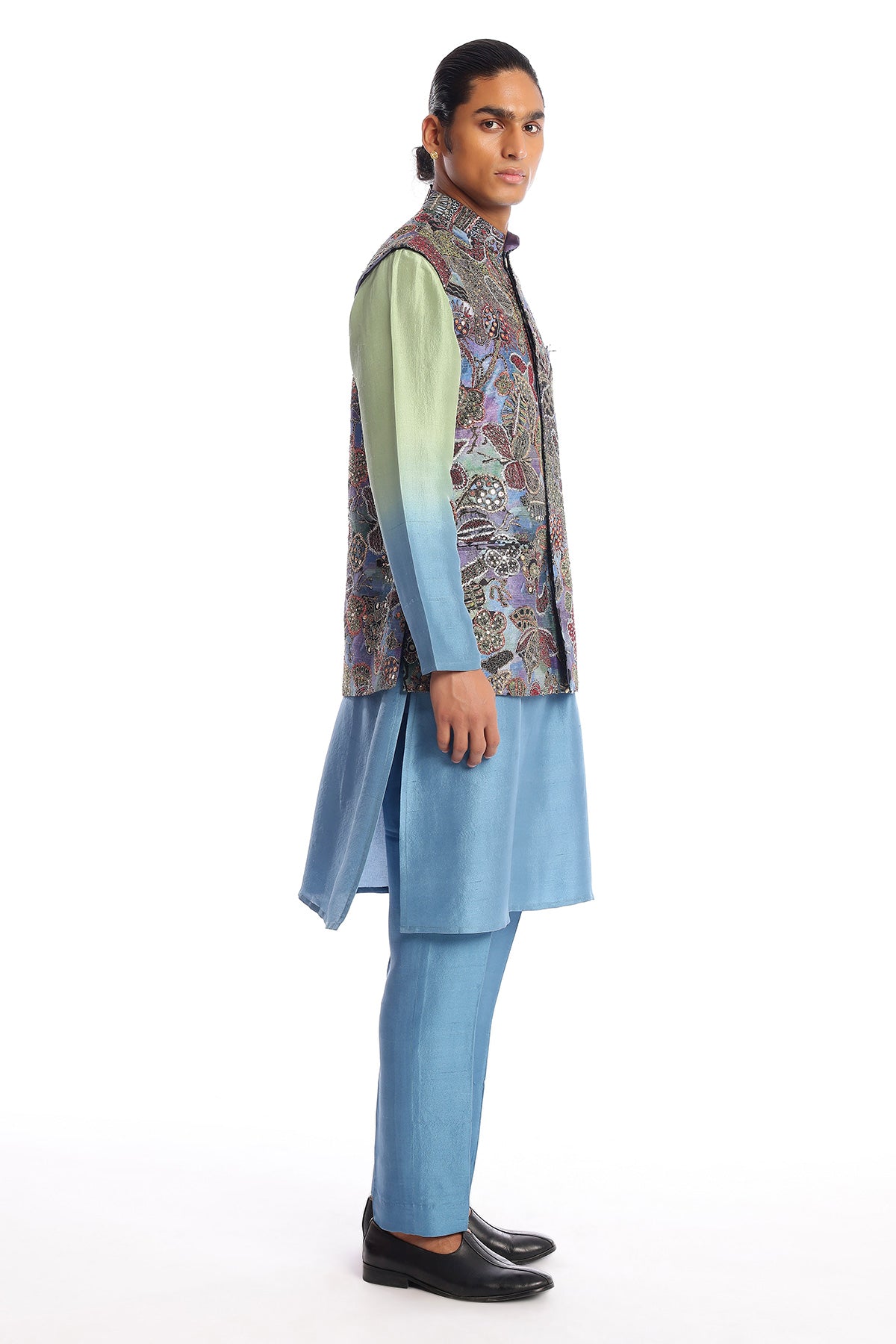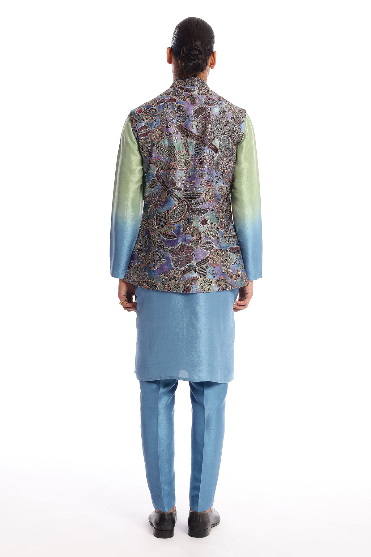 Kinfolk carolina blue printed embellished kora dupion bundi with green-blue ombre dupion silk kurta & straight pant