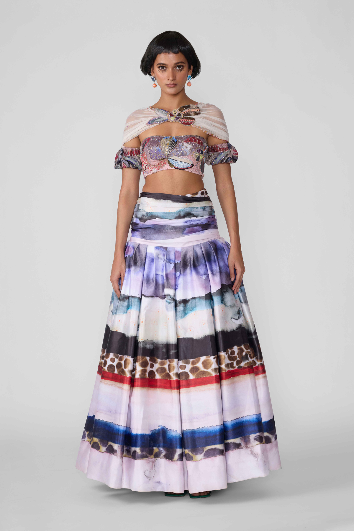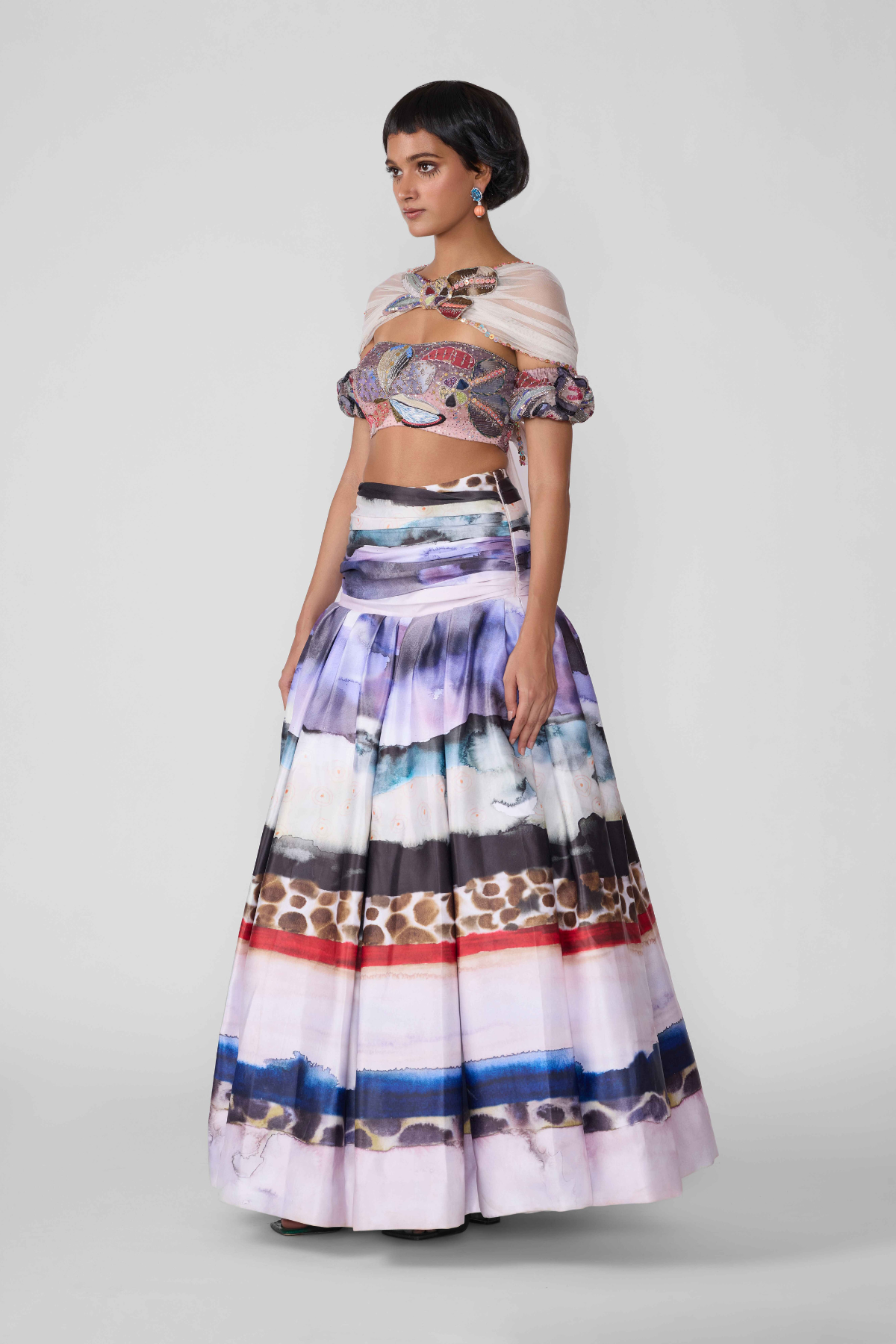 Kinfolk mist purple applique embellished organza off shoulder blouse with poly white out gathered ruched waist skirt and tulle dupatta.