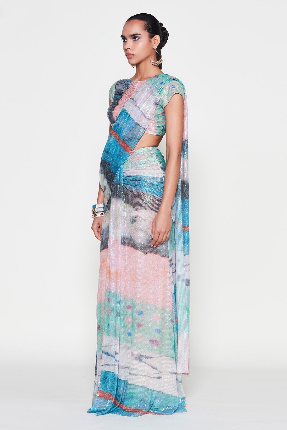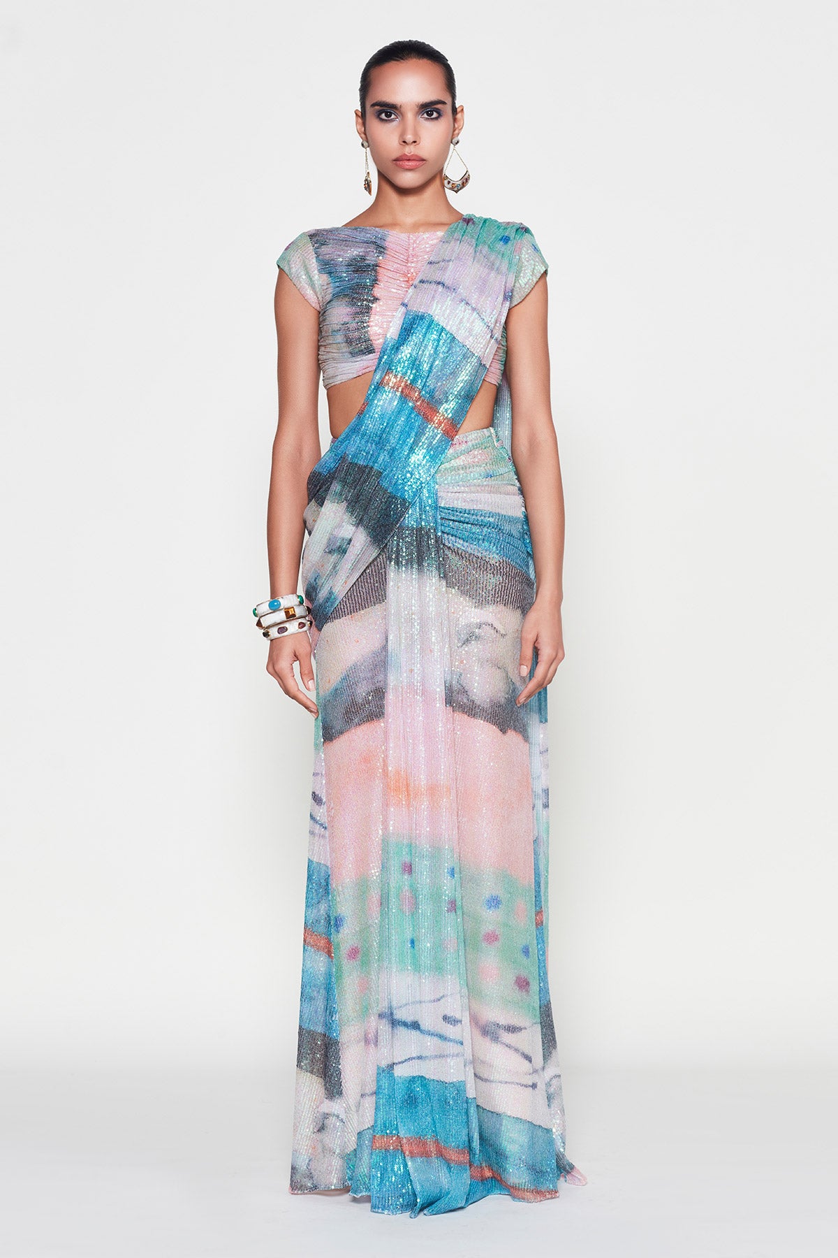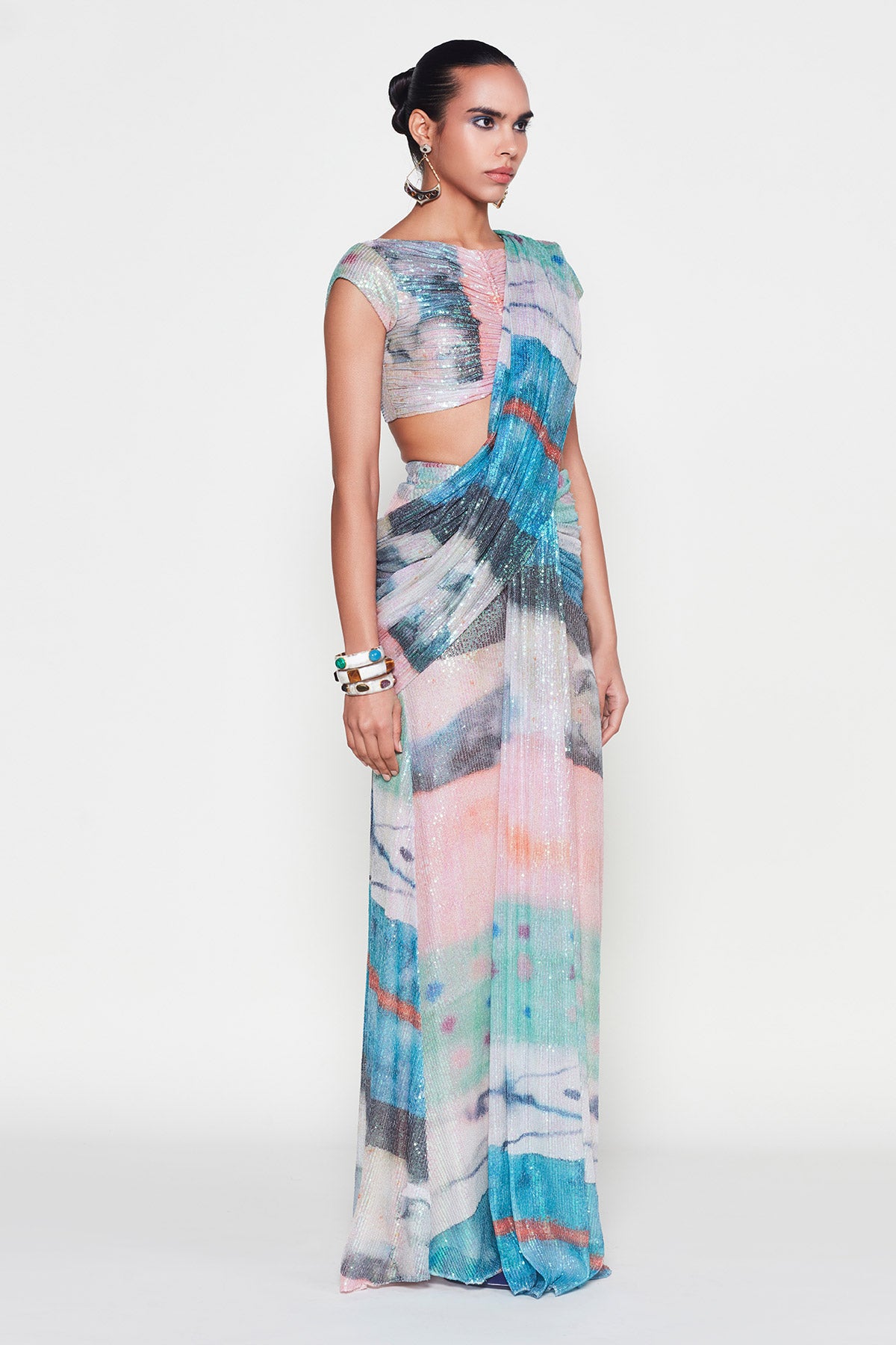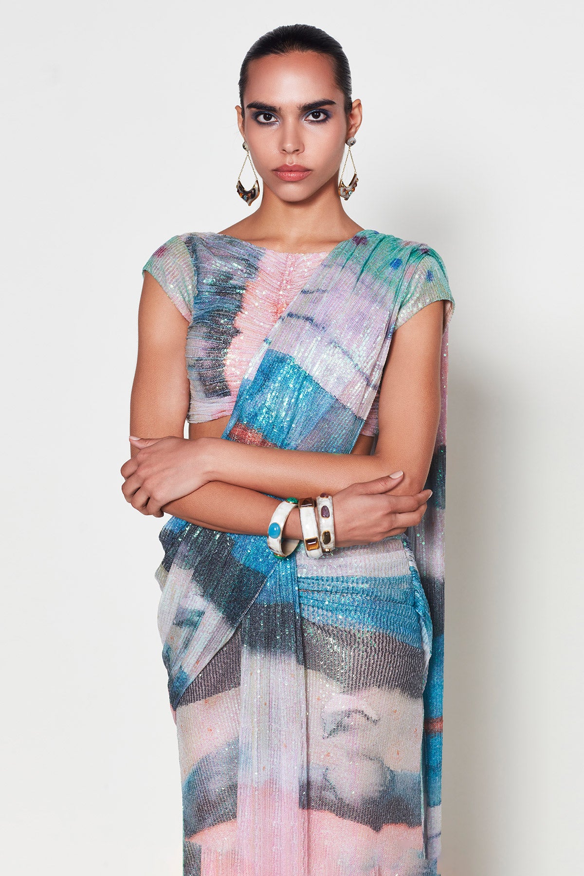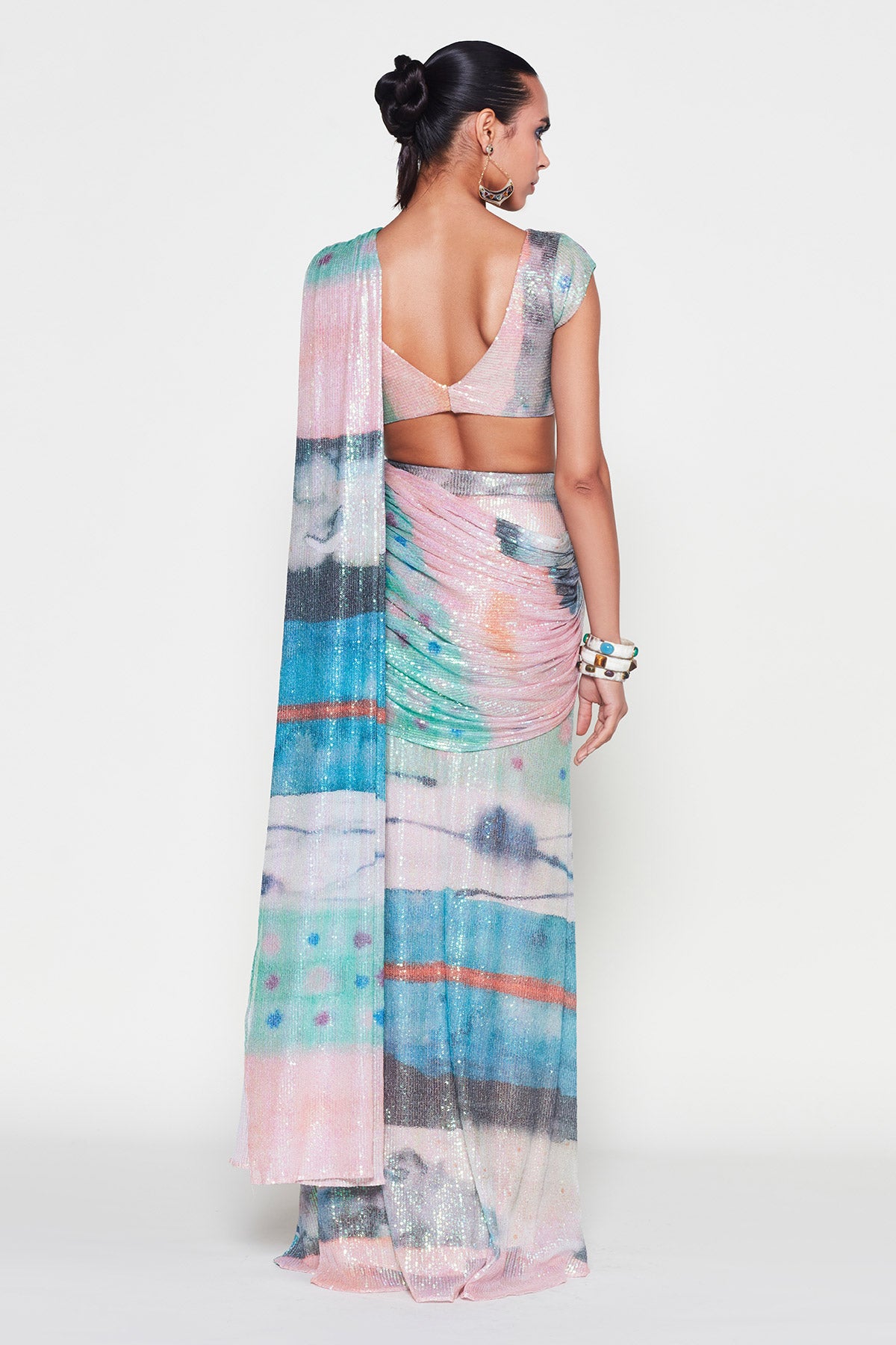 Kinfolk aurora printed sequin tulle pre drapped saree with centre gathered tie up blouse