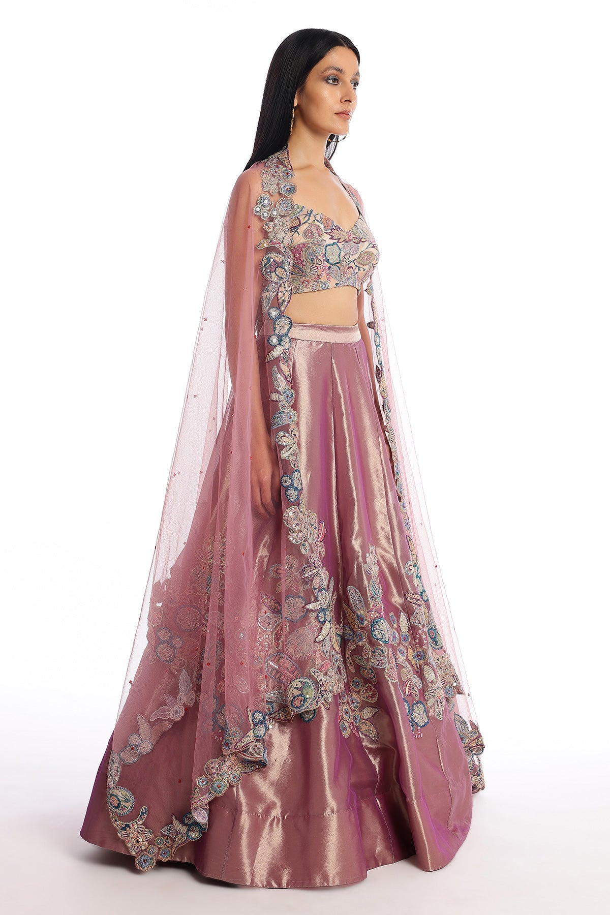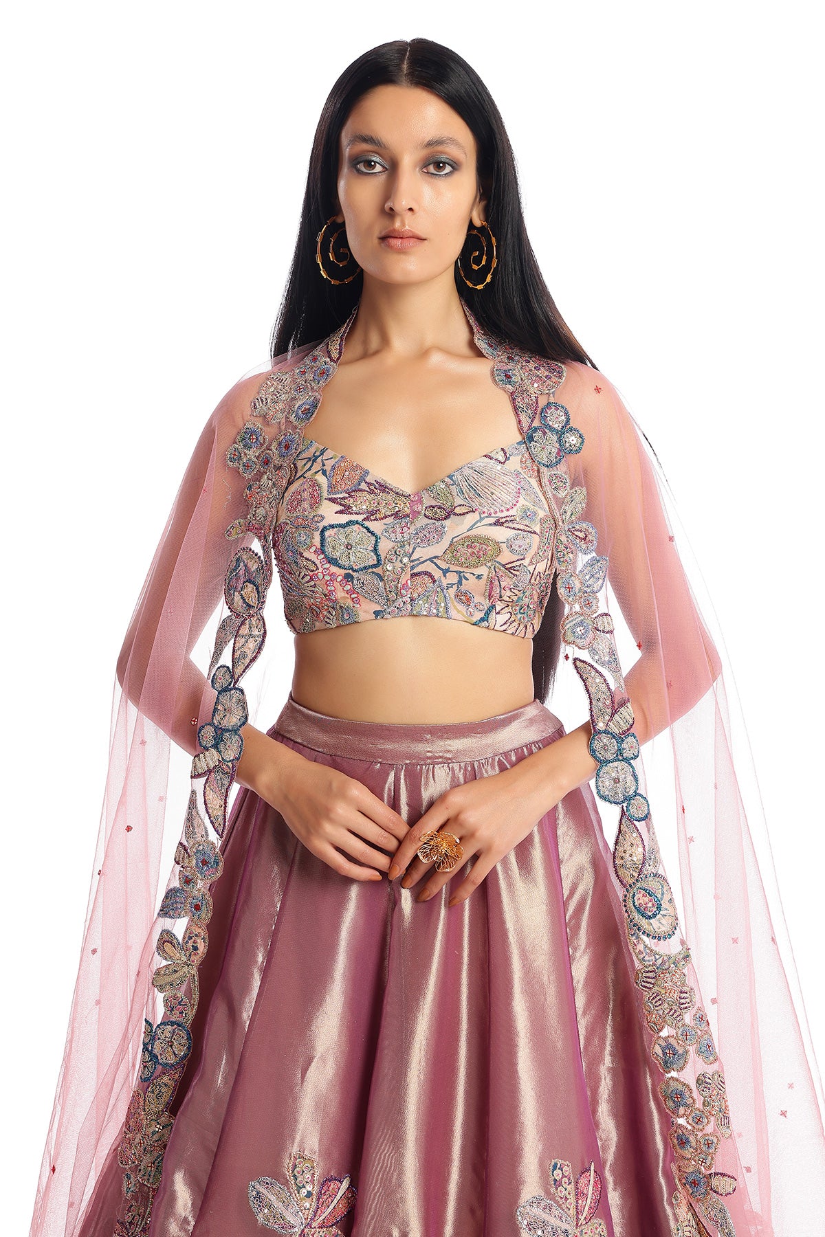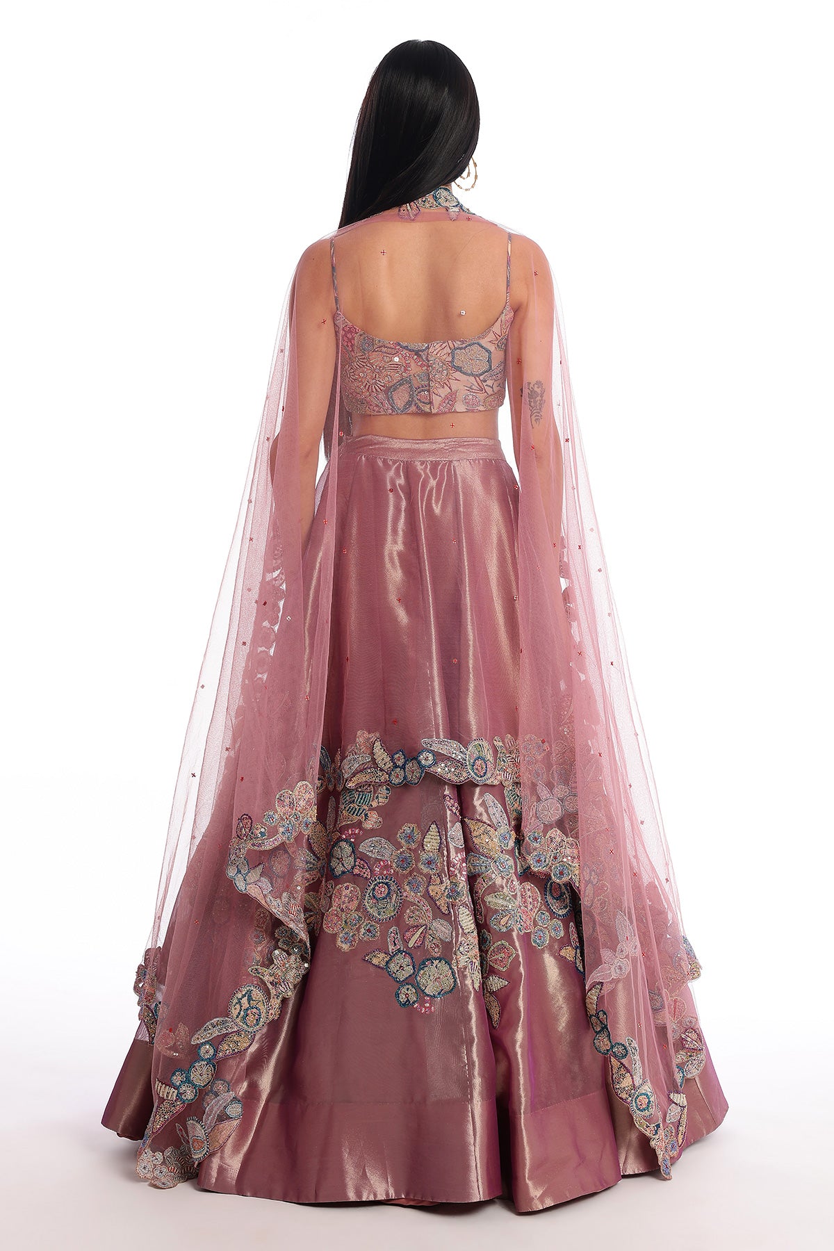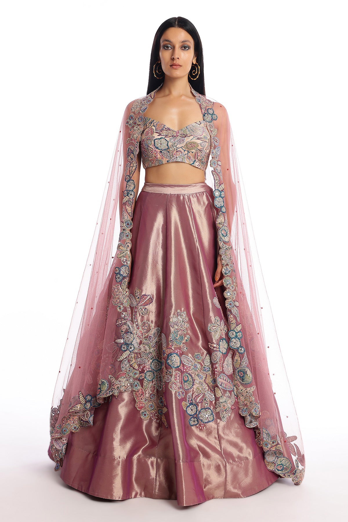 Kinfolk wine applique embellished tissue mk lehenga, blouse & tulle dupatta