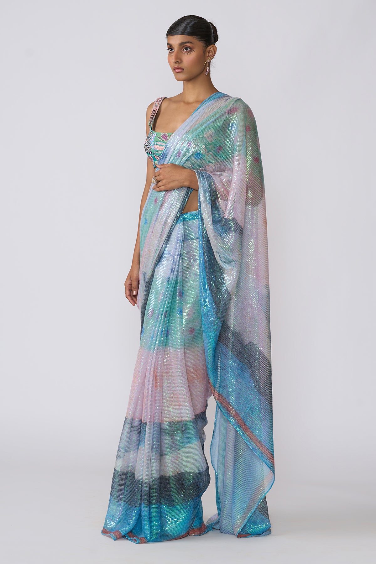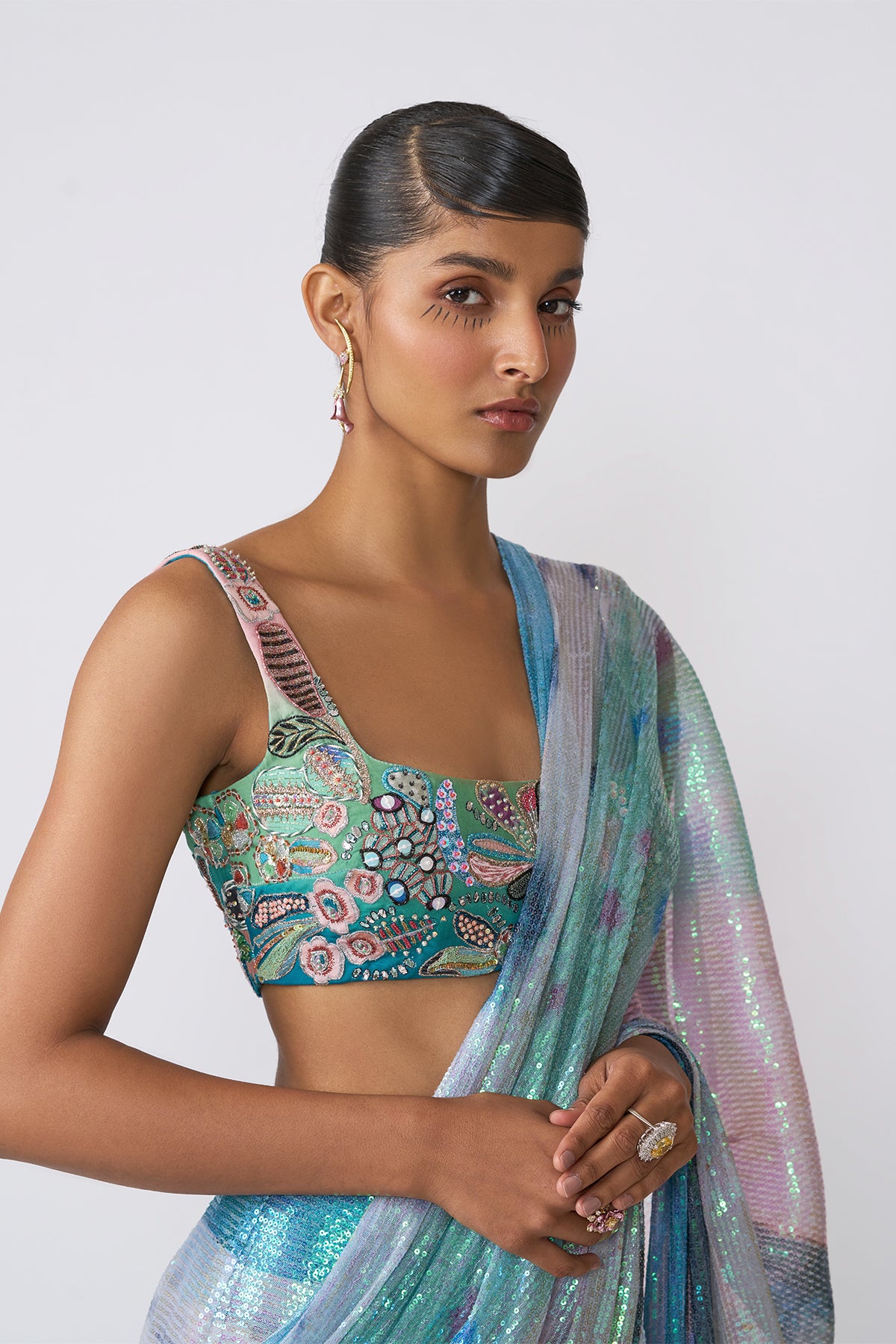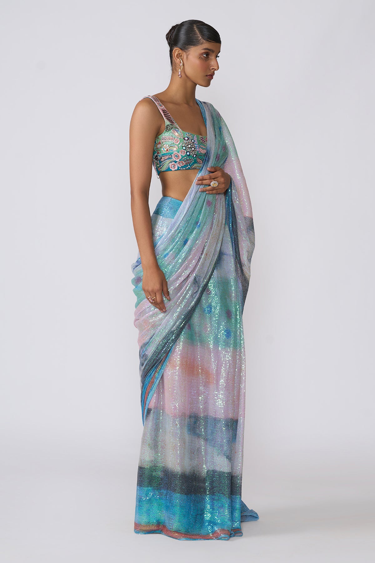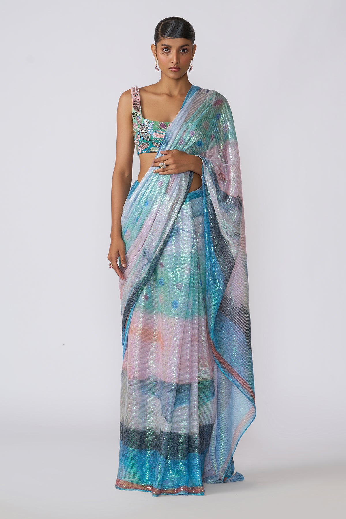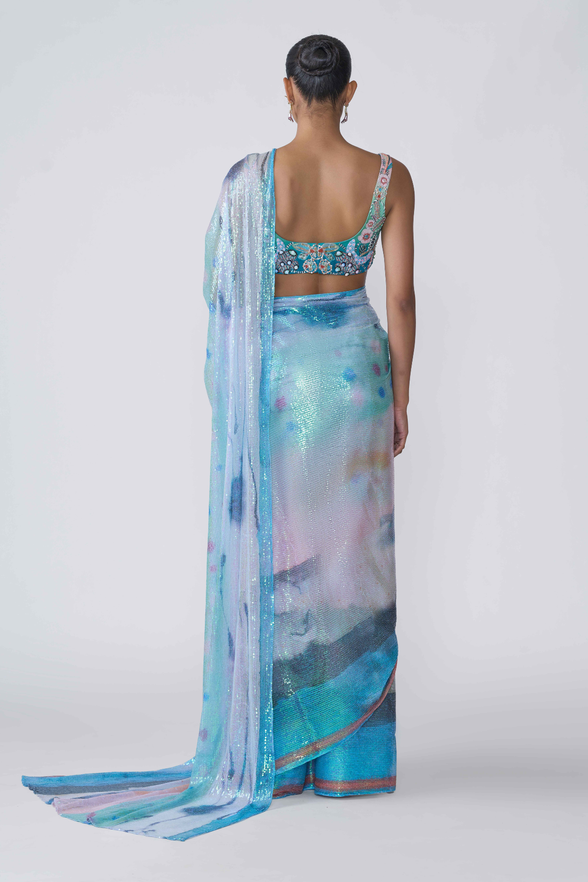 Kinfolk aurora printed sequin tulle draped saree with applique embellished blouse.