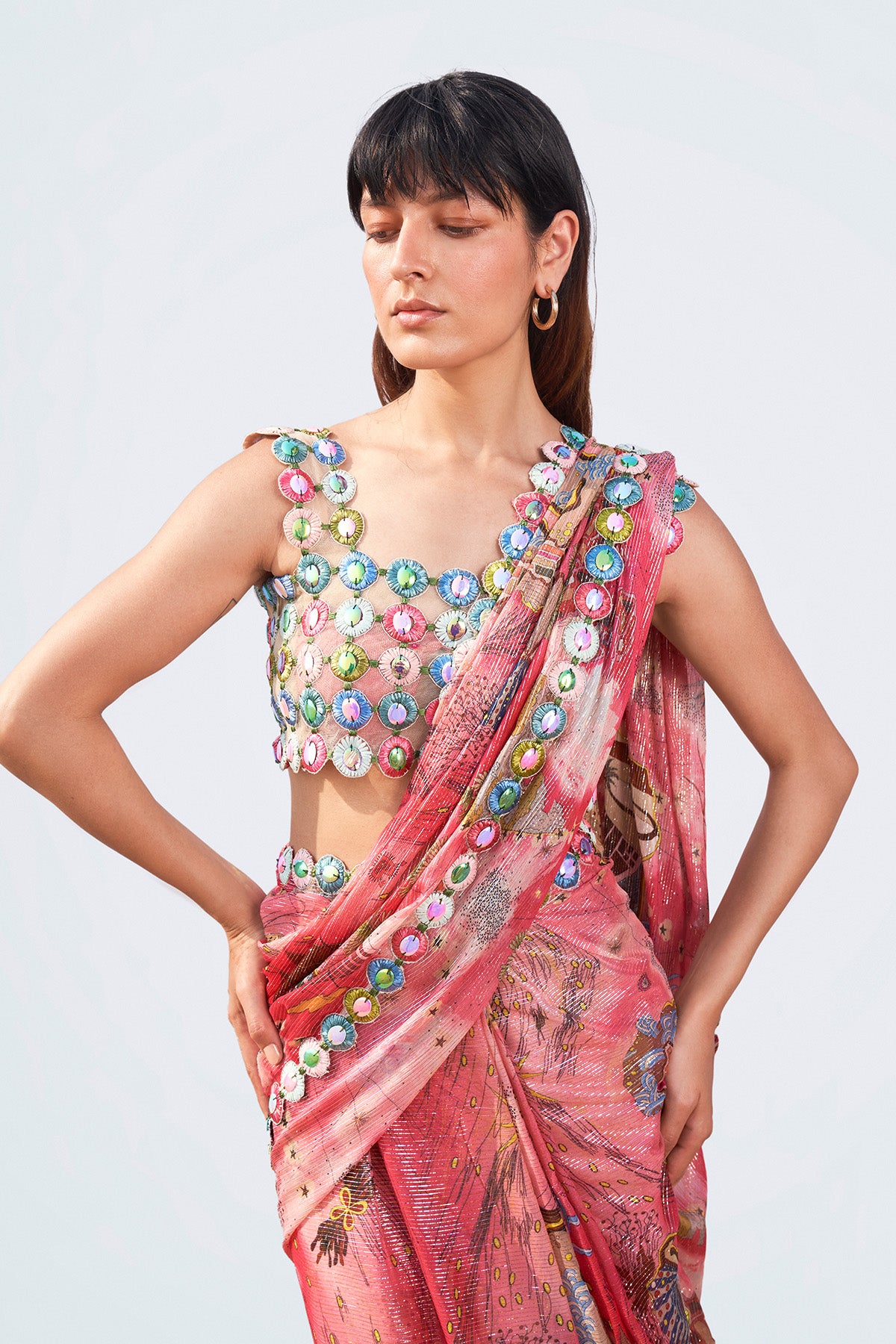 Viva Magenta Starboard & Port. Sequin appliqué detail short saree tunic. Featuring sea shell handmade trim on the V-neckline. High waist trousers with side pockets.