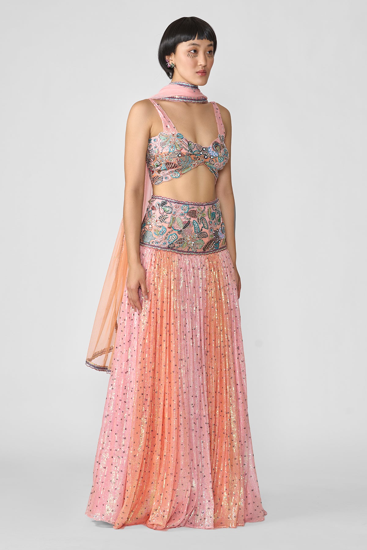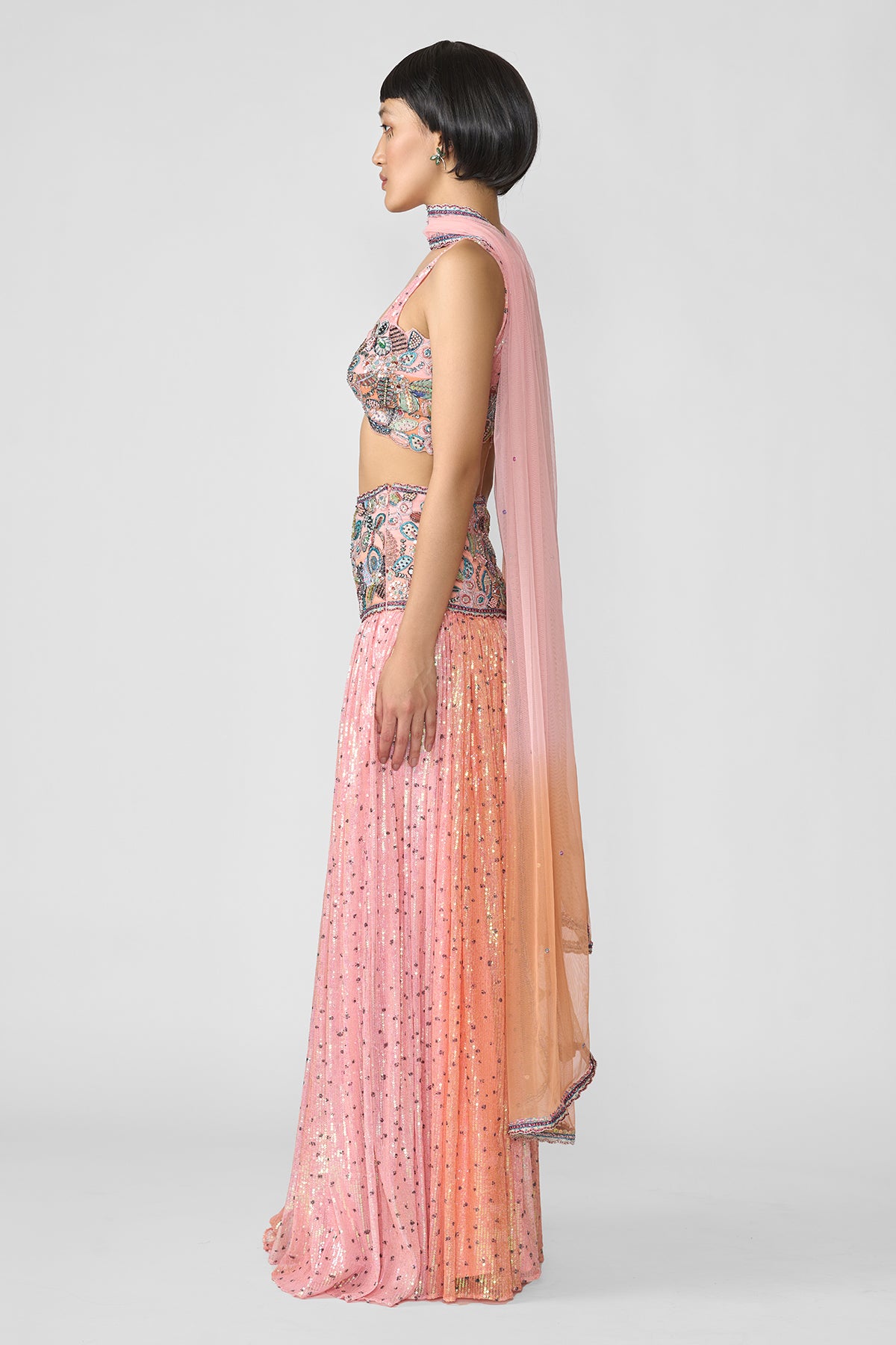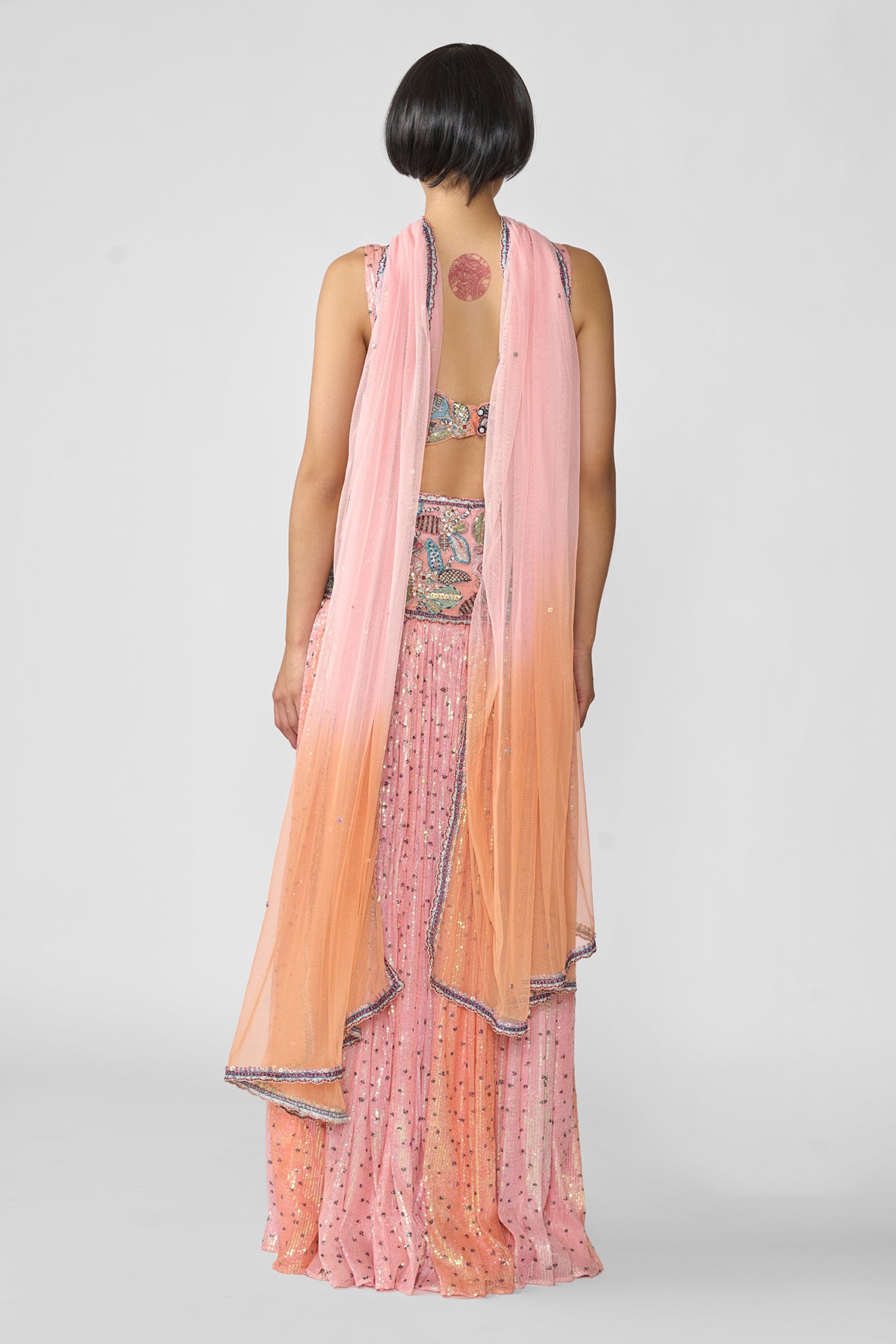 Kinfolk peach-orange ombre printed applique embellished tulle net blouse with yoke waist sequin tulle gathered lehenga & tulle dupatta.
