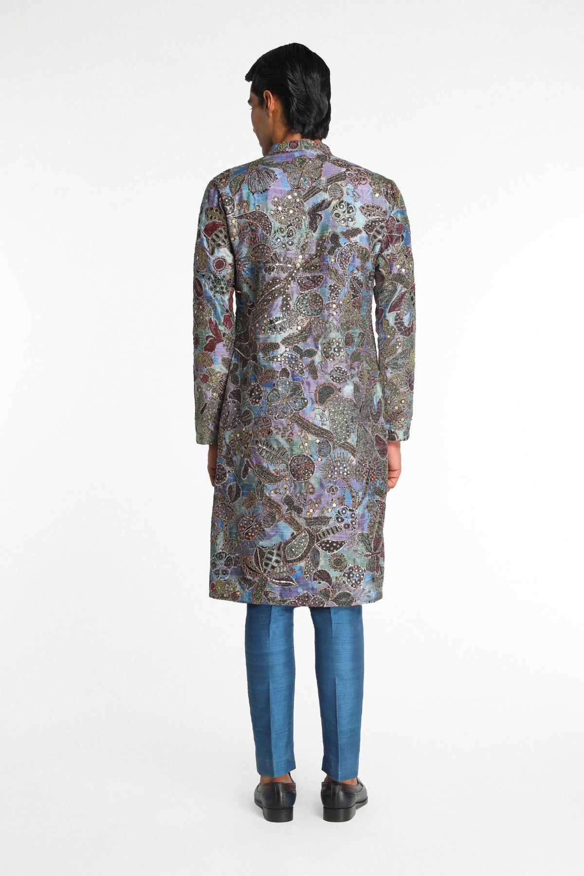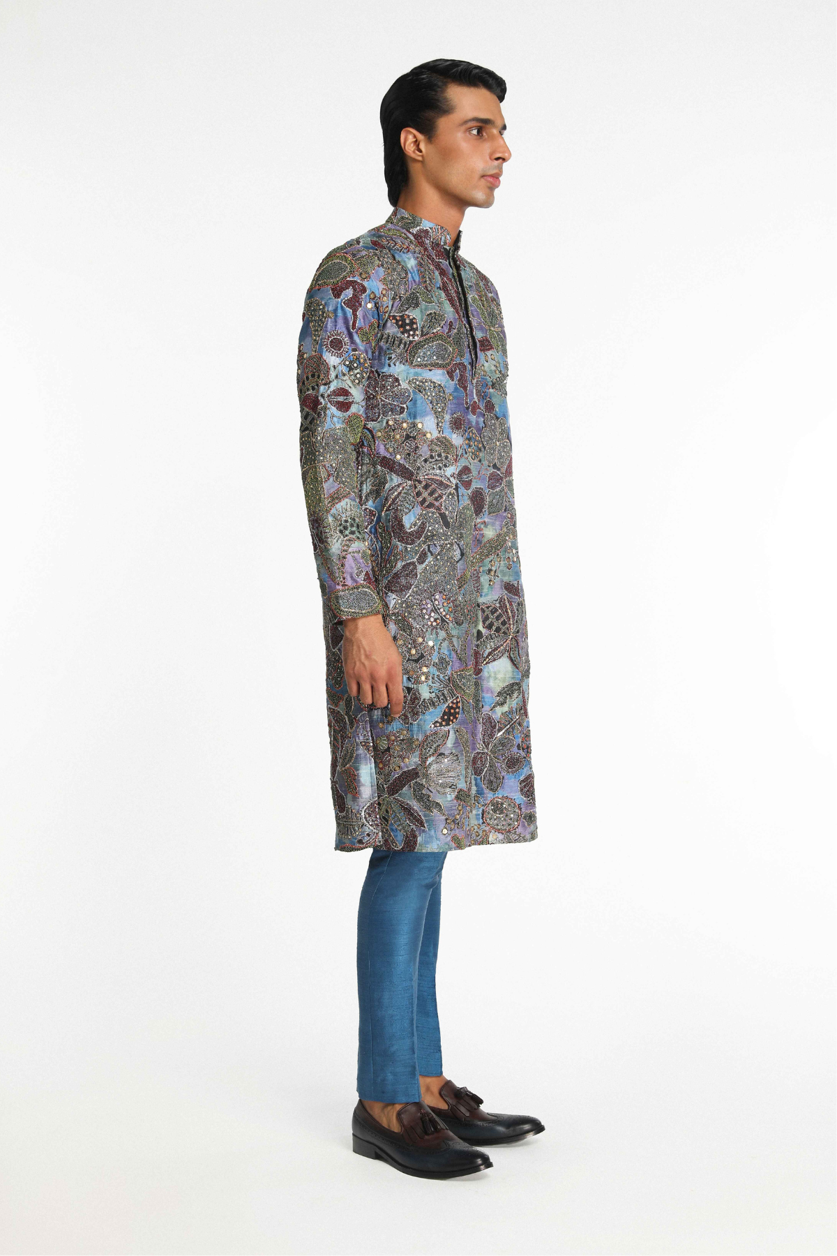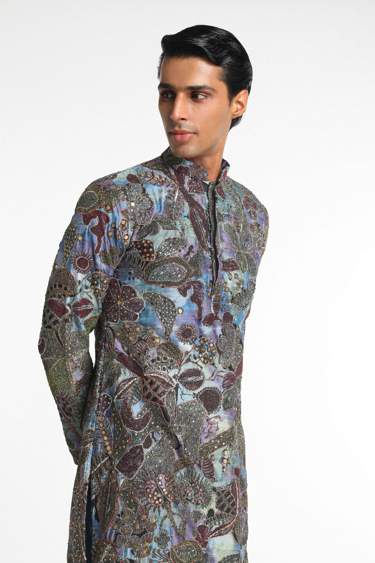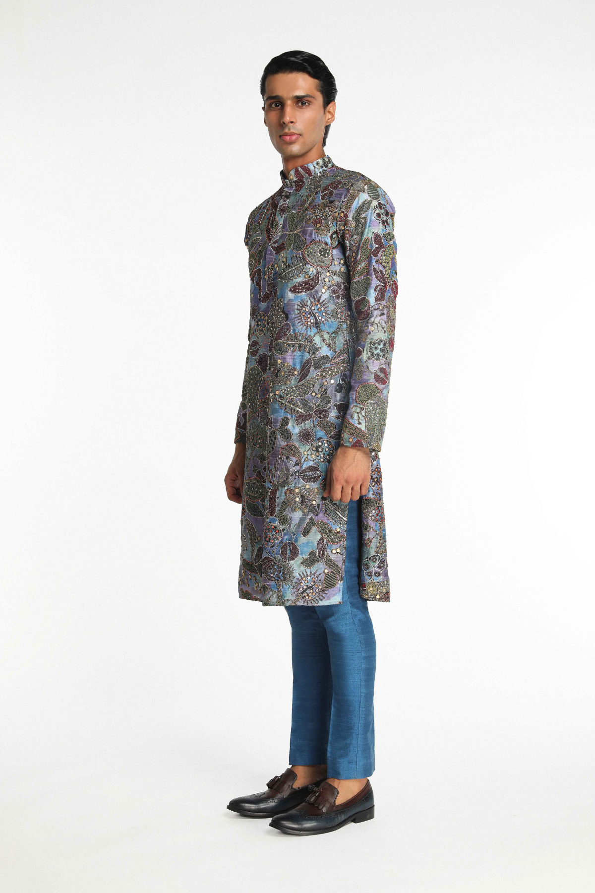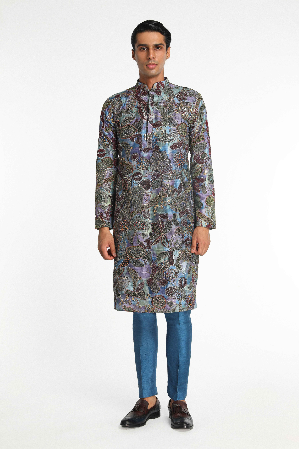 Kinfolk Sapphire blue printed embellished raw silk kurta & straight pant
