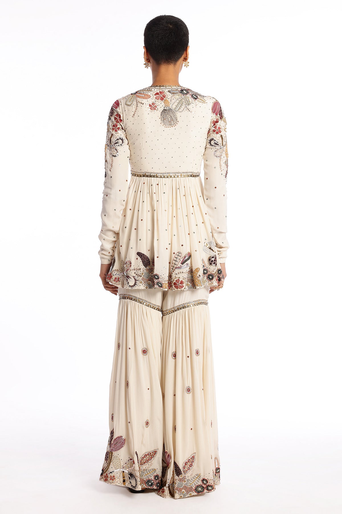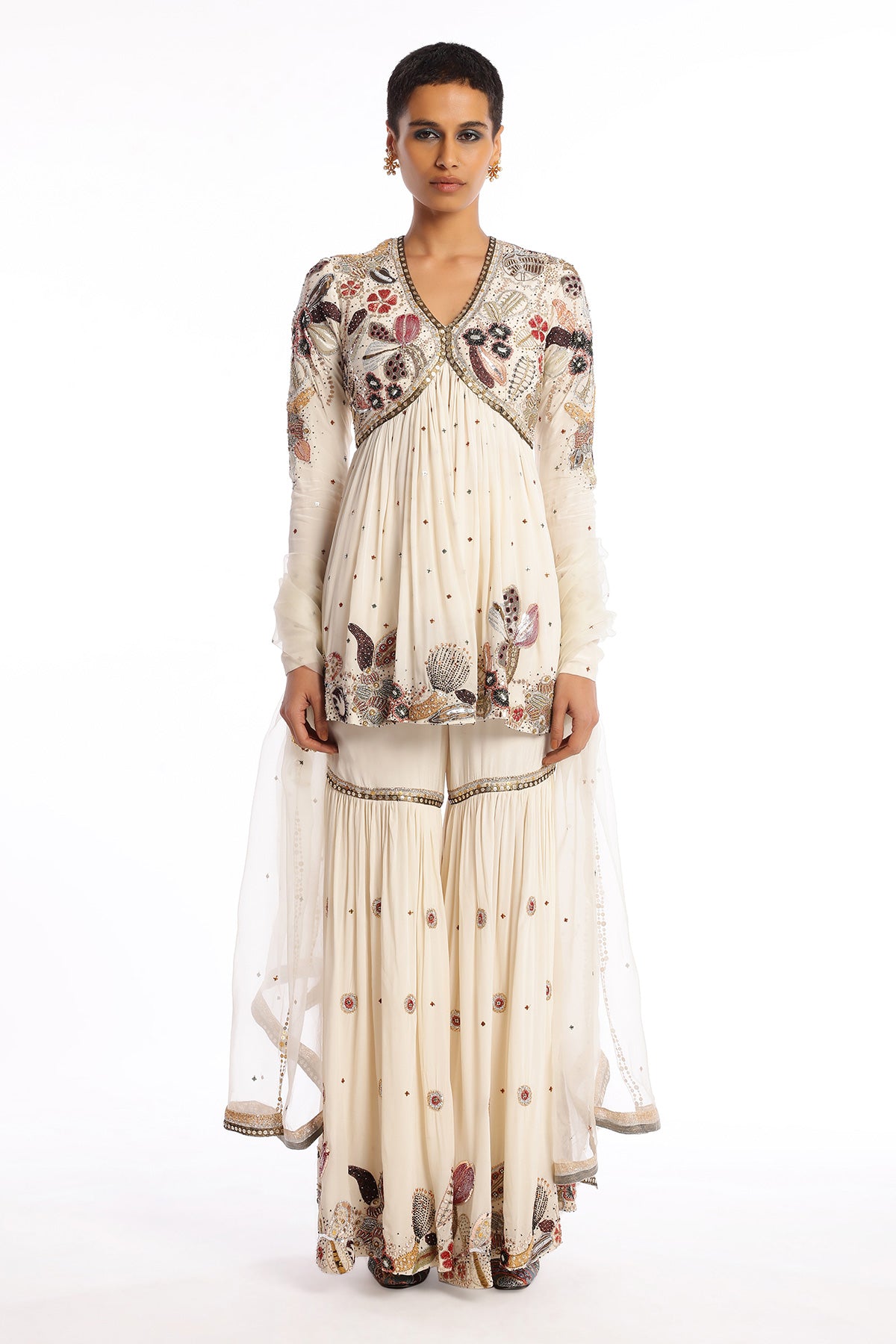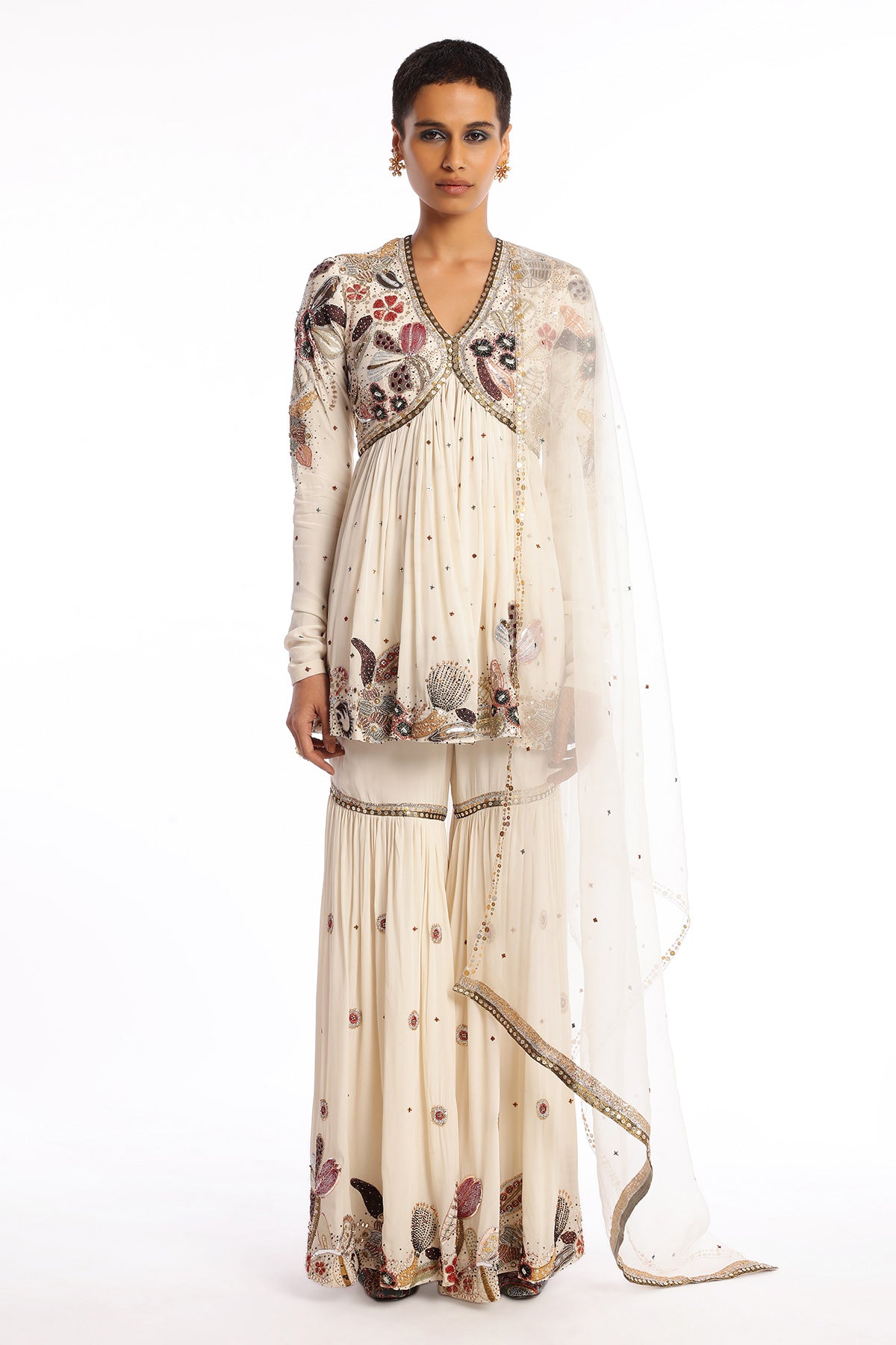 Kinfolk ivory applique embellished mulberry crepe kurta, gharara with organza dupatta