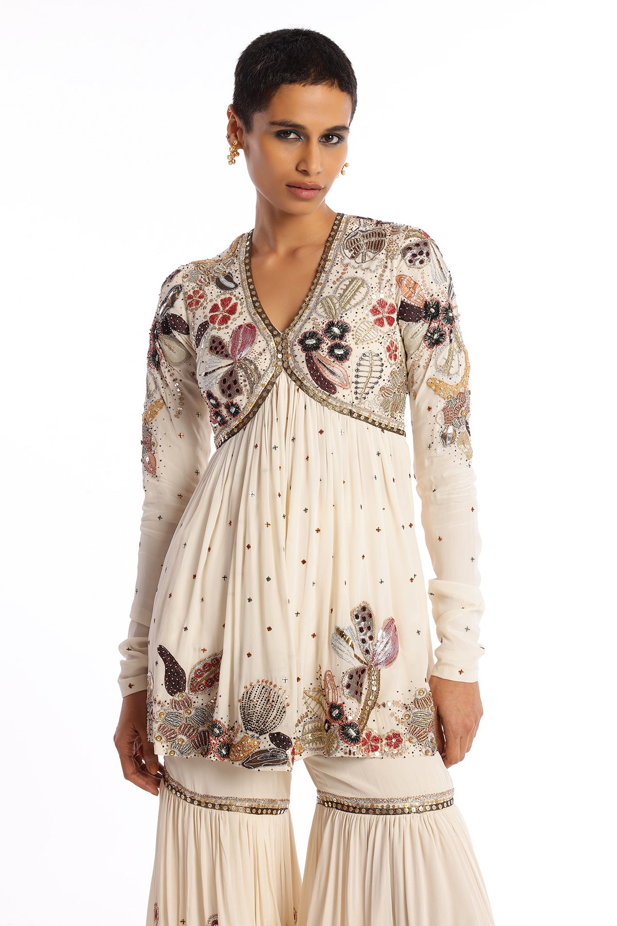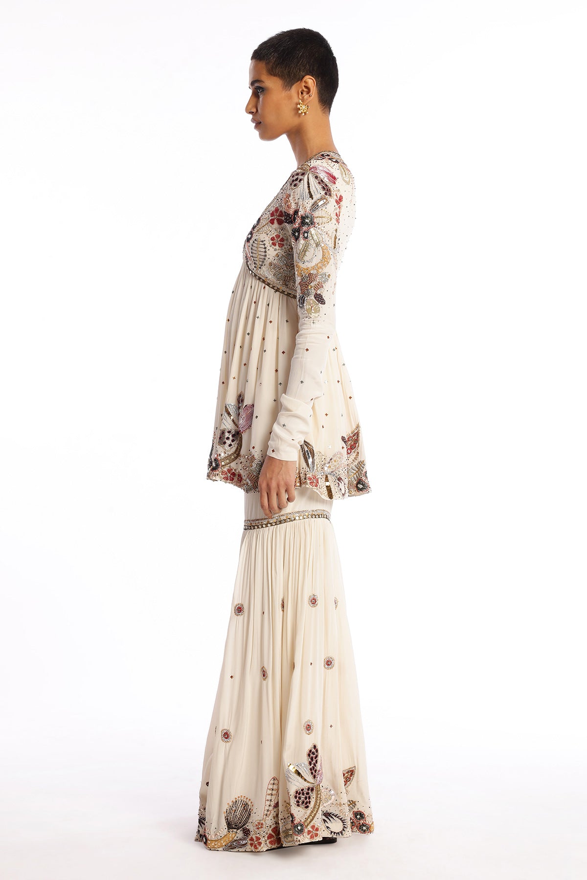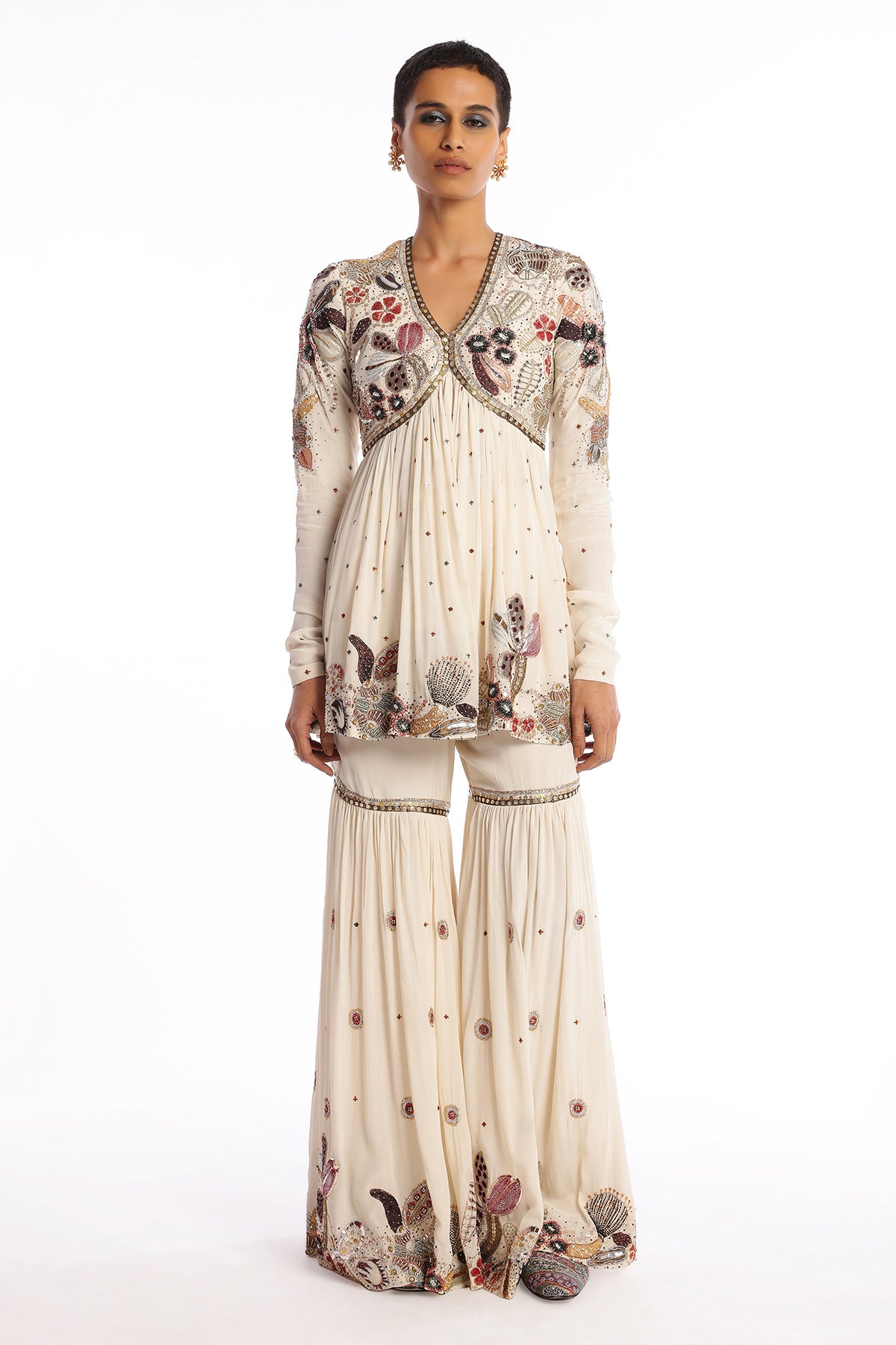 Kinfolk ivory applique embellished mulberry crepe kurta, gharara with organza dupatta