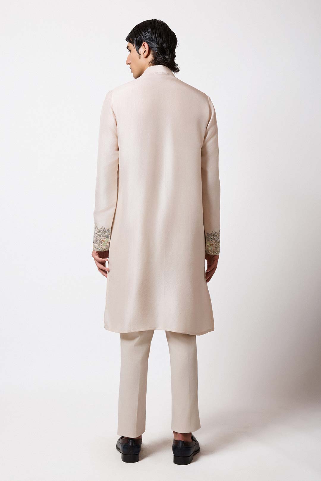Matilda Ivory Applique Embellished Dupion Silk Scallop Placket Kurta Pants.