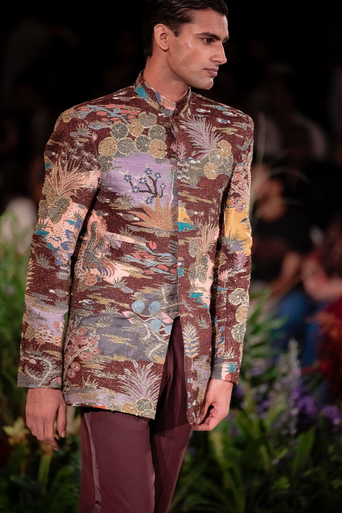 Wild At Heart Teakberry Printed Applique Embellished Raw Silk Bandhgala