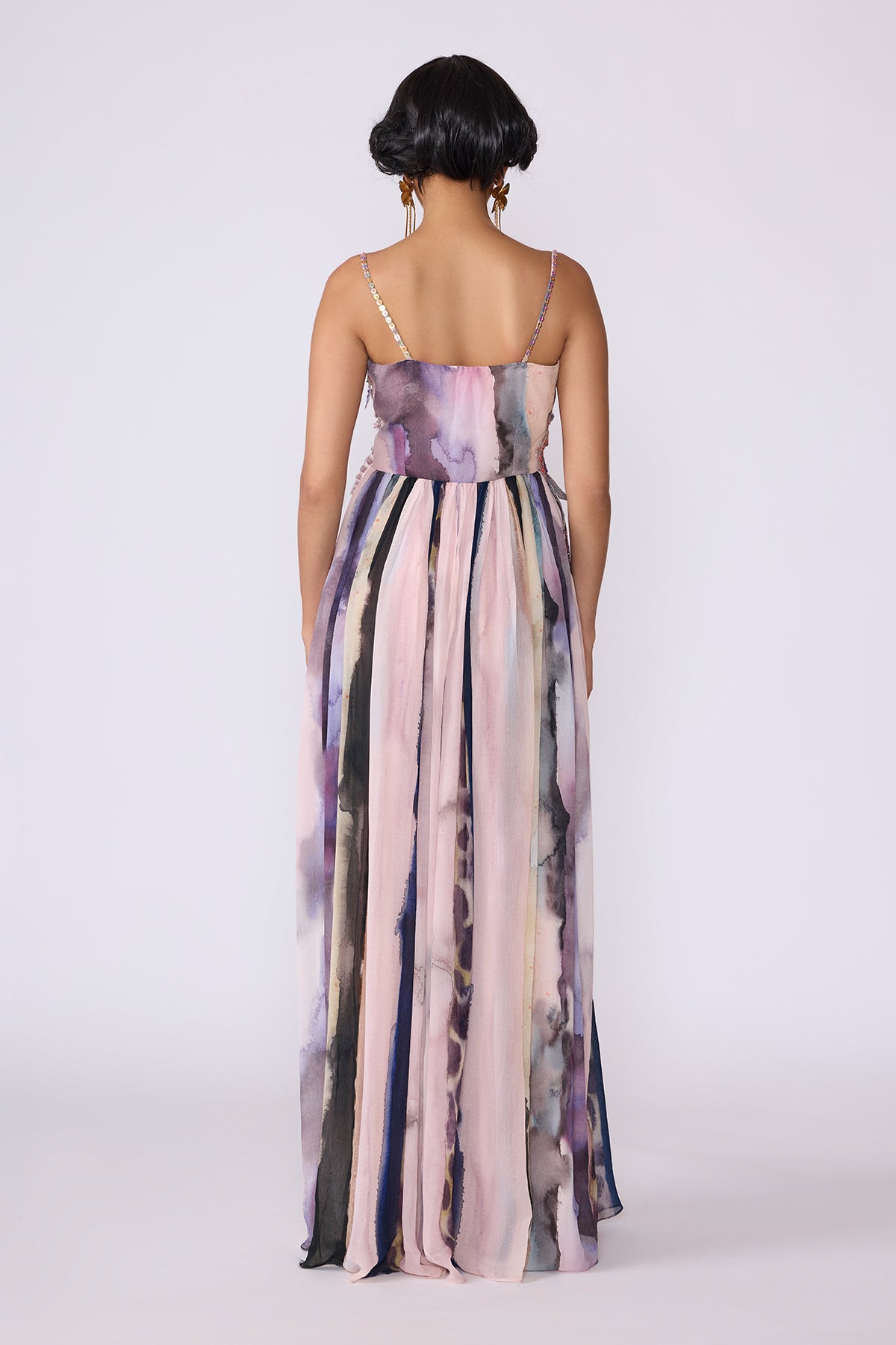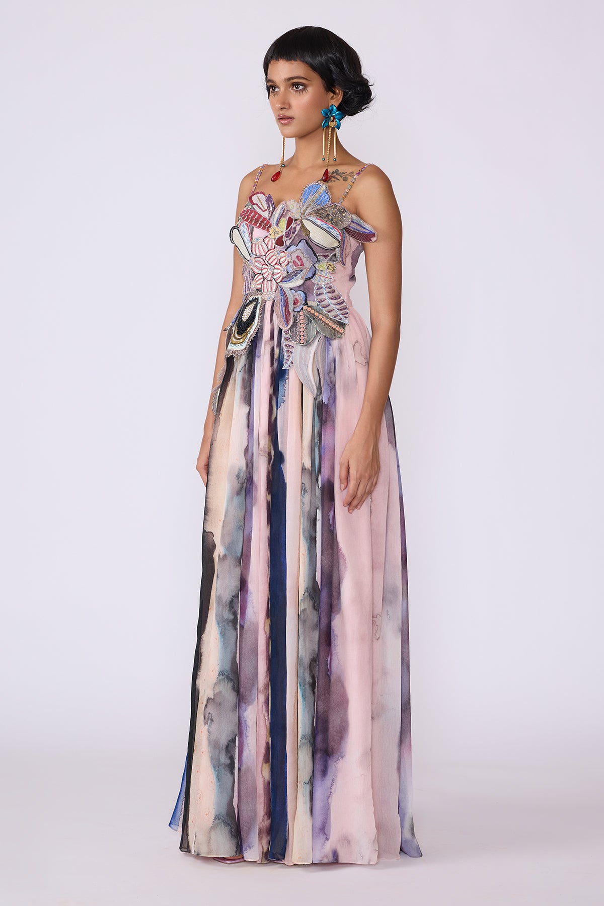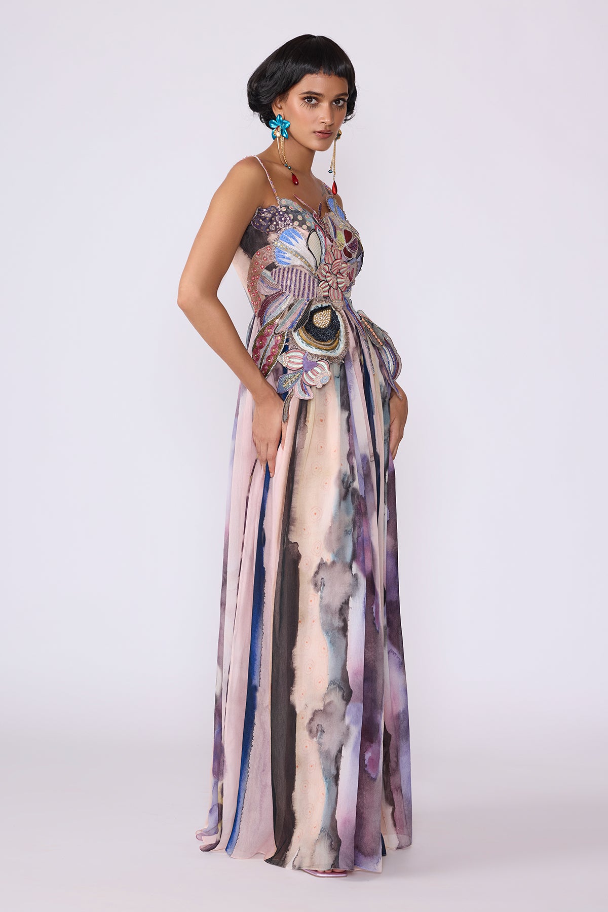 Kinfolk mist purple applique 3D embellished flower cupro gathered skirt strap gown