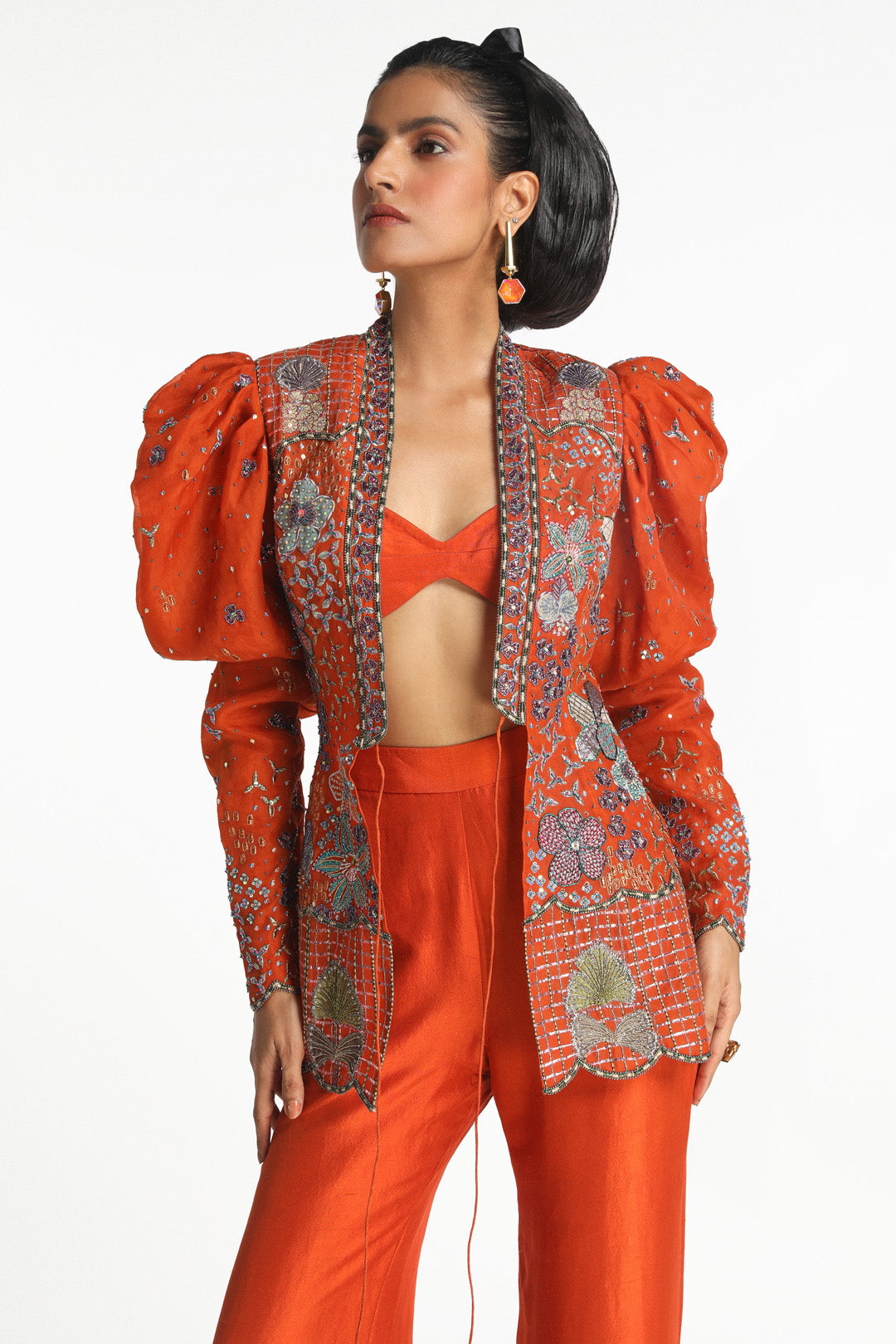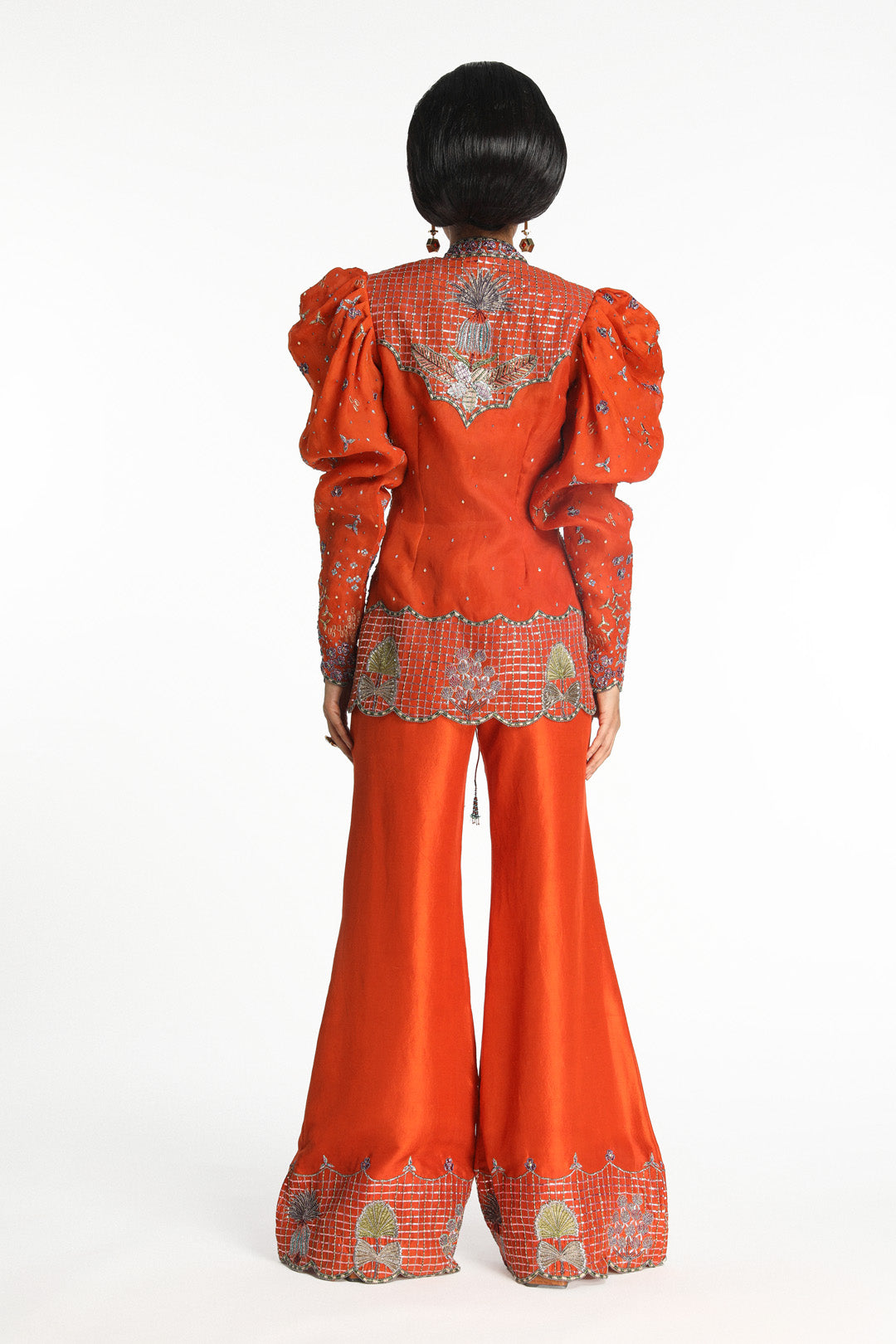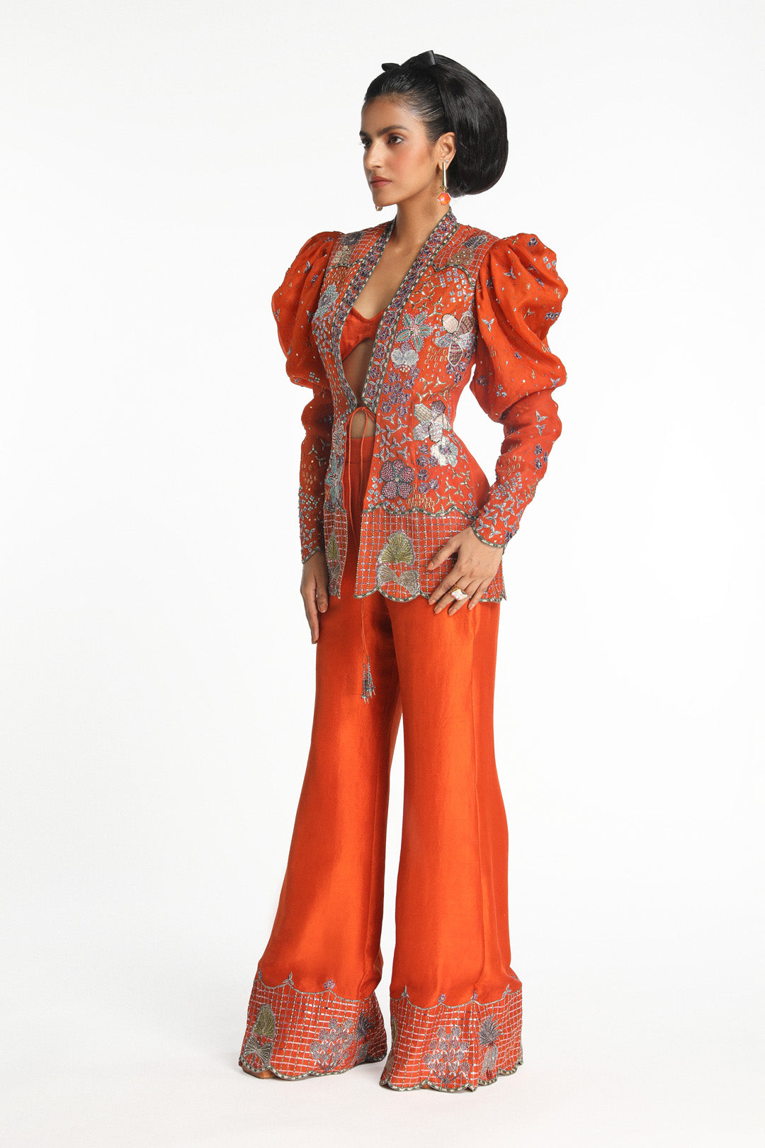 Matilda burnt orange applique embellished organza leg o'mutton sleeve jacket with dupion silk pants & bustier.