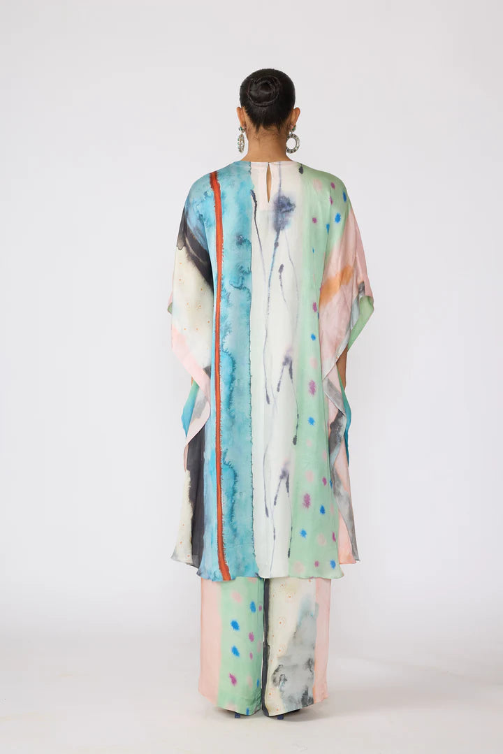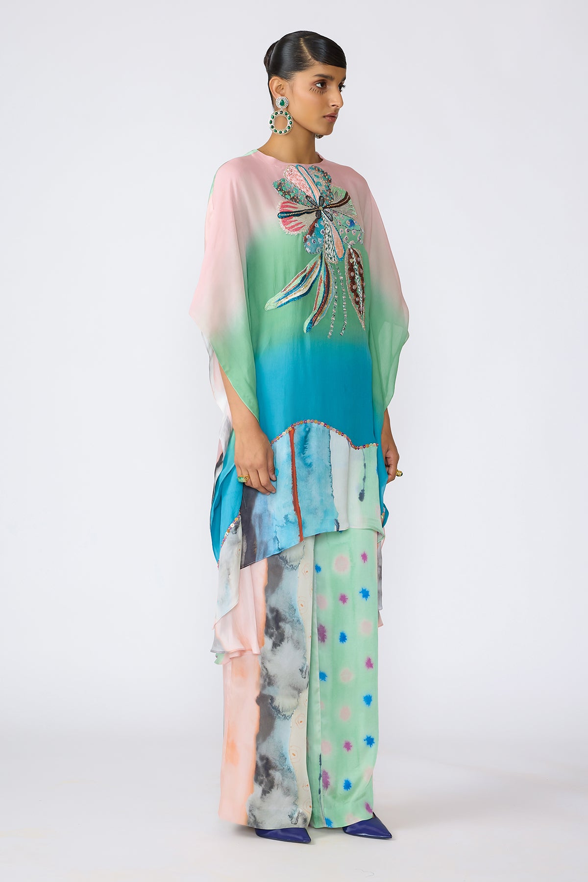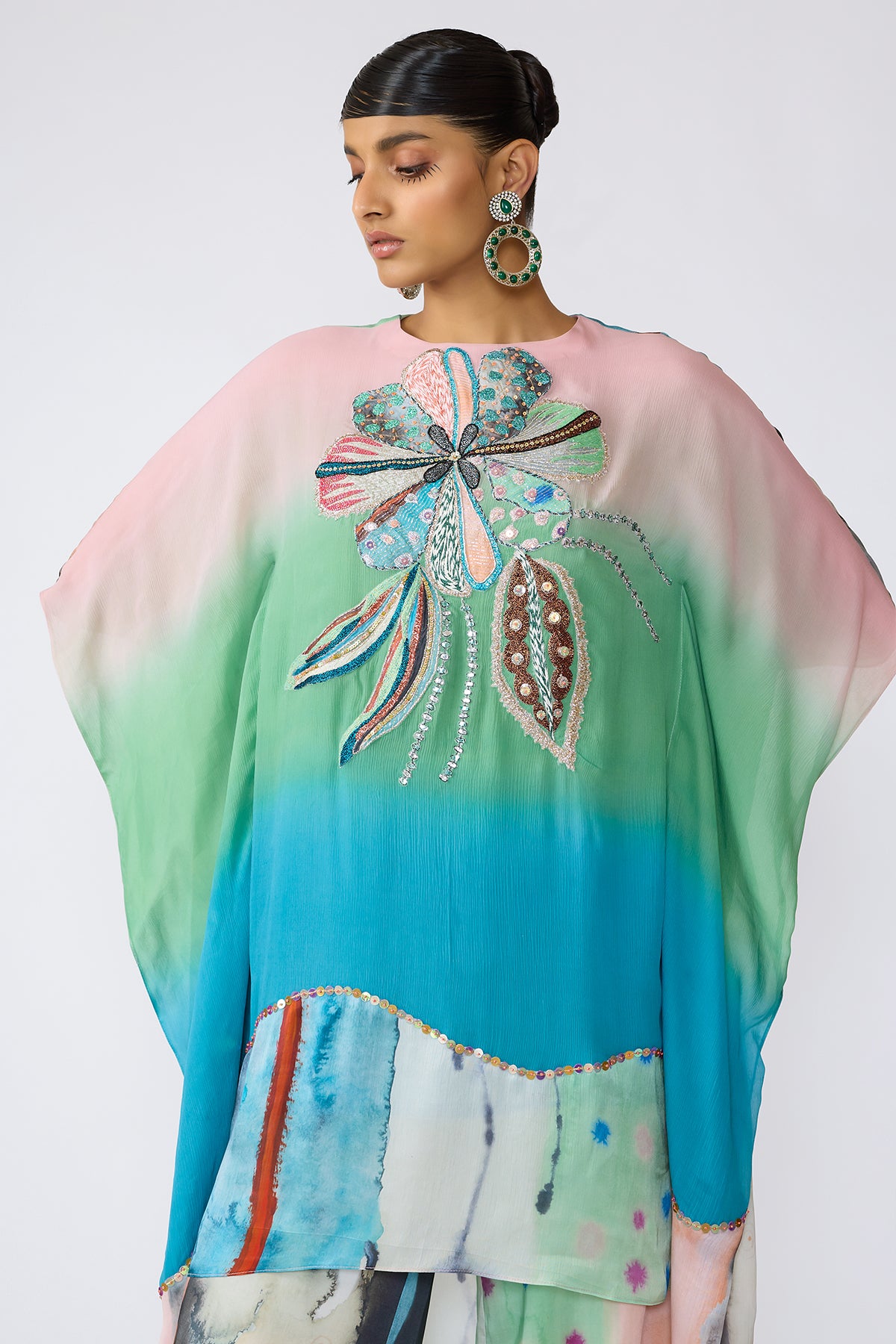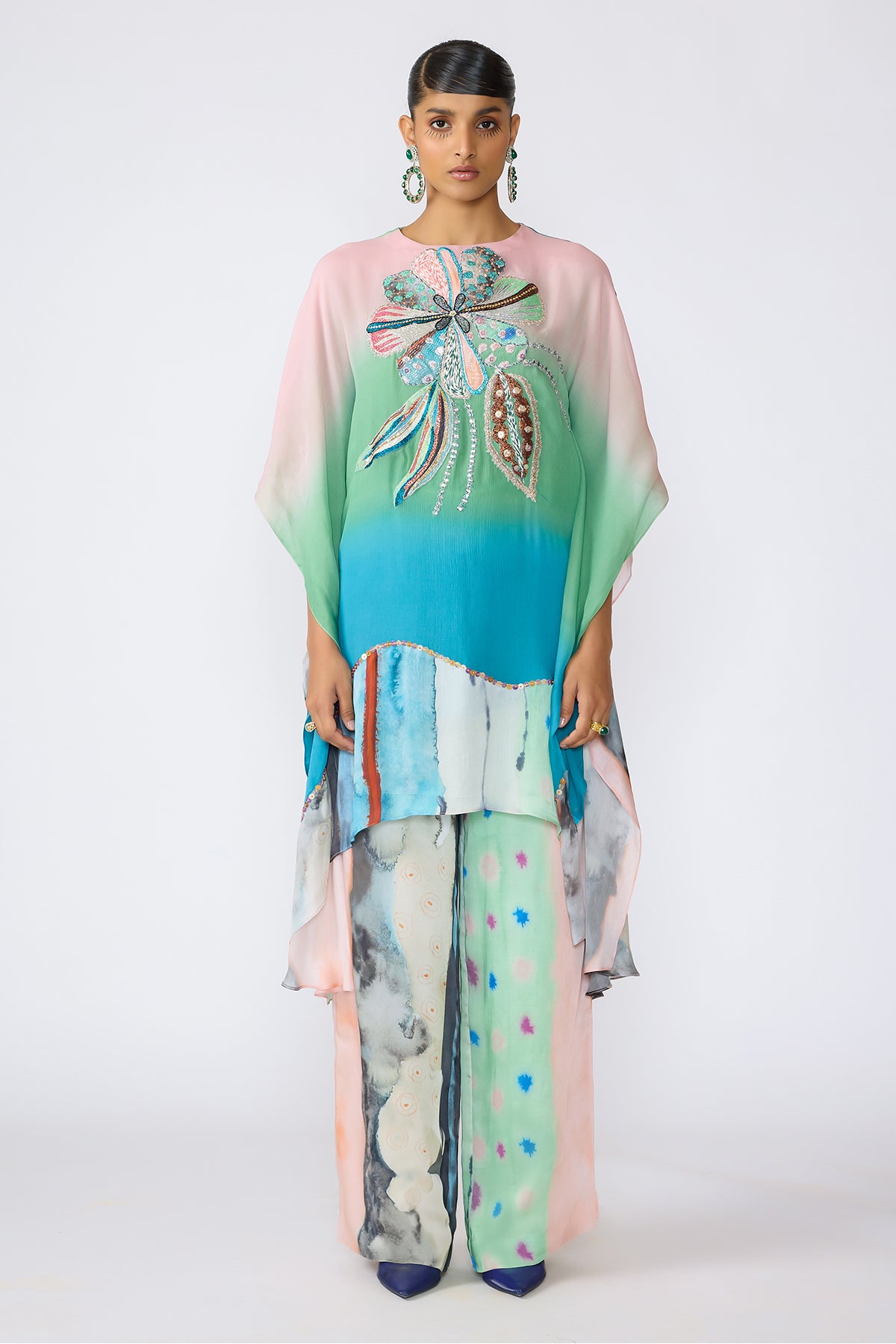 Kinfolk aurora ombre printed applique embellished chiffon satin short kurta with pants & bustier.