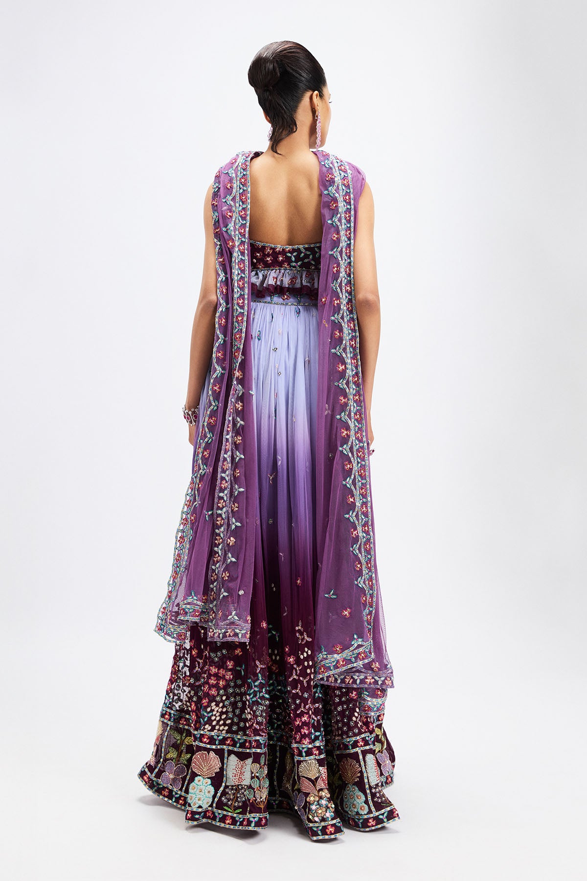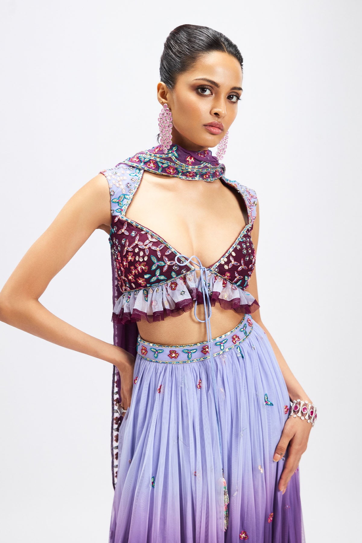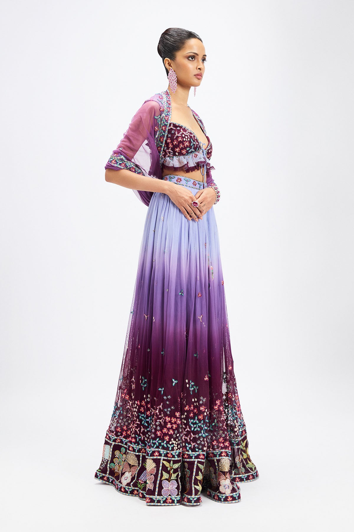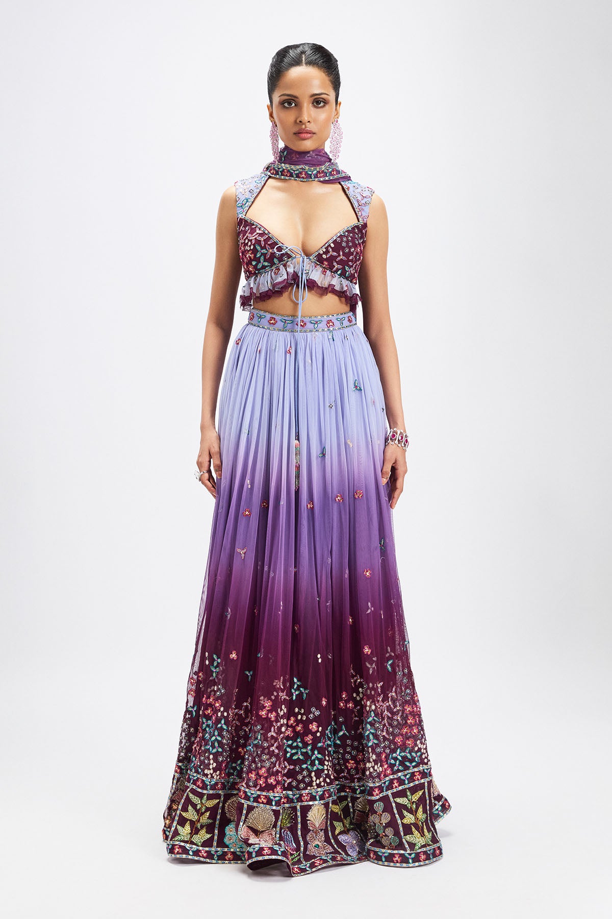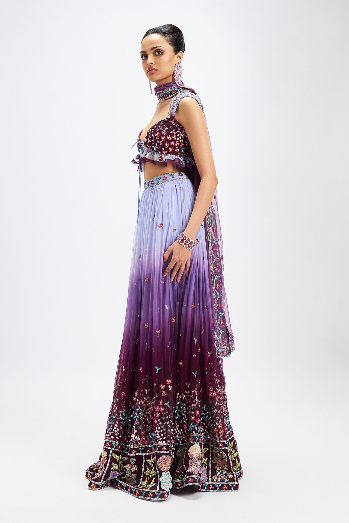 Matilda Plum- dusk blue applique embellished tulle net lehenga with ruffle drawstring
