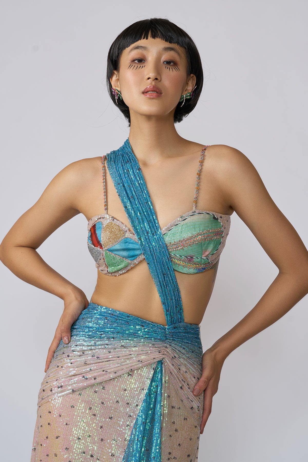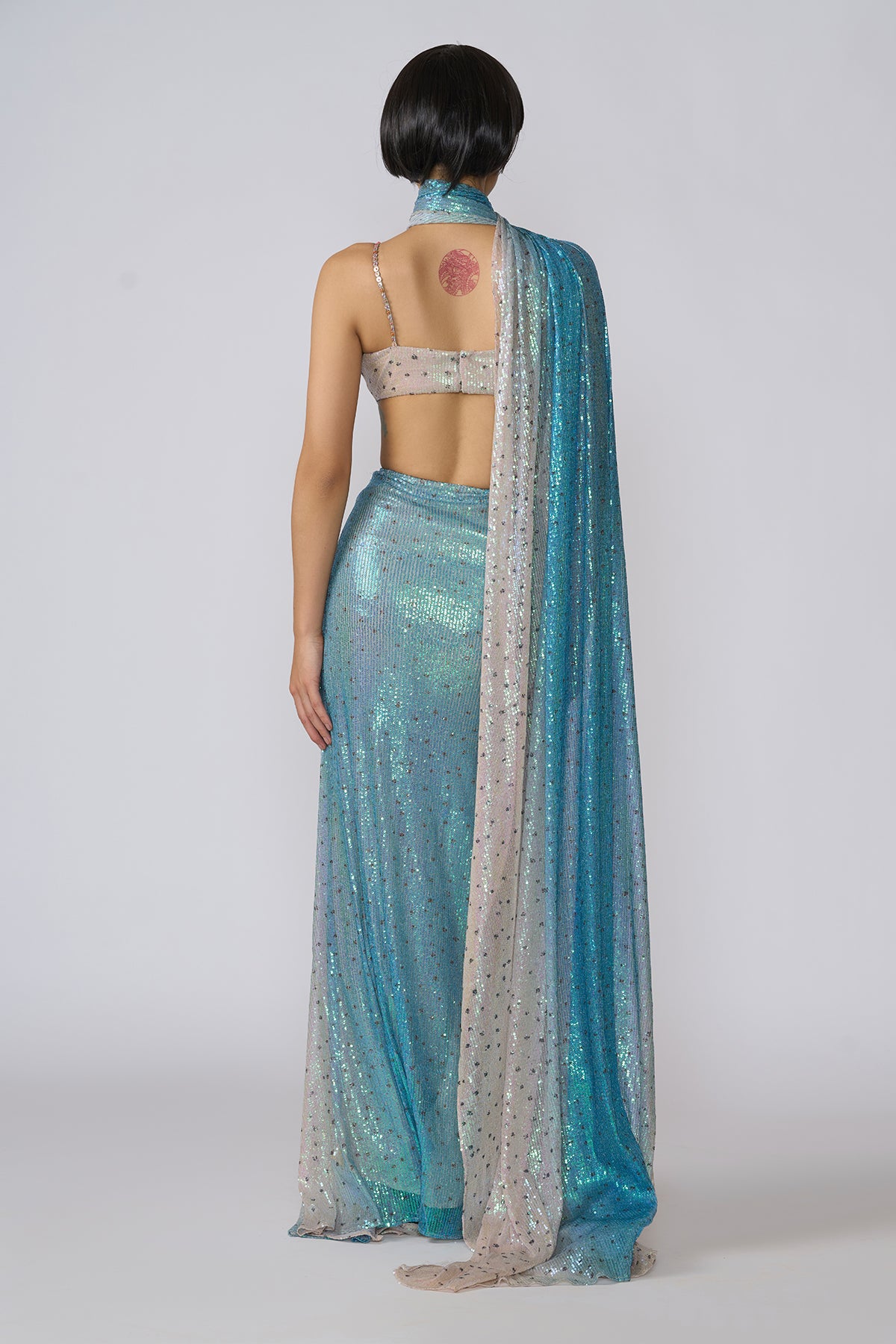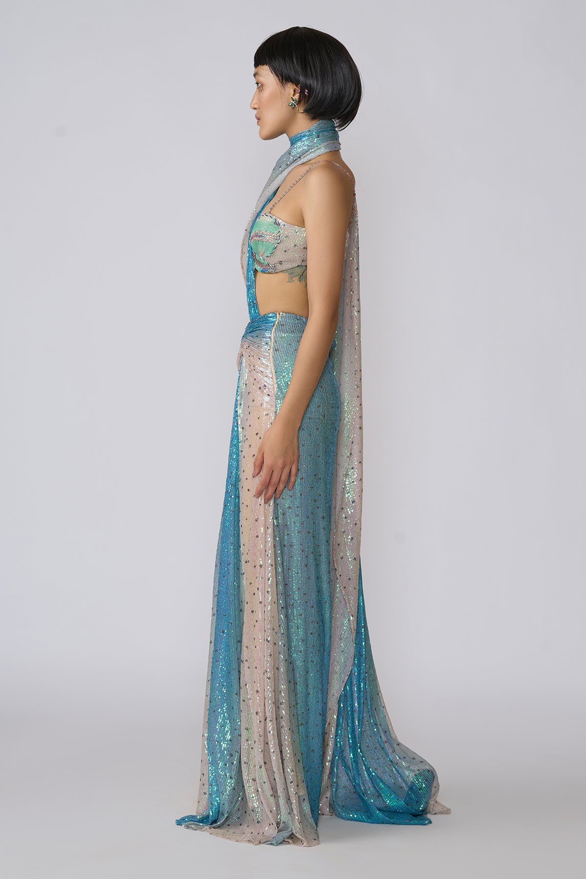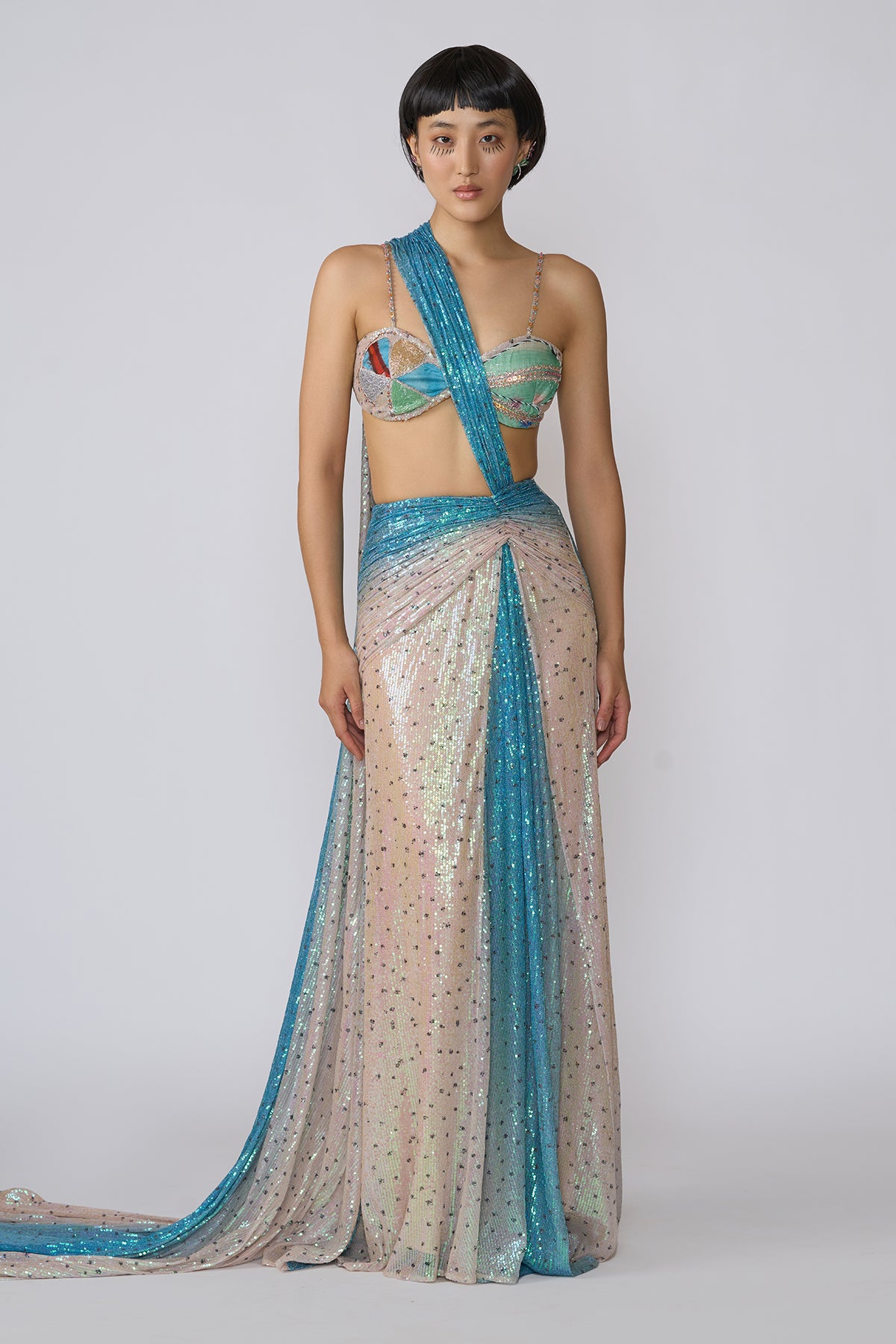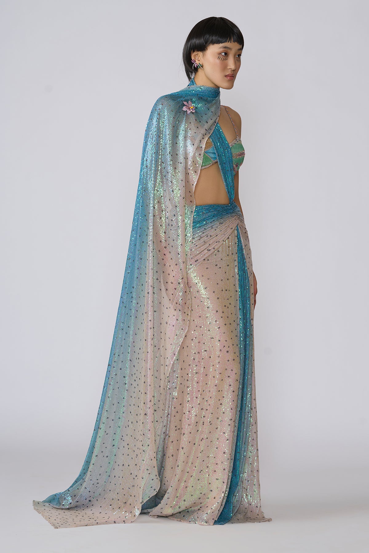 Kinfolk ivory blue ombre printed applique embellished sequin tulle blouse with cinched waist, draped saree