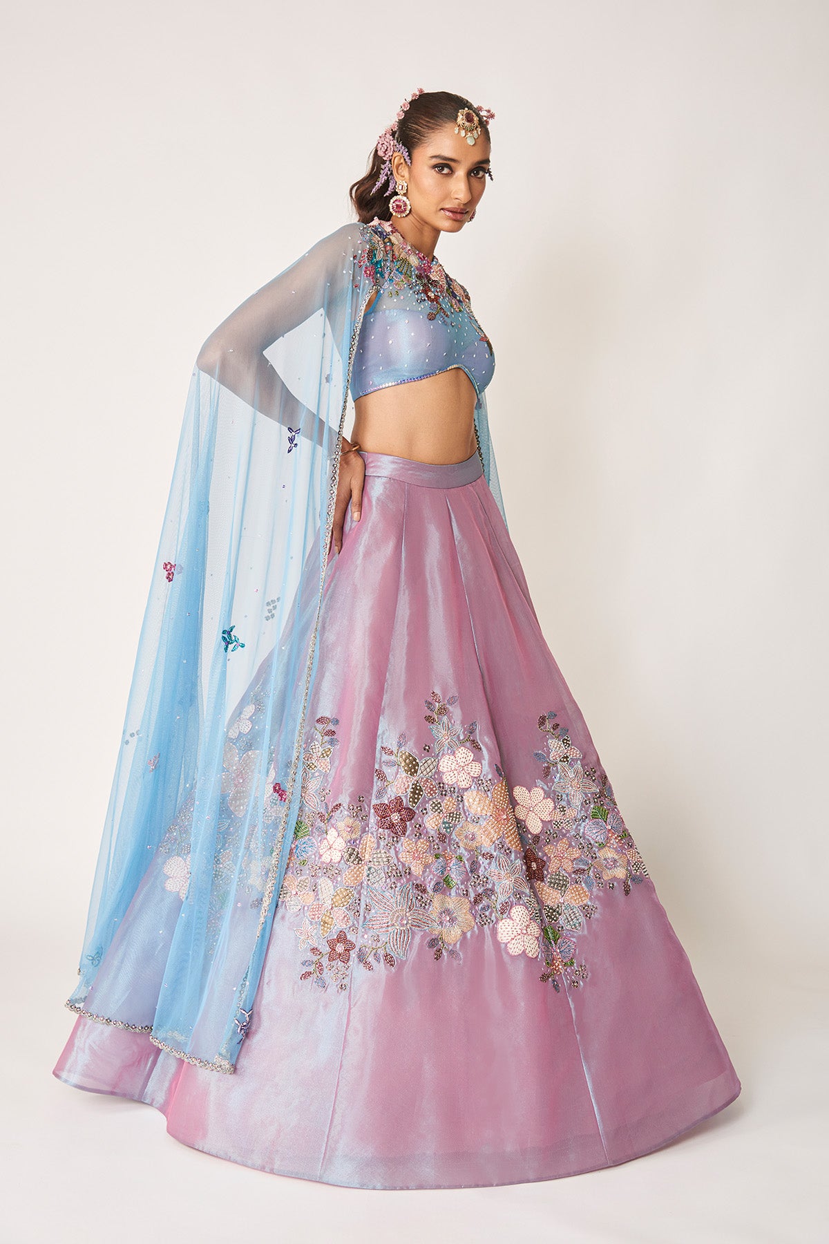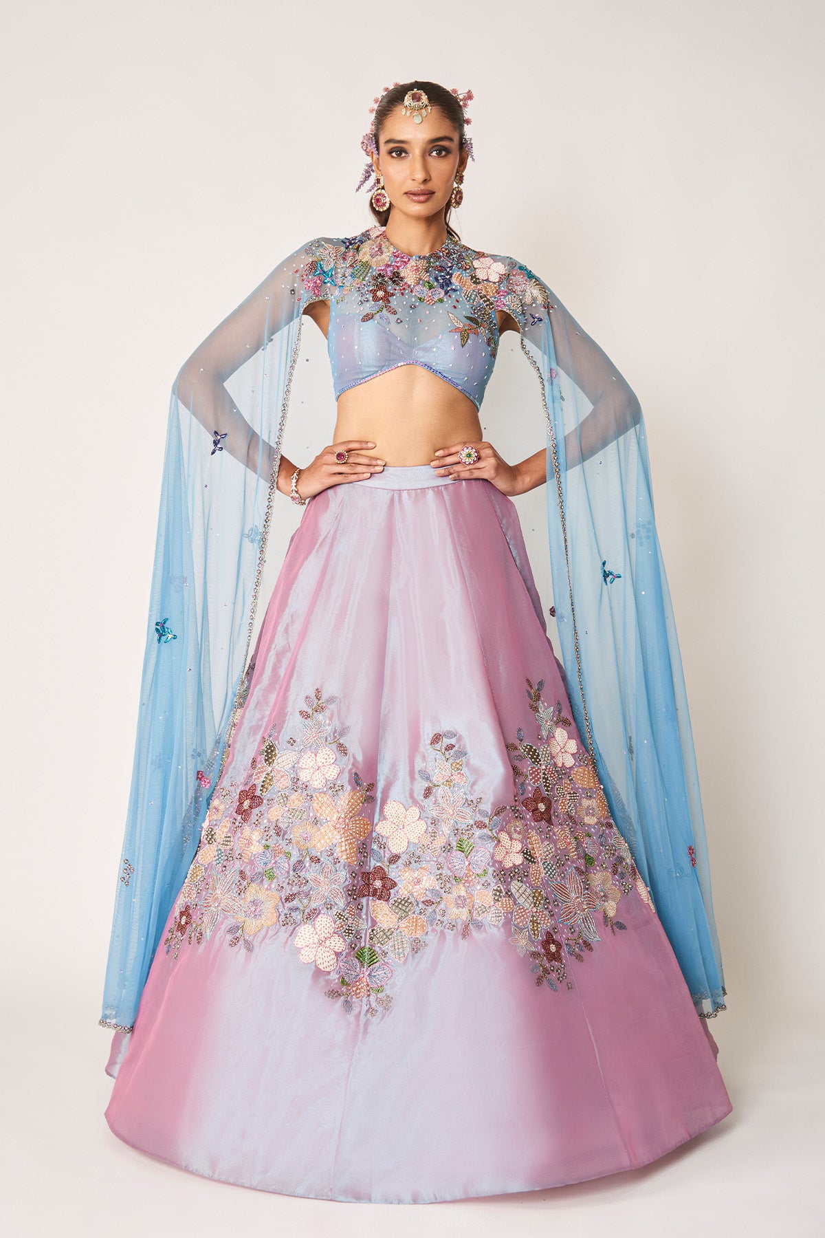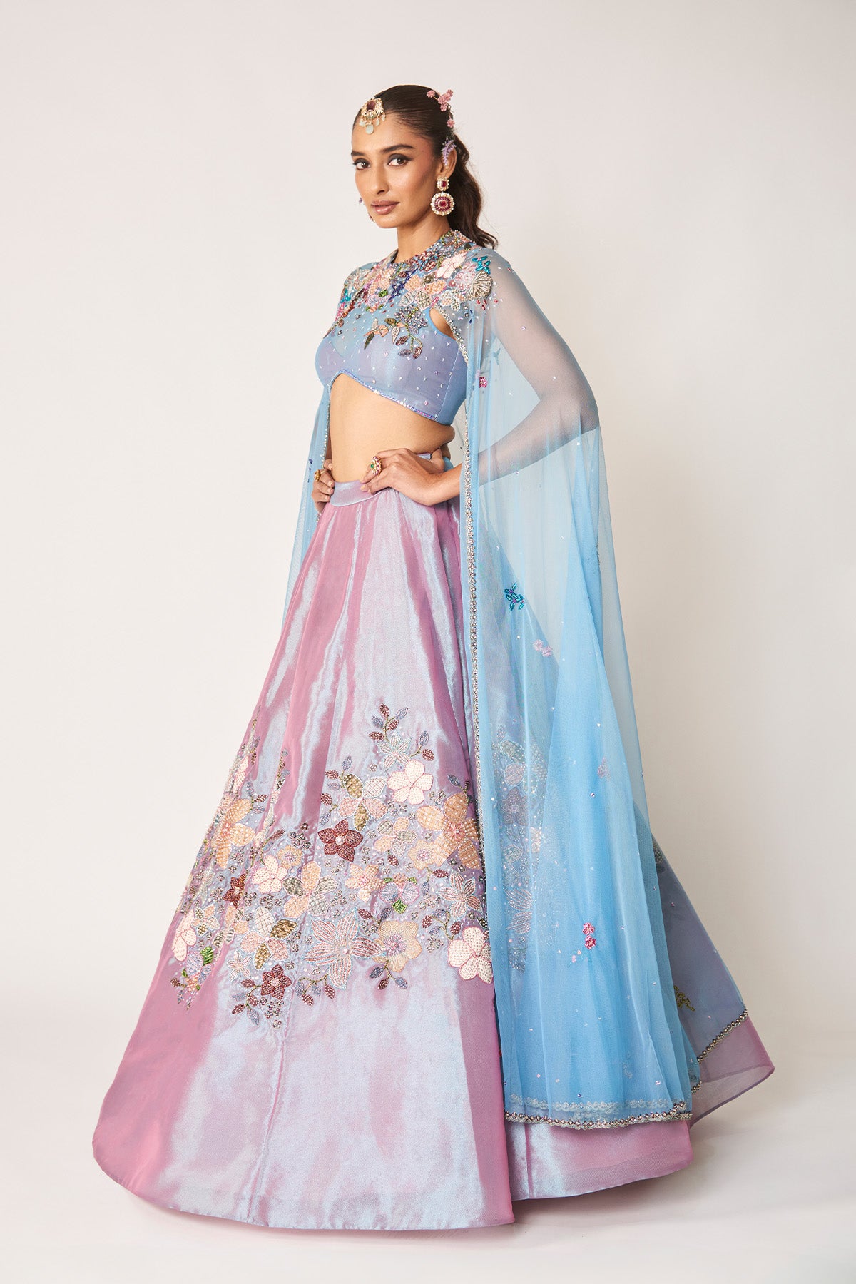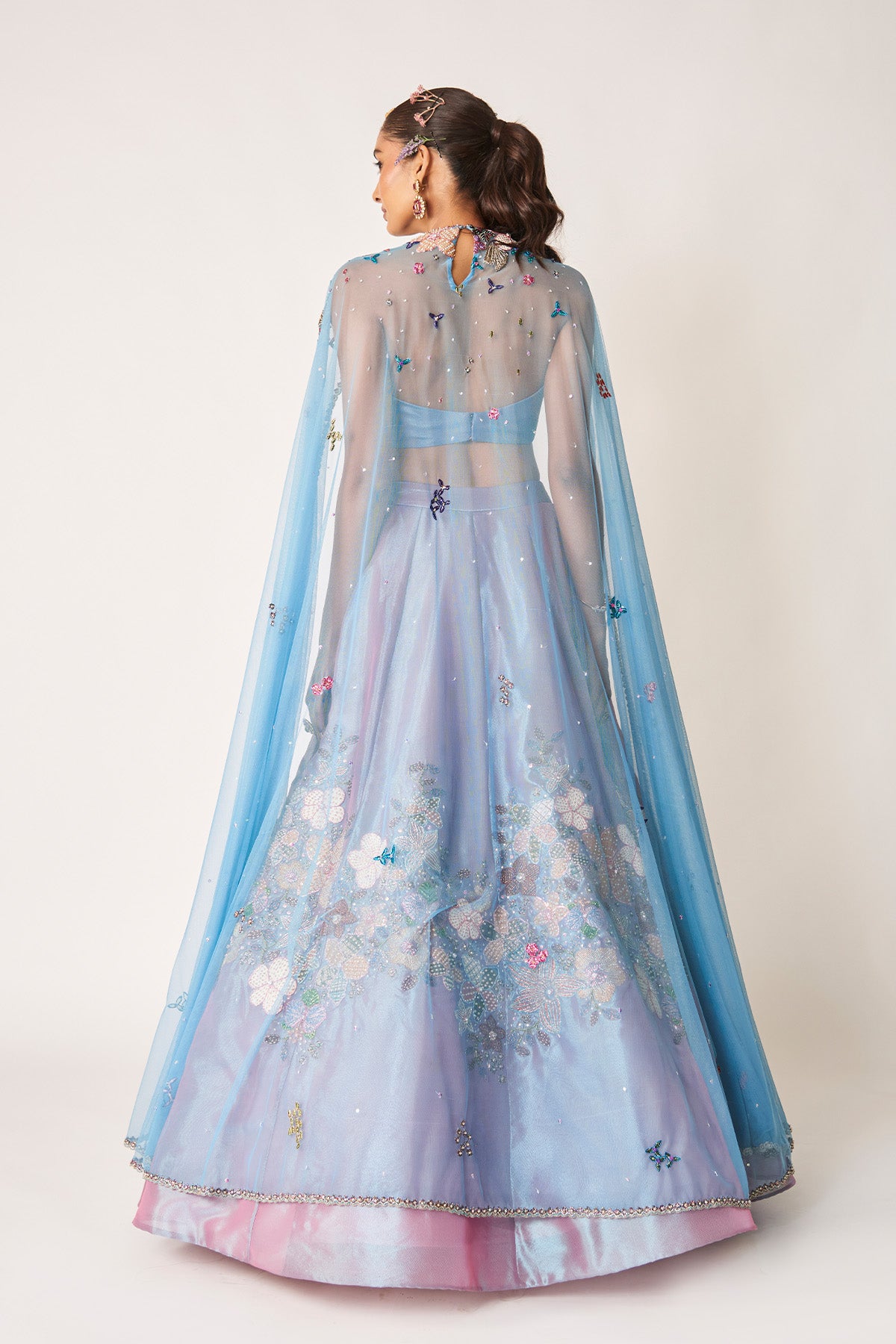 Matilda wisteria blue applique embellished tissue lehenga with a tulle cape blouse.