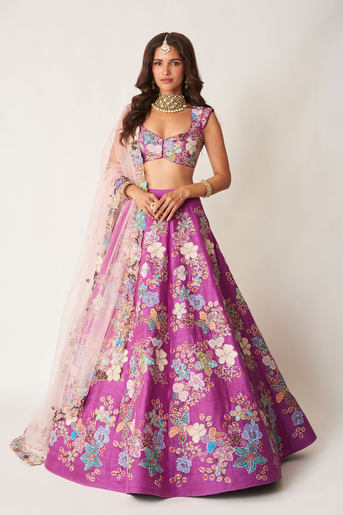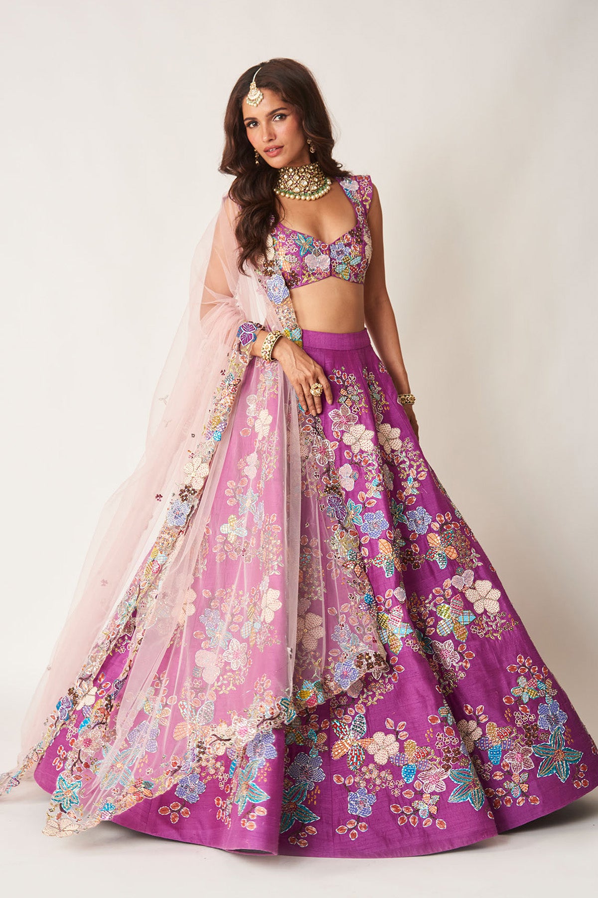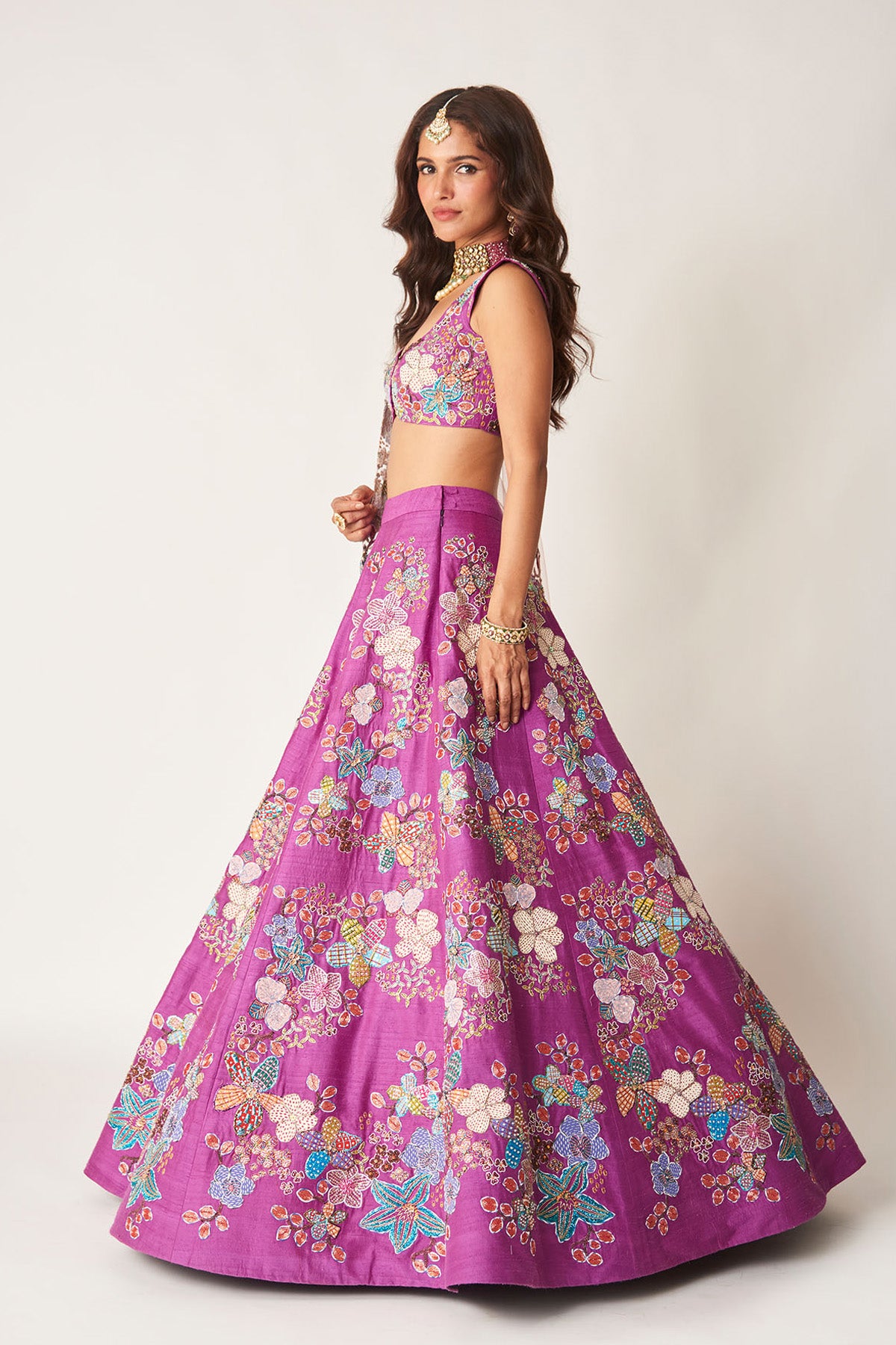 Matilda purple applique embellished raw silk VB lehenga with blouse & tulle dupatta.